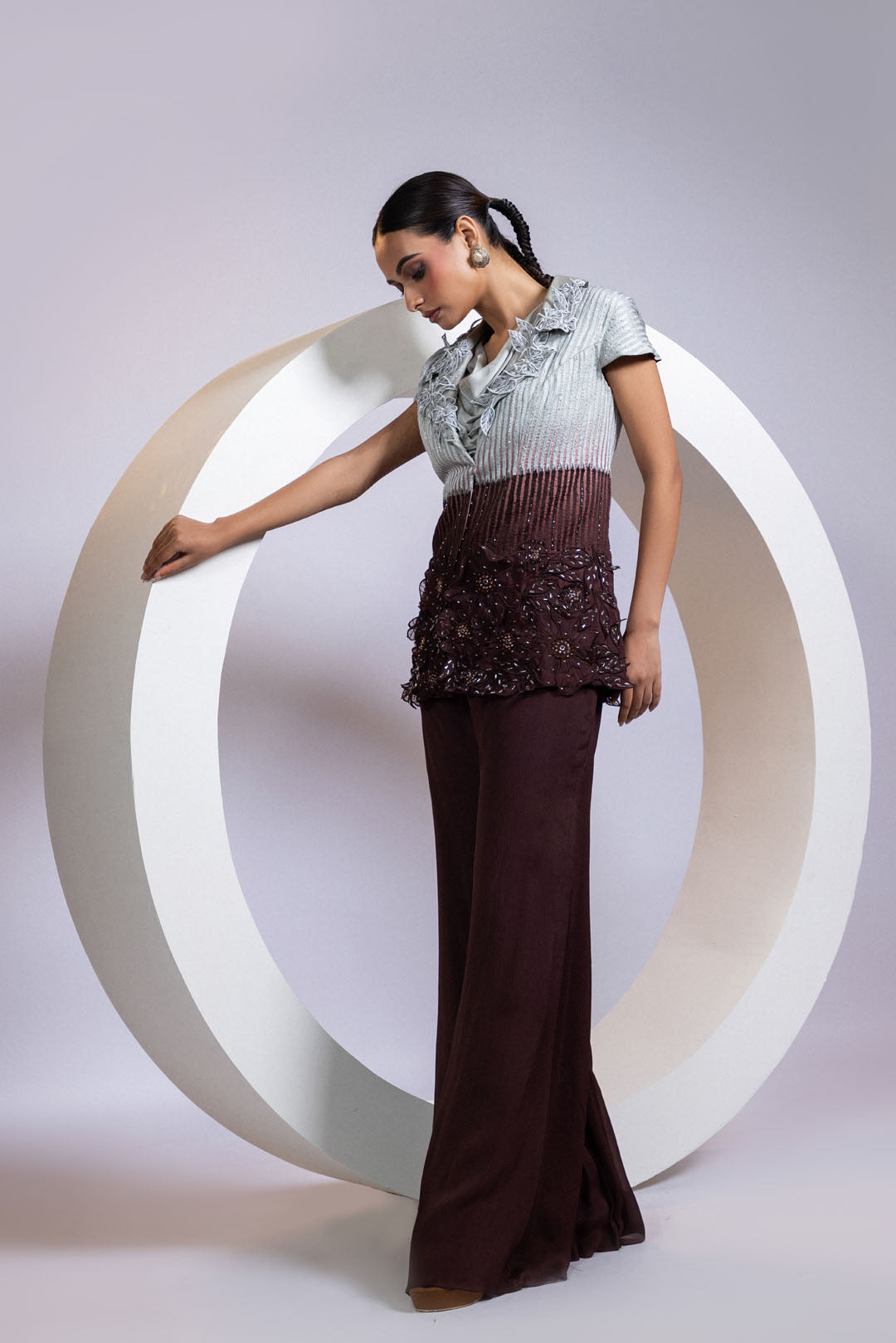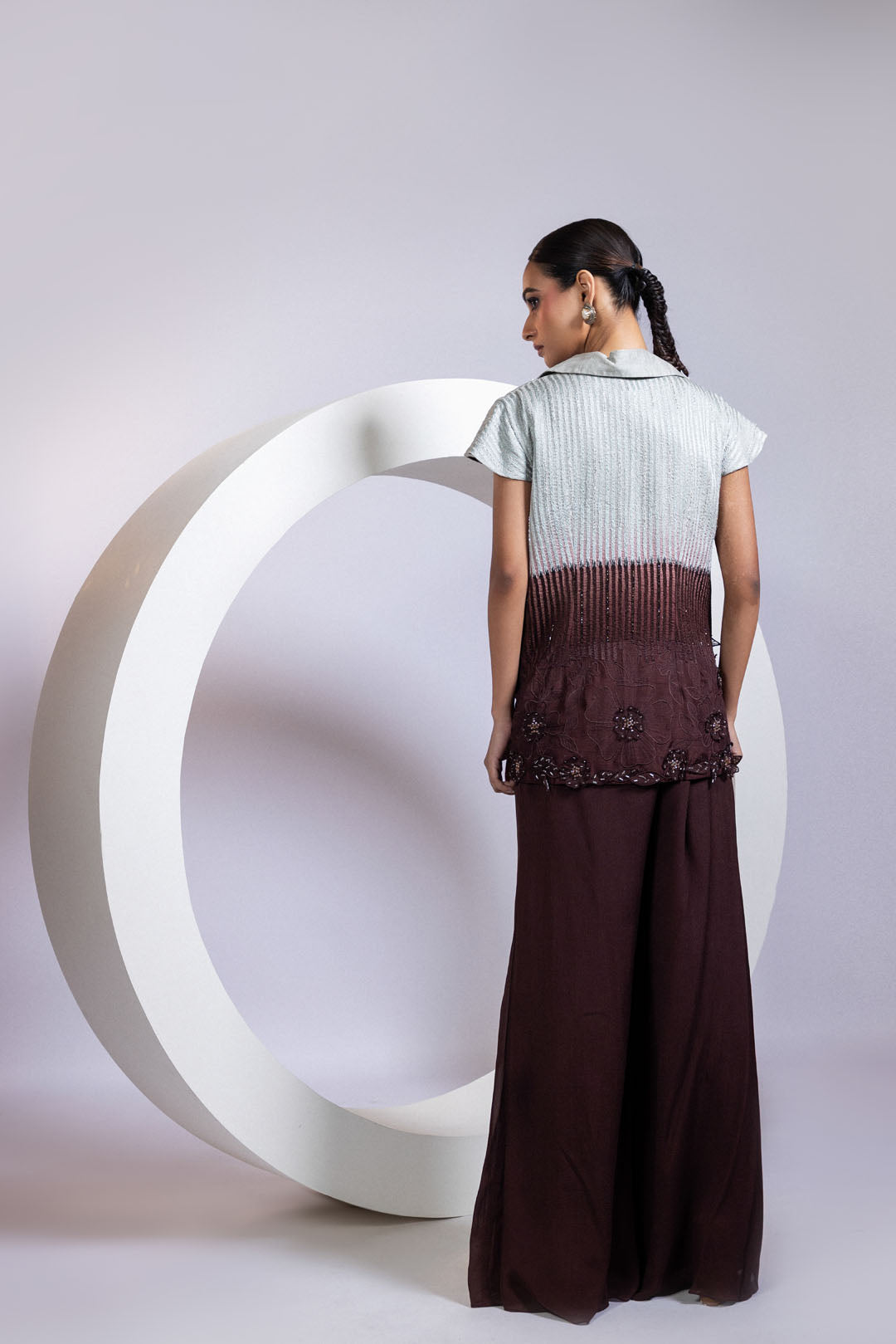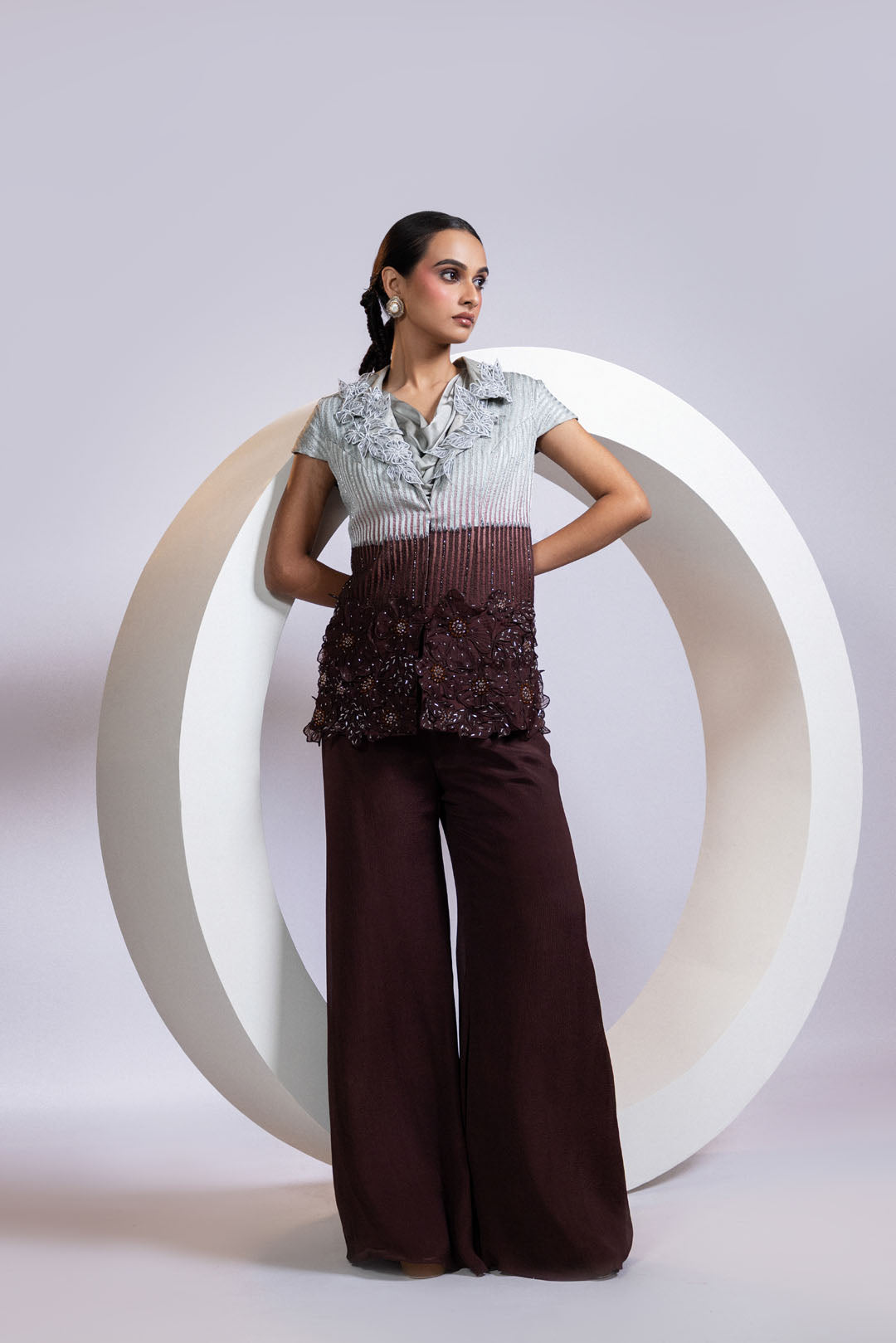 A three-piece coord set featuring a grey cowl top, flared brown pants, and an ombré jacket that fades from ivory to deep chocolate. The jacket is adorned with intricate 3D floral embroidery and appliquéd leaf-and-flower detailing along the neckline. Refined and textural—perfect for elegant gatherings and modern festive evenings.