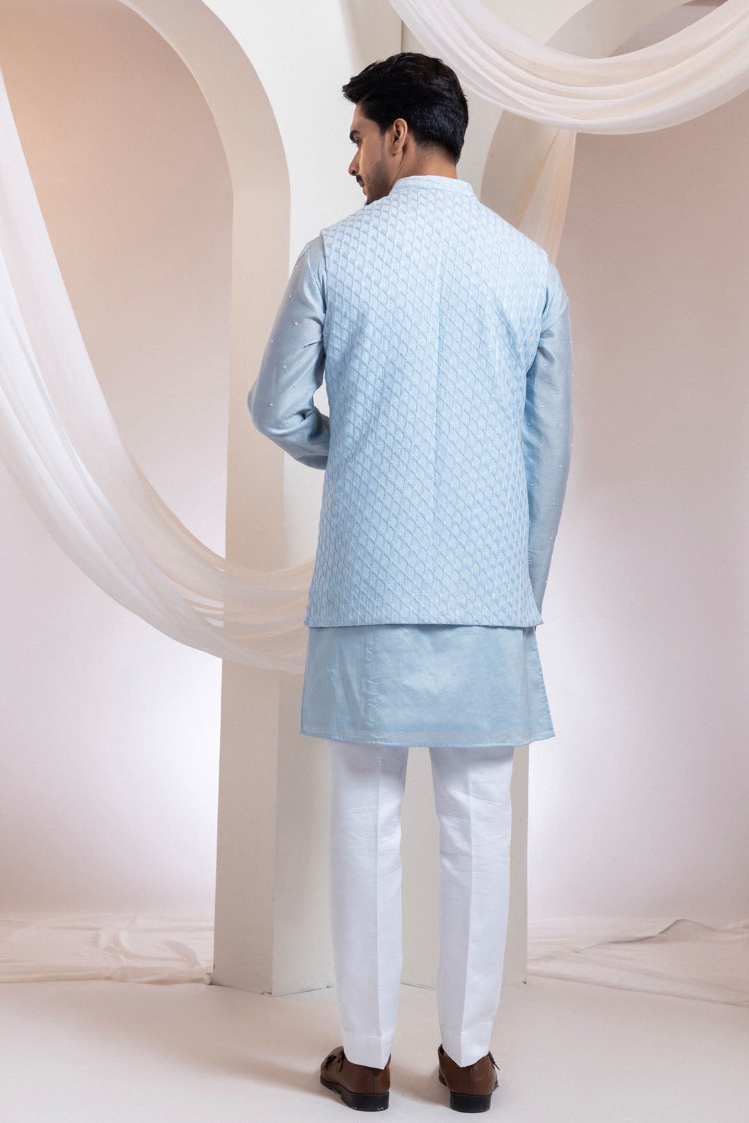 A curated ensemble combining a sky-blue Nehru jacket with diamond-textured thread and beadwork, paired with a coordinating kurta set detailed in delicate geometric stitches and subtle beading. The refined embroidery across both pieces creates depth, structure, and lightplay—echoing the brilliance of cut diamonds and the clarity of luminous threads. Ideal for day celebrations, spiritual gatherings, or formal daytime occasions, this set blends quiet grandeur with modern tailoring.