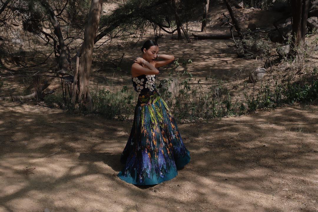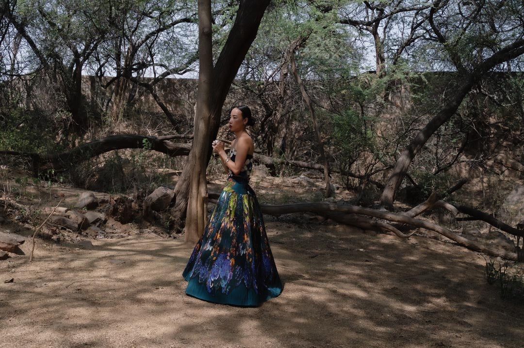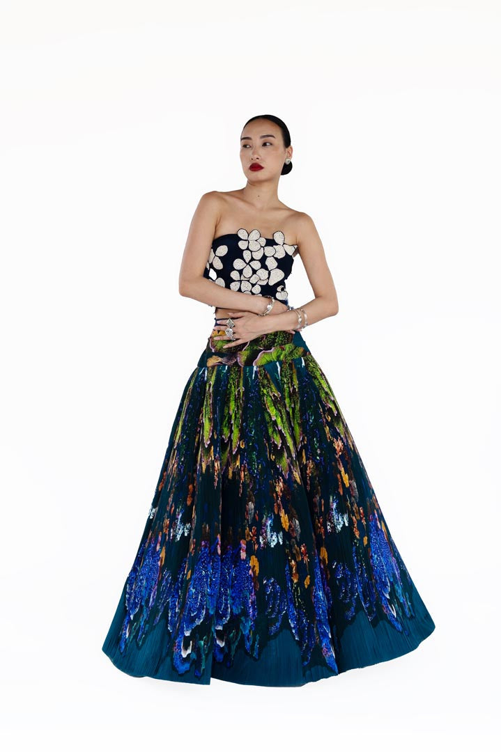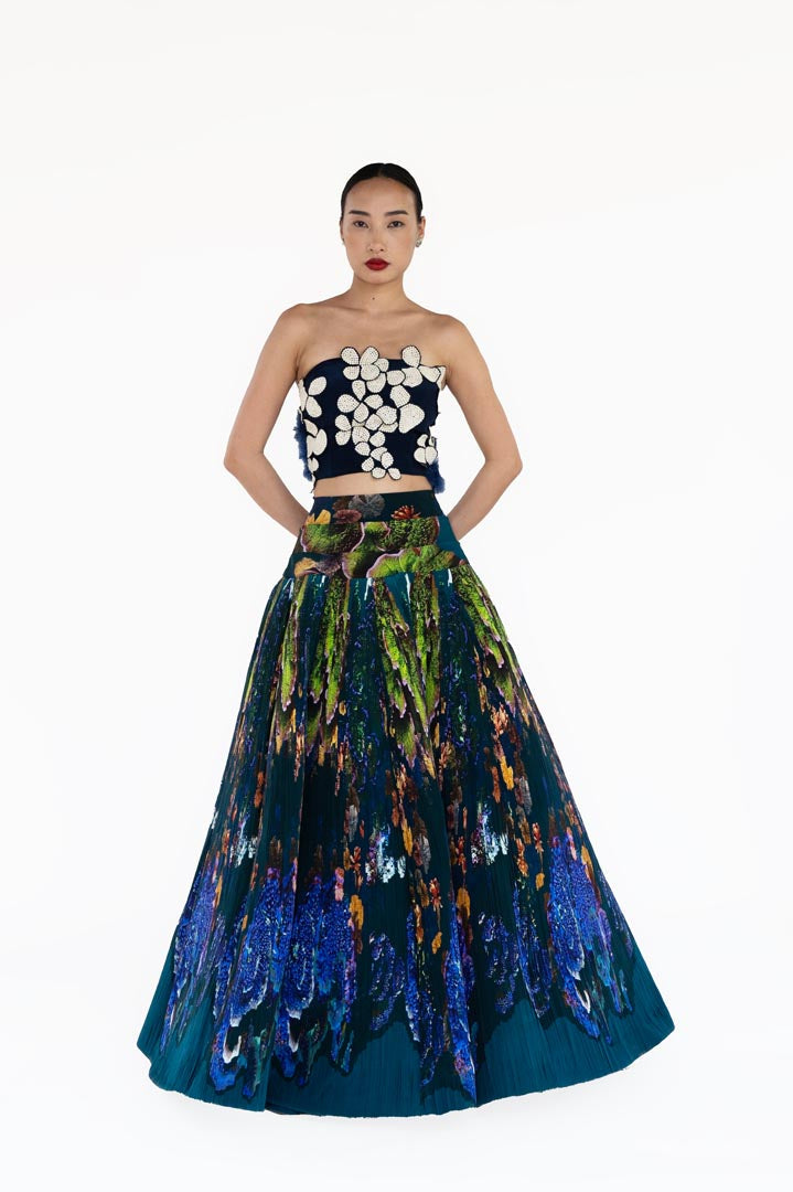 A marvellous hand embroidered flowers are made out of handplucked curation picked from the tree of beads and later hitched with blue mosaic landscape printed skirt