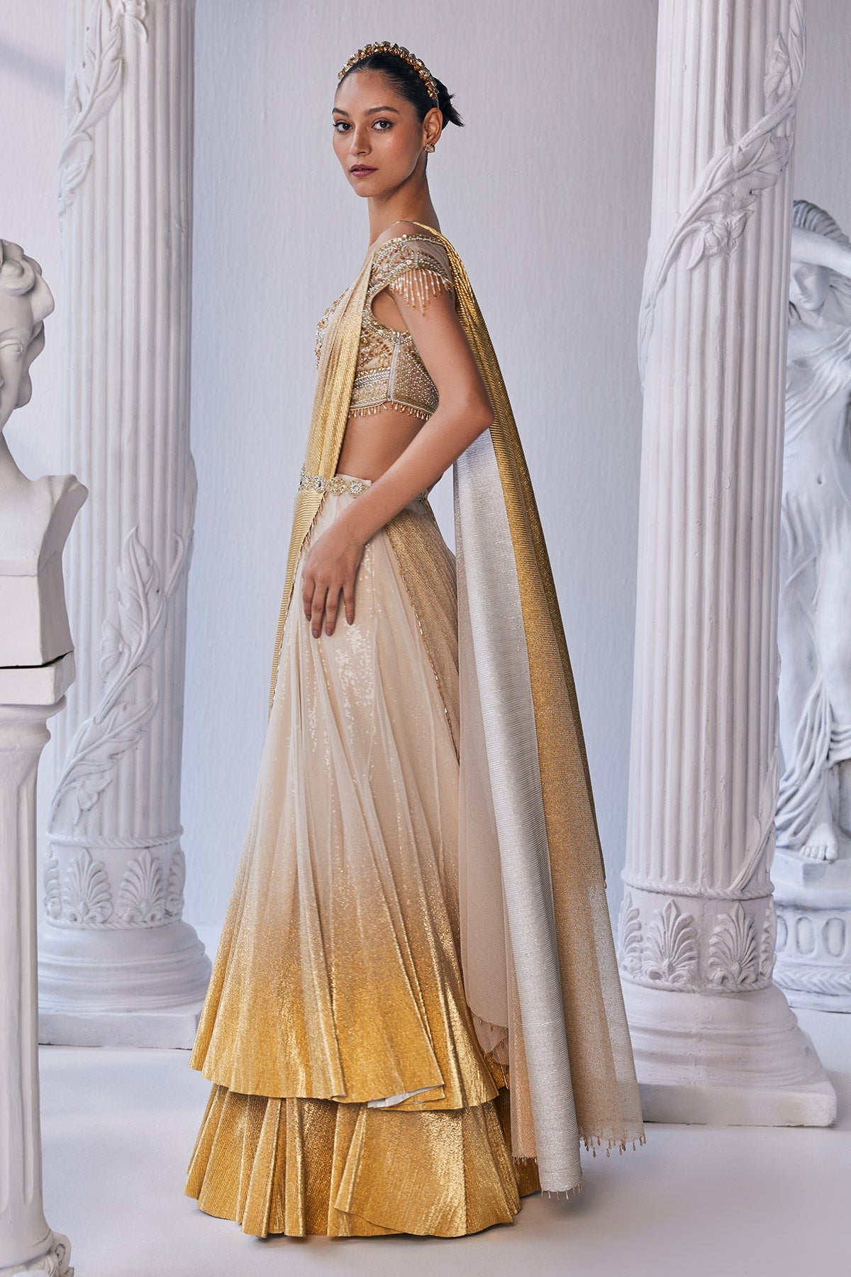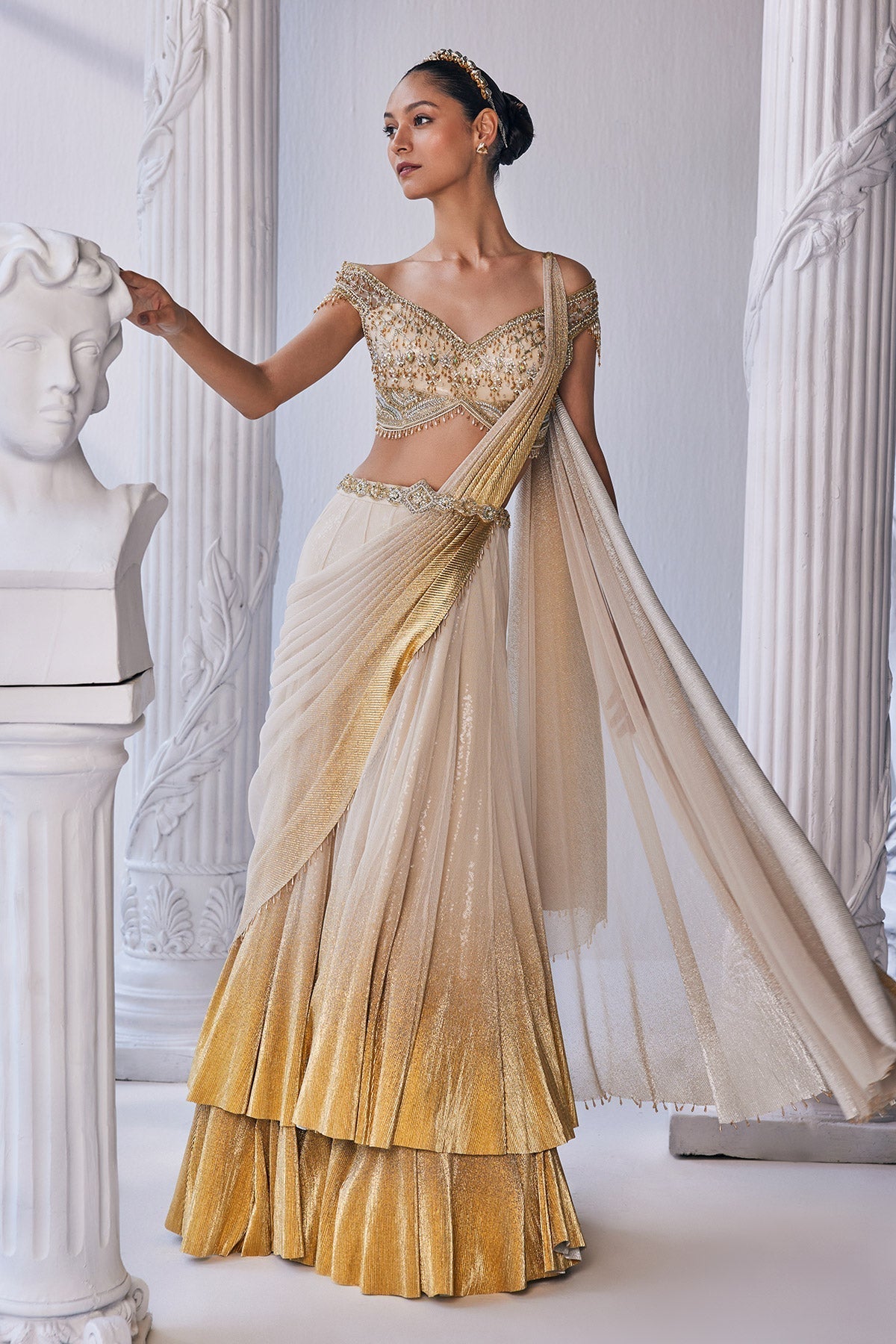 A double layer lehenga crafted from pleated gold foil lycra. The shimmering fabric catches the light effortlessly, while the embroidered waistband adds a touch of opulence. Paired with a stunning corset, this ensemble strikes the perfect balance between traditional and contemporary fashion.