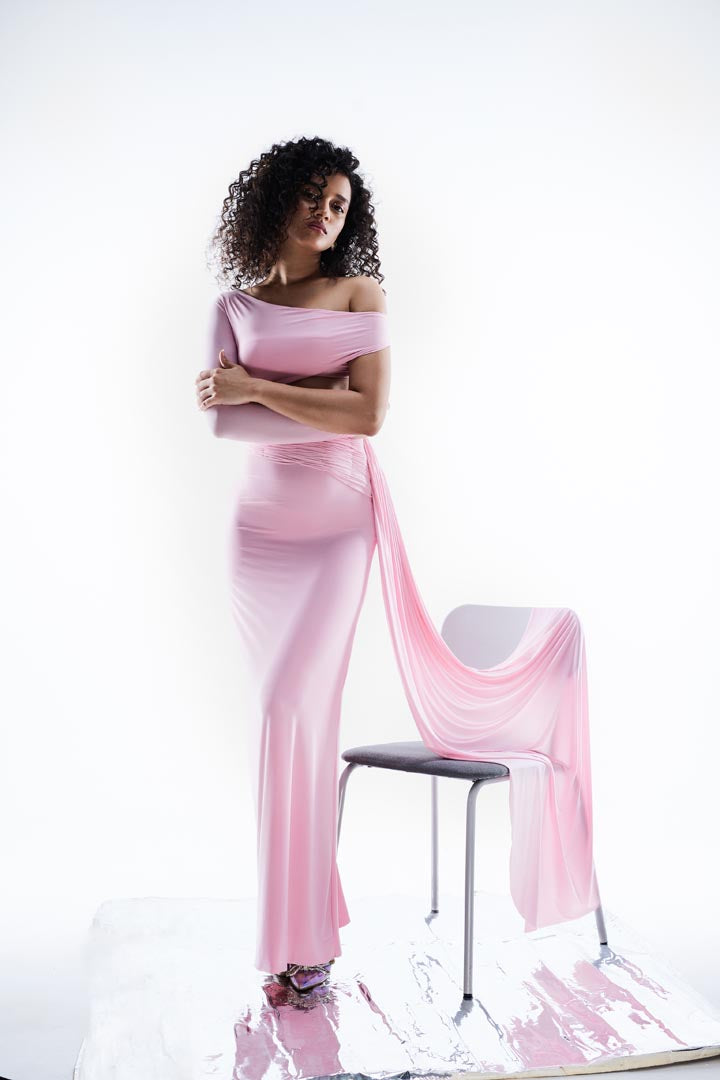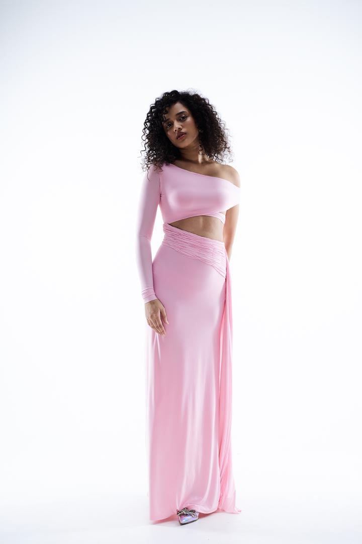 Discover our pretty pink dress, a versatile piece perfect for any occasion from sundowners and baby showers to weddings, brunches, special celebrations and vacations. Featuring a beautifully gathered bodice with a one-shoulder neckline and a chic one sided design, this dress is crafted from luxurious draped lycra material. Combining a body-hugging fit with an elegant flow hem.