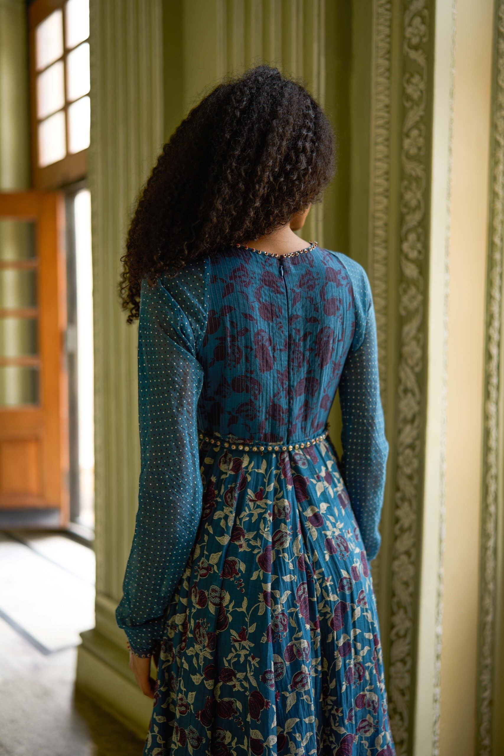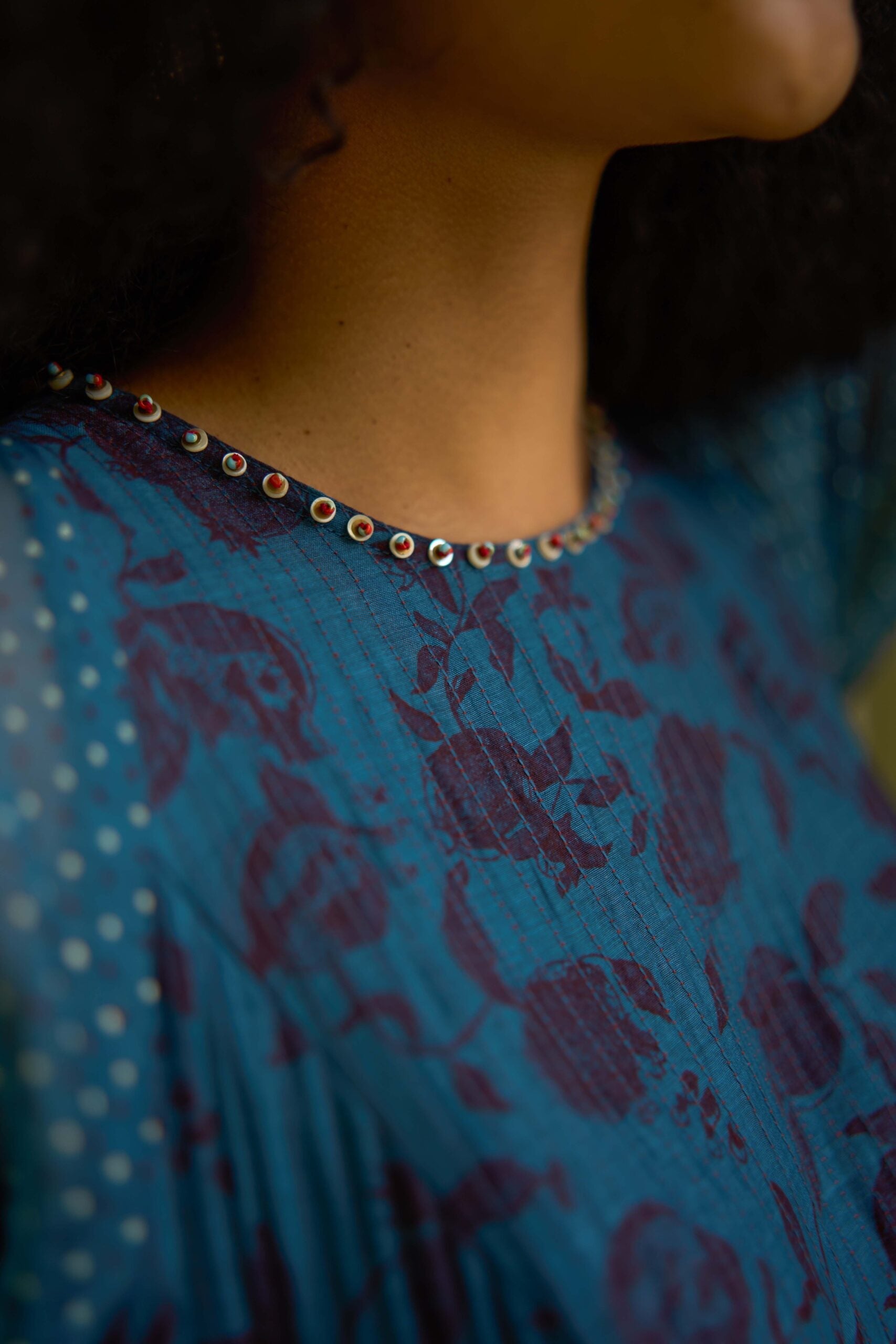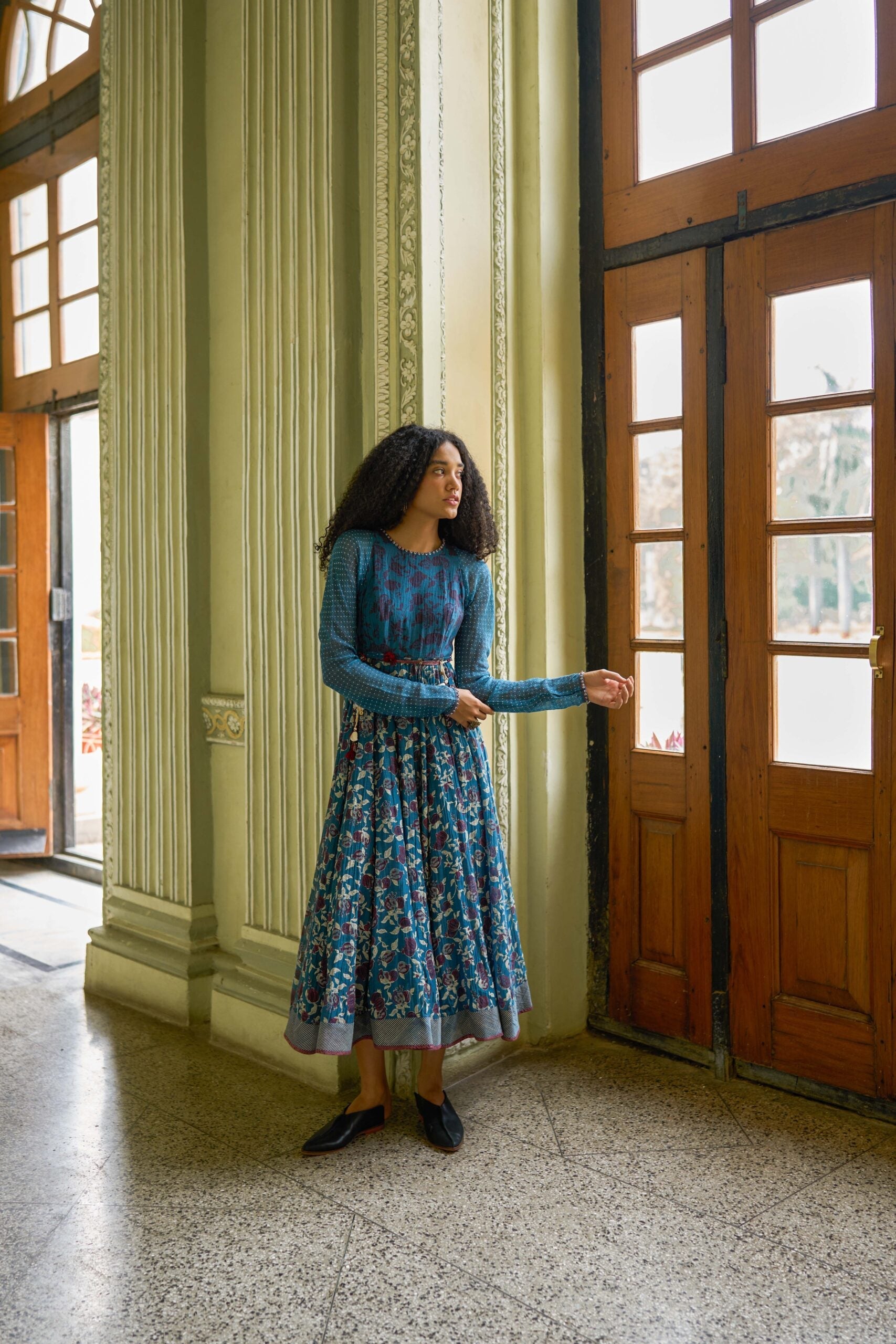The Elliot Dress by Swatti Kapoor is a poetic blend of artisanal tradition and contemporary elegance. Handcrafted in luxurious handwoven Chanderi, this dress is elevated with age-old hand block printing and a quilted bodice adorned with delicate hand-beaded embellishments. A hand-braided belt, finished with tassels and artisanal accents, cinches the waist to create a refined silhouette. Designed in an enchanting shade of blue, the Elliot Dress evokes timeless grace, offering a look that is both effortless and statement-making—ideal for those who appreciate craftsmanship with modern ease.