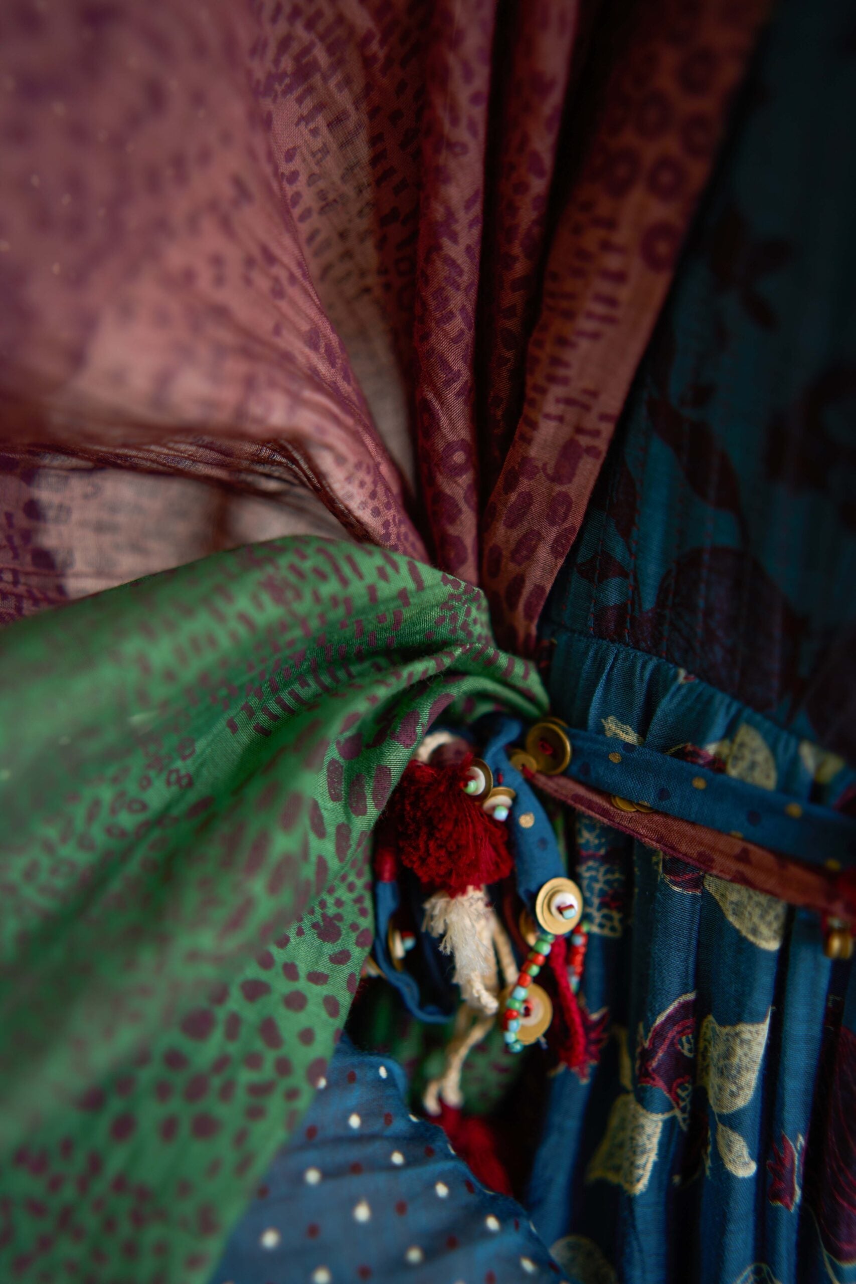 - Details: Hand block printed motifs, hand-beaded accents, and braided tassel belt