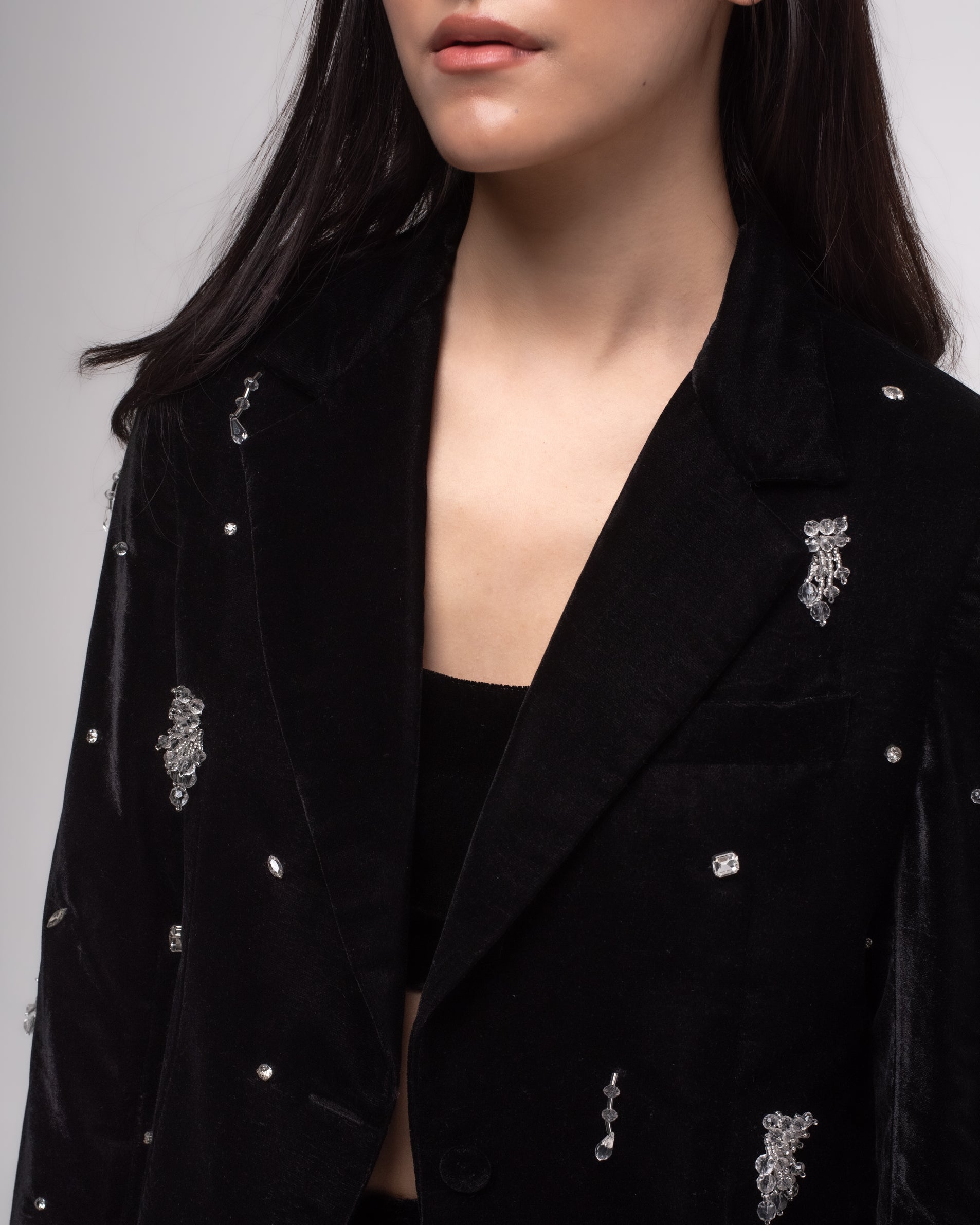 The statement piece blazer is made with pure silk velvet and hand-embroidered using silver rhinestones, crystal drops and beads.