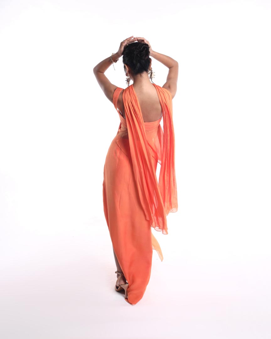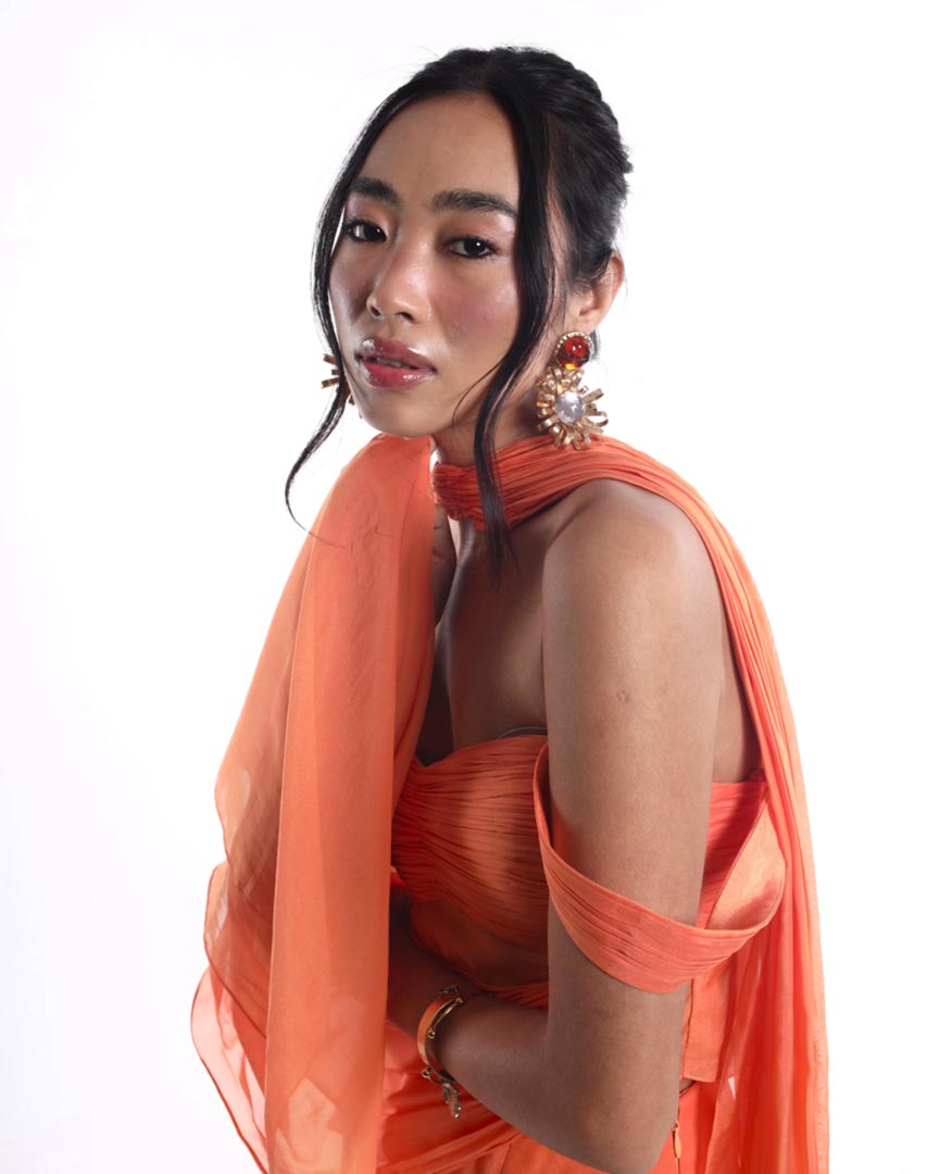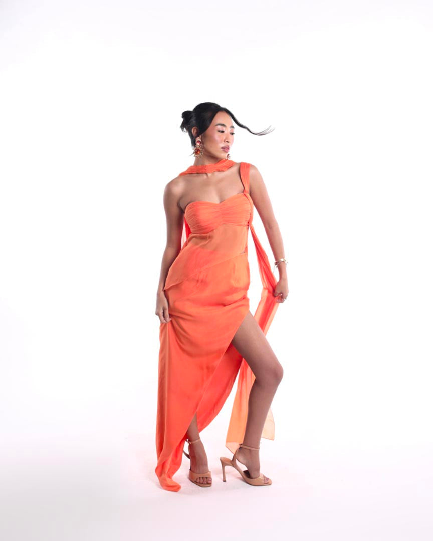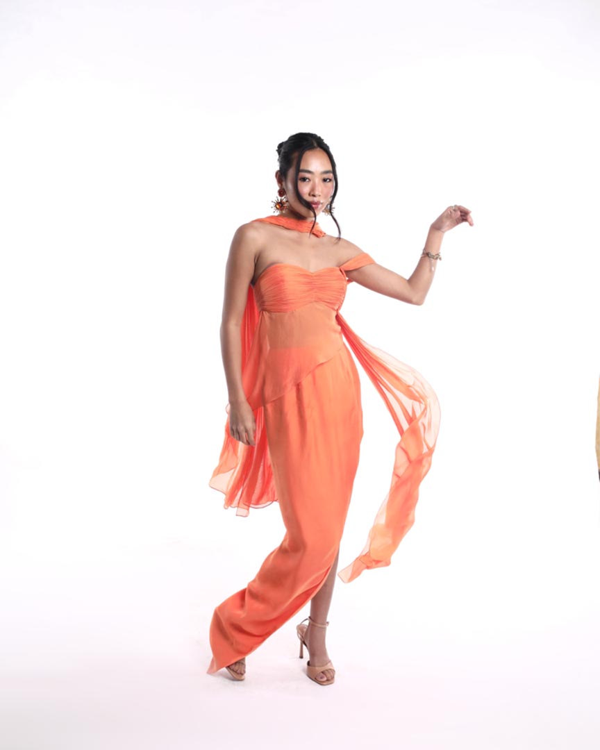The Ember set is a breezy, sultry silhouette made in a lightweight, semi-sheer fabric that flows effortlessly with every step. Featuring a gathered sweetheart neckline, asymmetric draping, and a bold thigh-high slit, equal parts elegance and heat. The matching stole adds a dramatic, ethereal edge, perfect for channeling goddess energy.