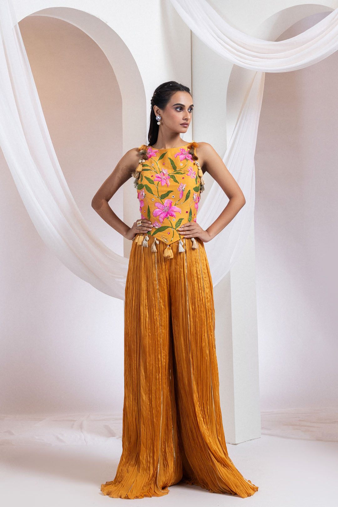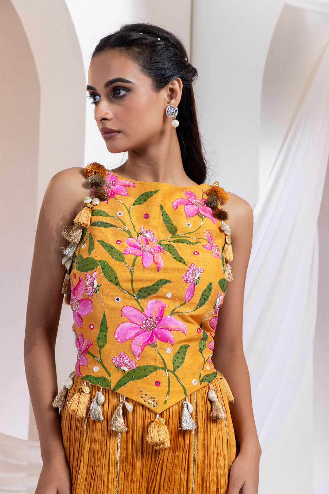A vibrant two-piece set evoking the spirit of spring in full flourish. The structured corset top is hand-painted with lush pink and green florals, enhanced with sequins, beads, and delicate mirror work. Shell and tassel embellishments add a bohemian charm, while the flared ruched pants complete the free-spirited silhouette. Crafted in a rich rust-tangerine hue, this ensemble blends forest romance with effortless ease.