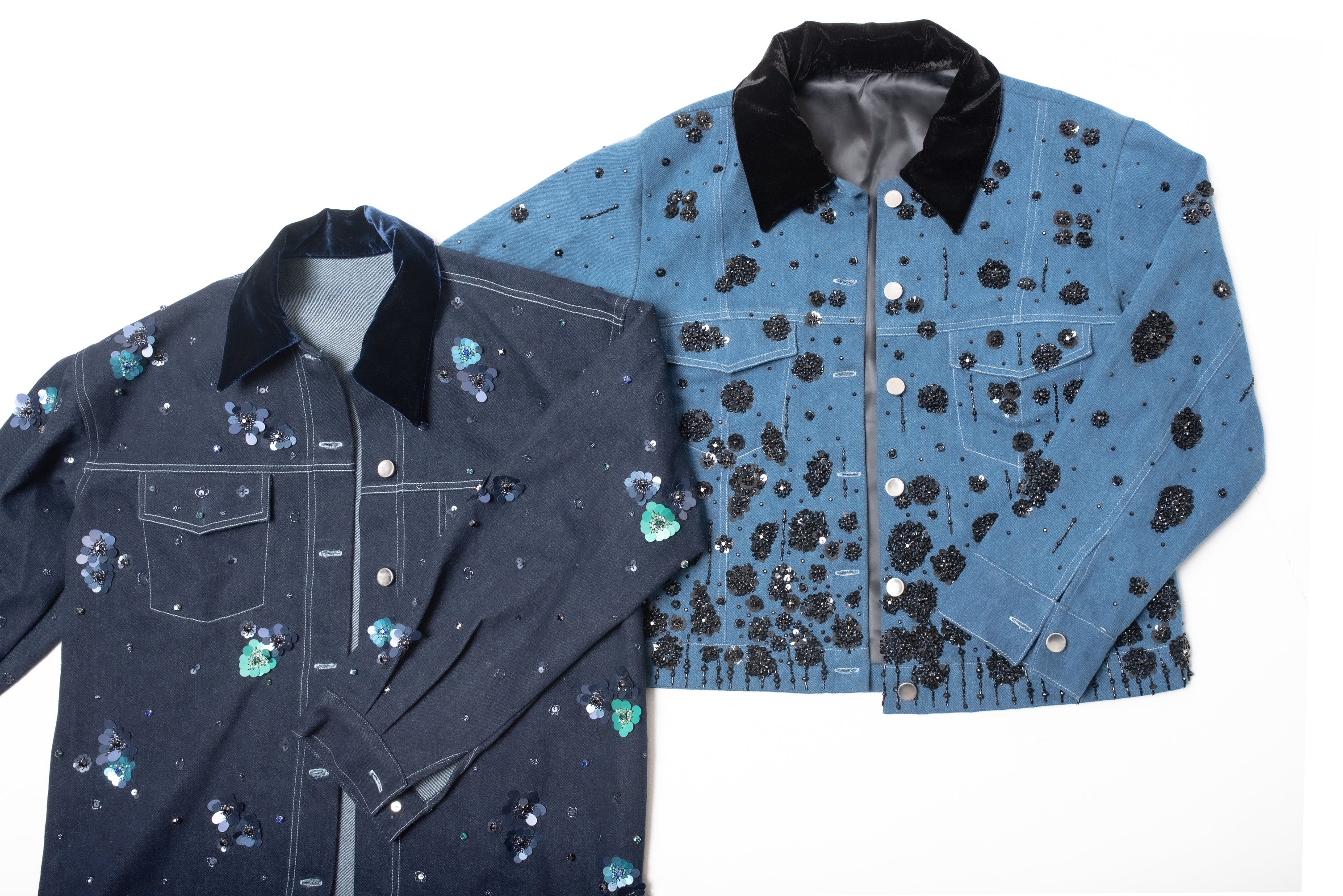 The jacket features black sequin, beads and rhinestone embellishing done by hand all over the front and back. The velvet collar further adds an element of statement to the piece.