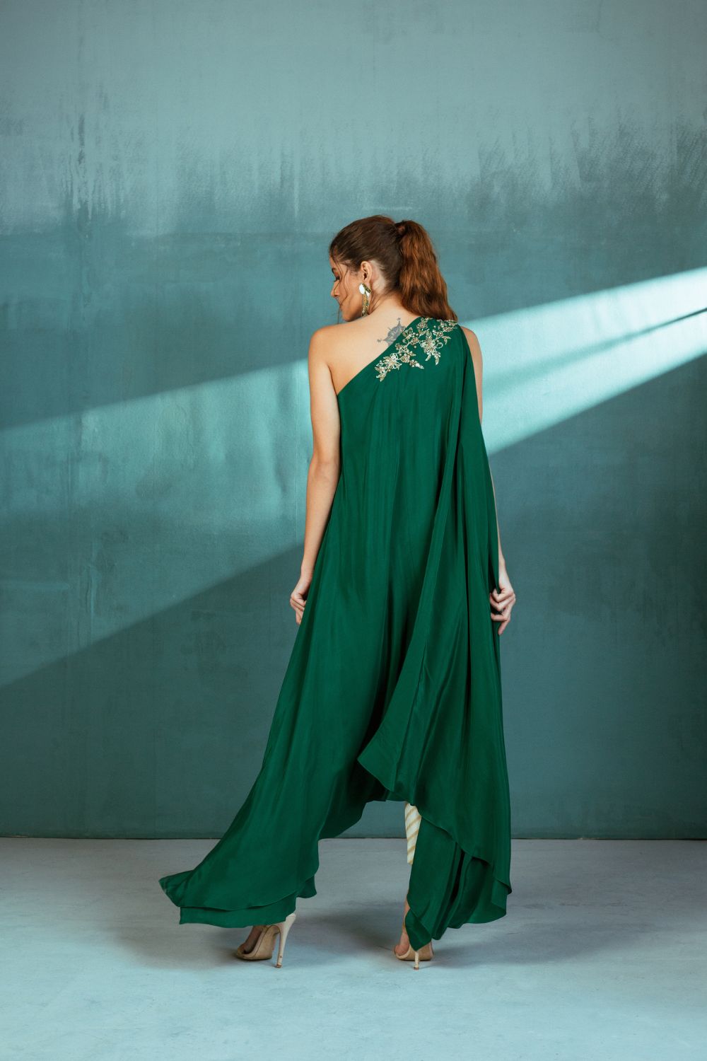 The rich emerald green color of the kaftan exudes vibrancy and allure, while the one-shoulder design adds a touch of modernity and elegance. The intricate embroidery elevates the ensemble to a whole new level of grandeur.