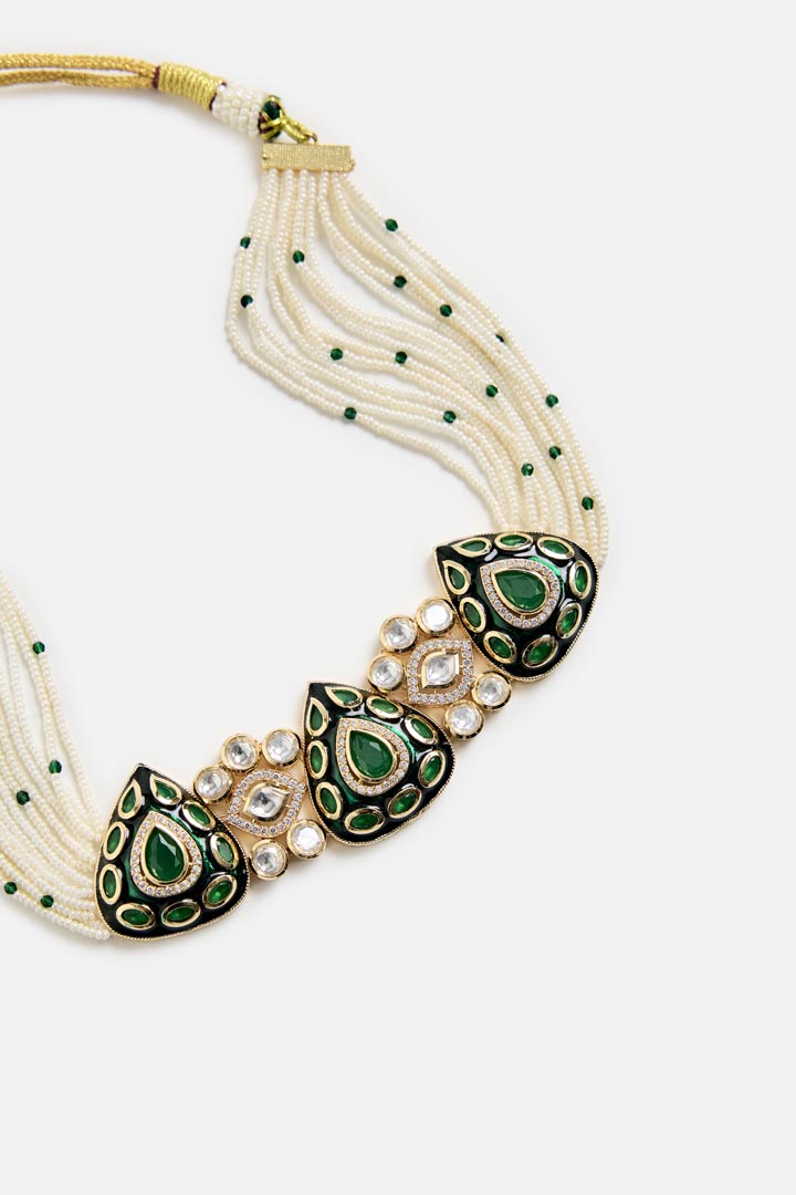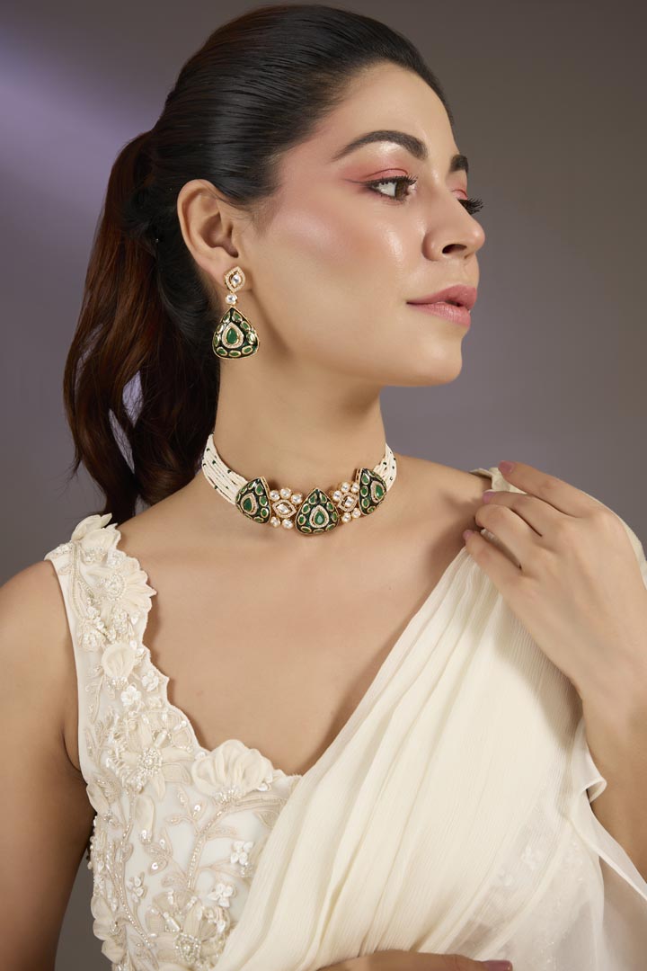A regal emerald stone choker set featuring dazzling Kundan work and matching earrings. Perfect for weddings and festive occasions, this piece adds a touch of grace and royal charm to any look.