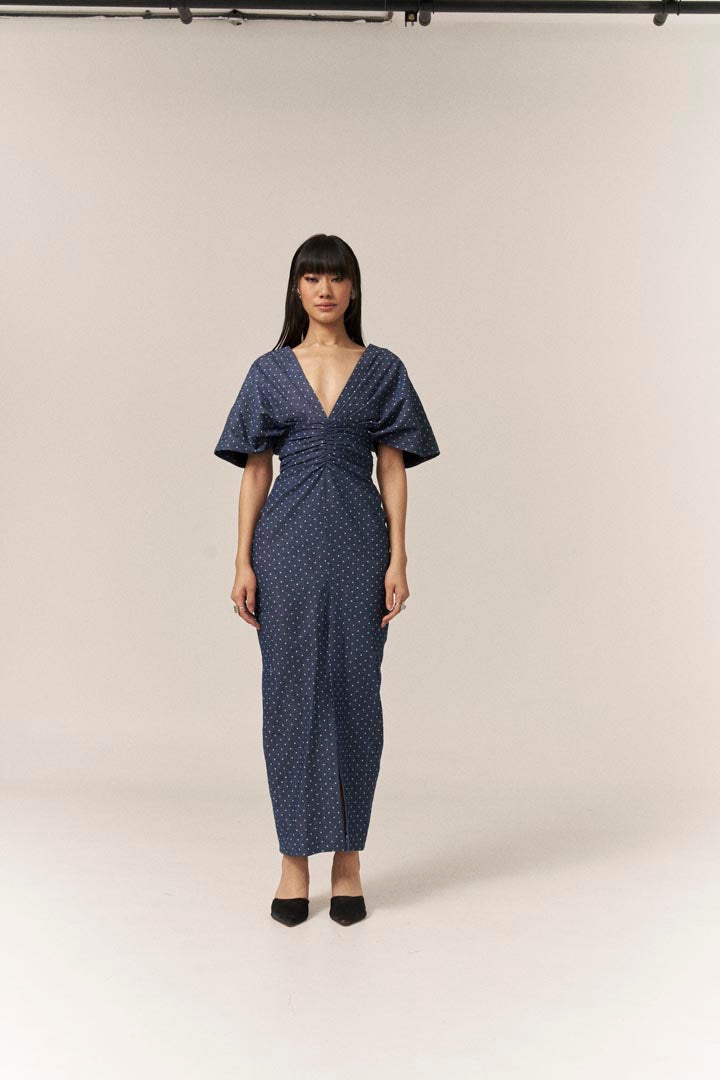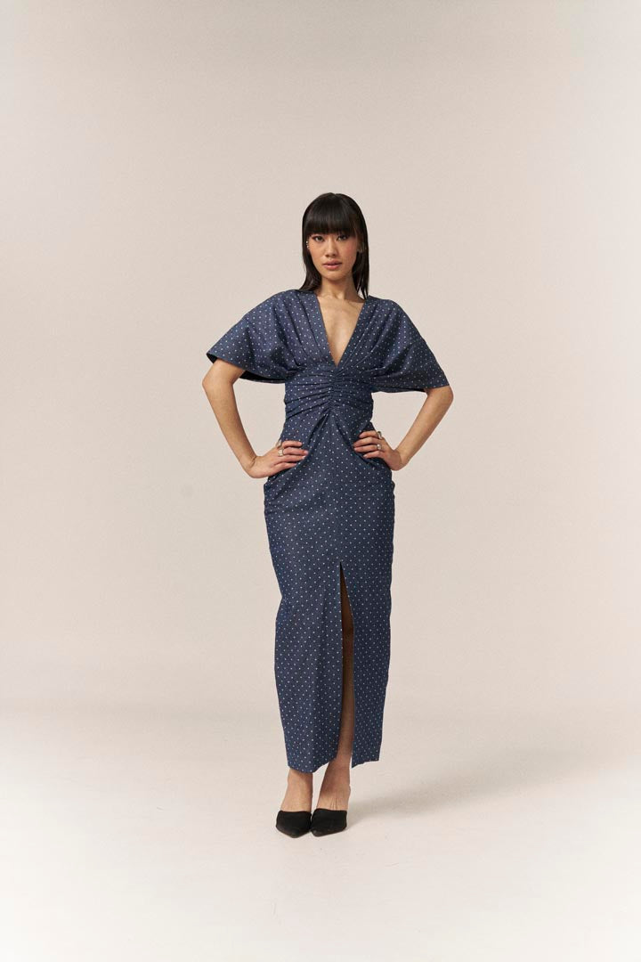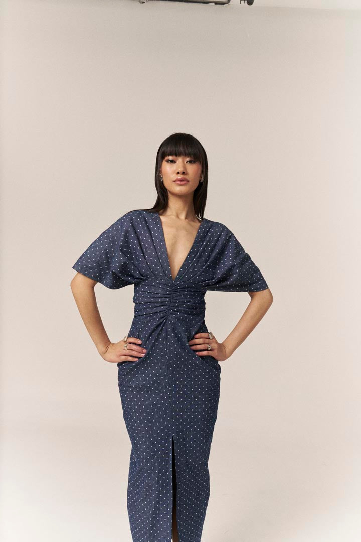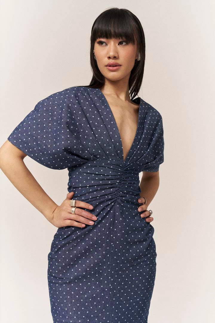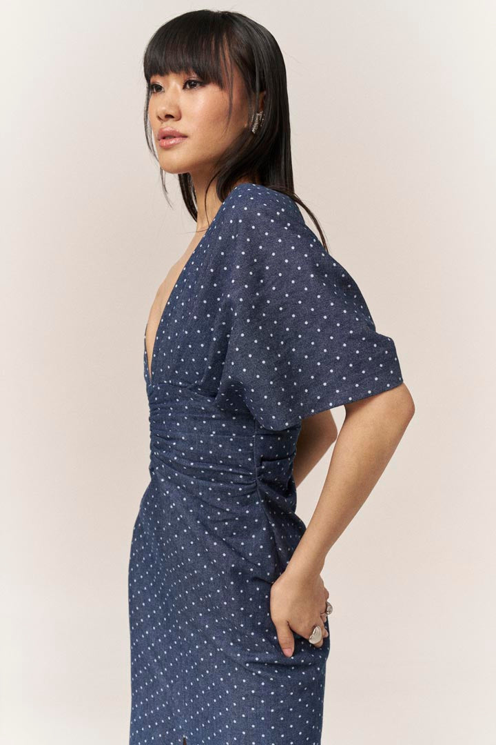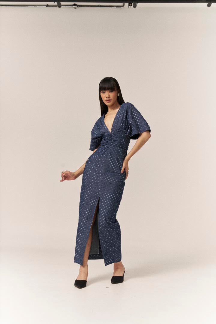 Elevate your wardrobe with our enchanting polka dot denim dress, a stunning blend of style and sophistication. Tailored to accentuate your waist, this dress features a captivating twisted front and a chic front slit hem, ensuring you make a memorable impression at baby showers, birthdays, brunches, garden parties, and more.