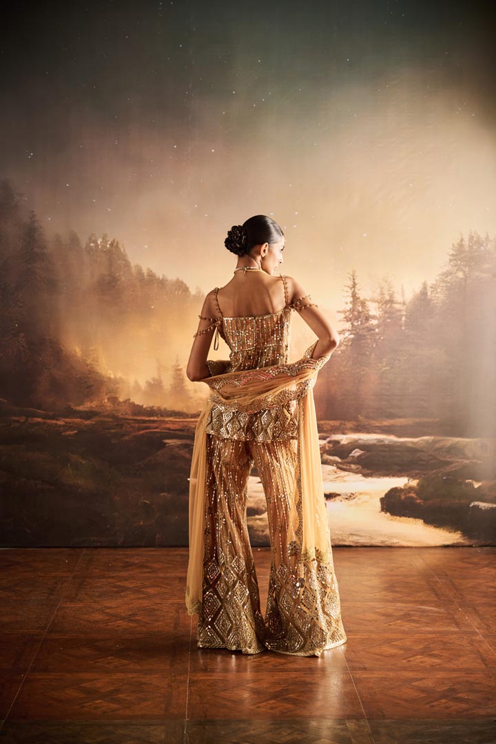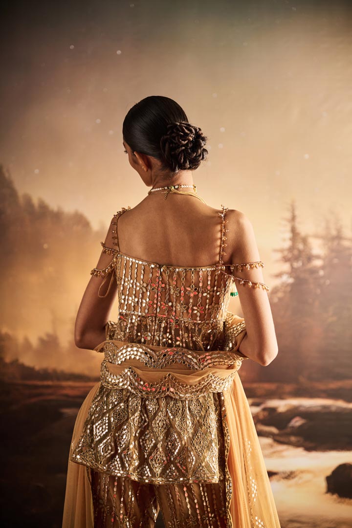 This strapless tube-style peplum top is crafted to accentuate the neck and shoulders, featuring mirror embellishments for a luxurious finish. Paired with flowy wide legged sharara pants, the ensemble offers a flattering balance of form and fluidity.