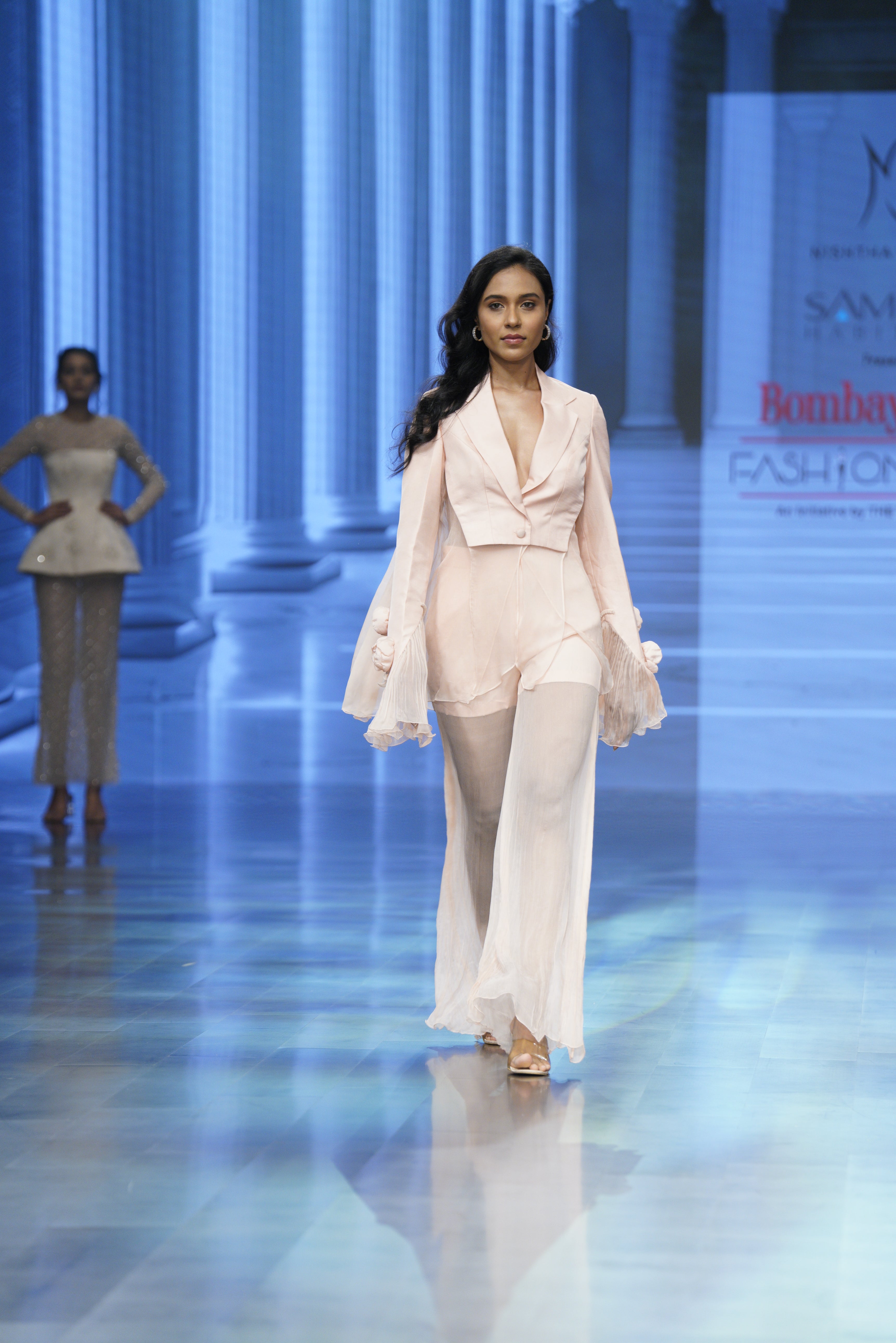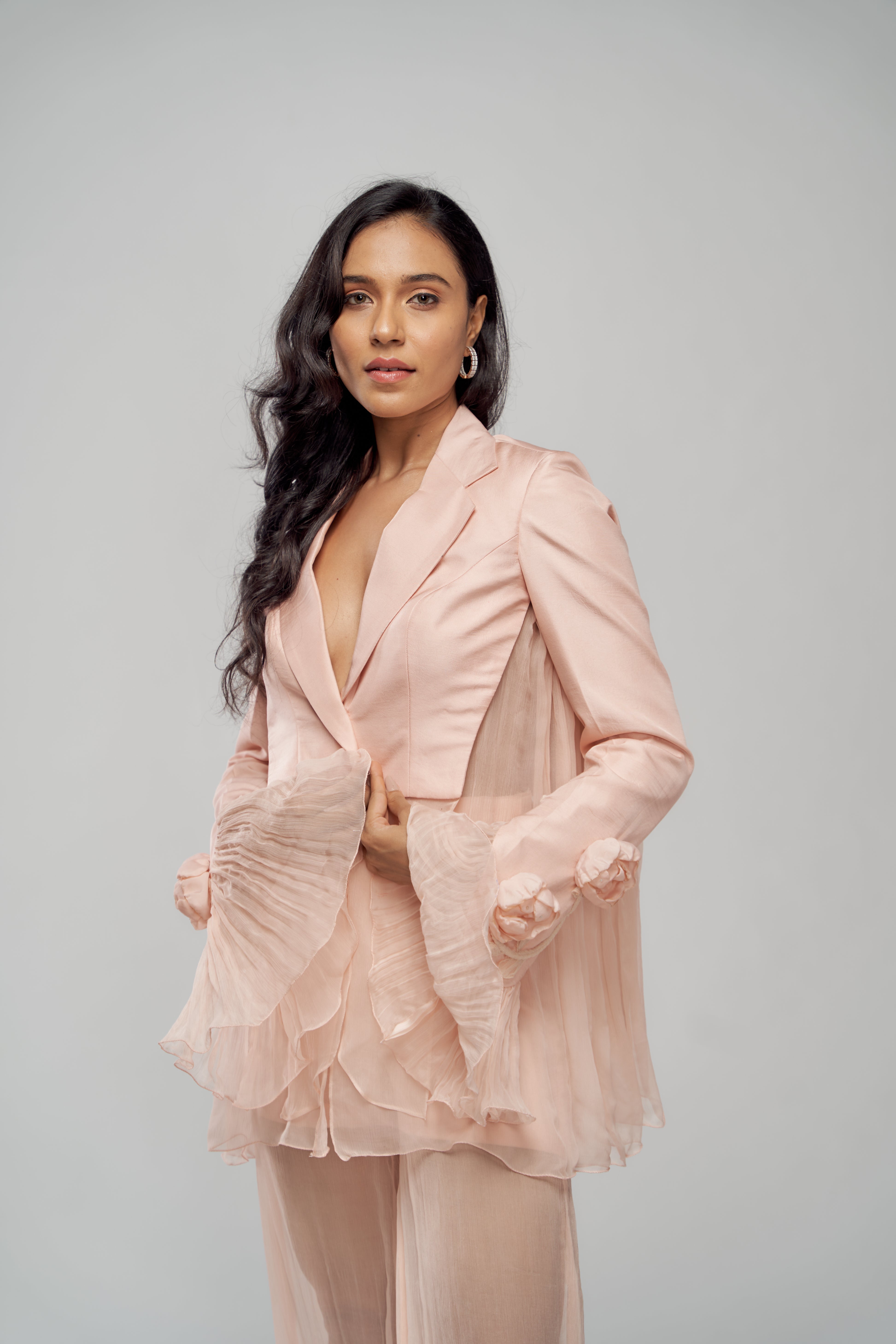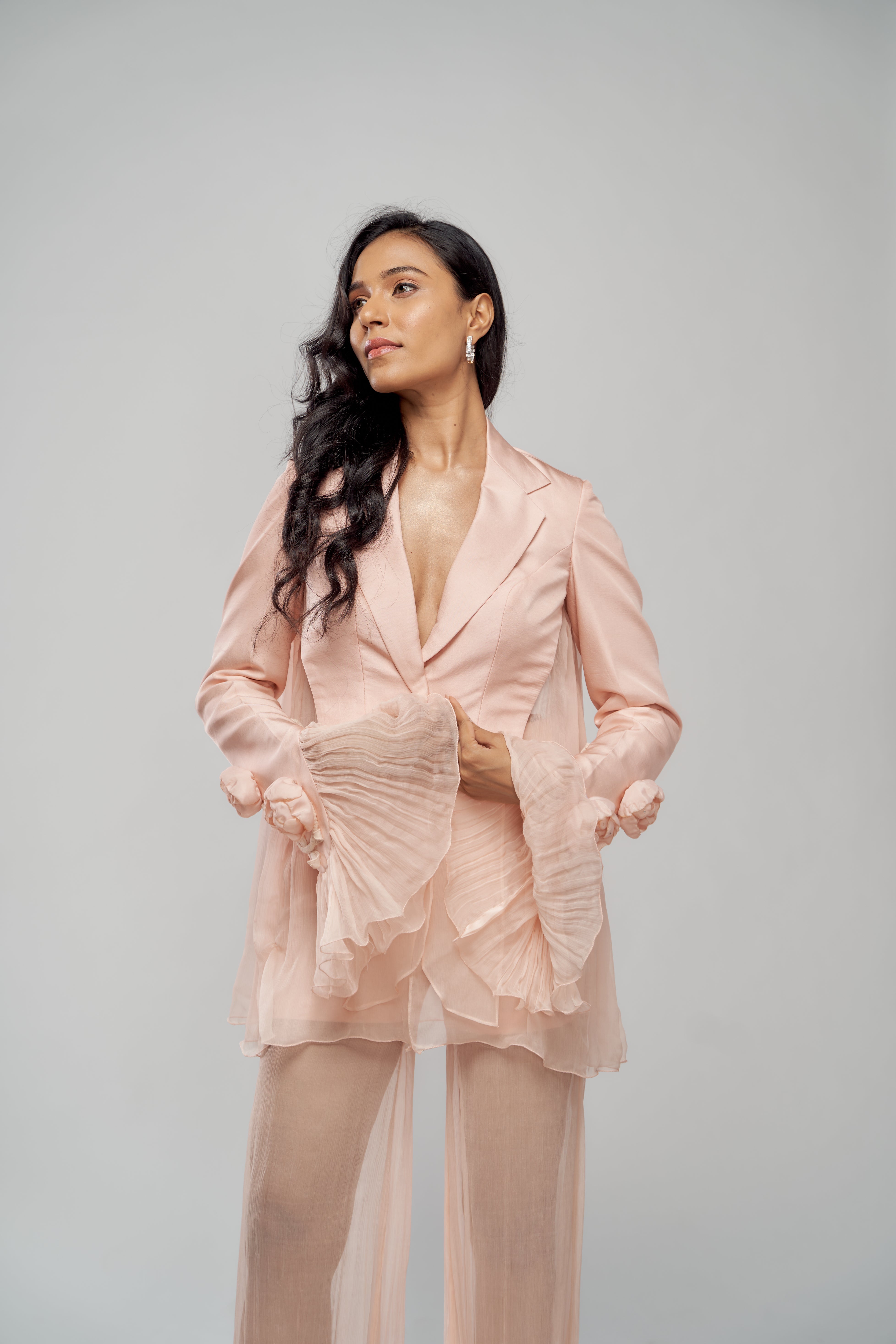 Twill and chiffon textures come alive in this crushed-finish ensemble, softly adorned with 3D peony accents for quiet drama.