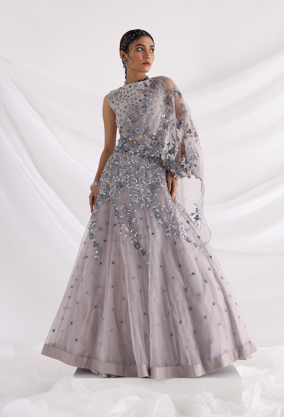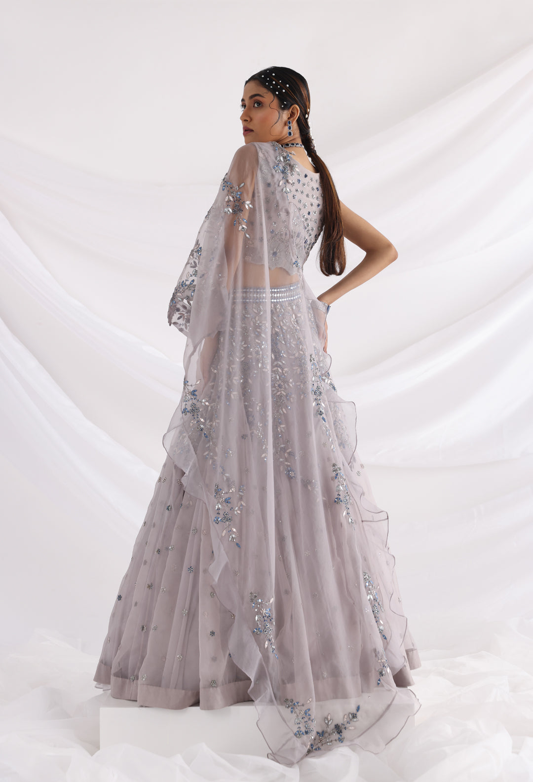 Surface ornamentation in blue and white brighten up the grey setting. The abla embroidery ripples across the lehenga and dupatta in an ephemeral way.