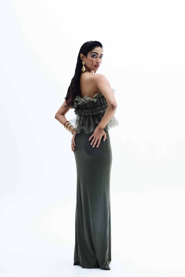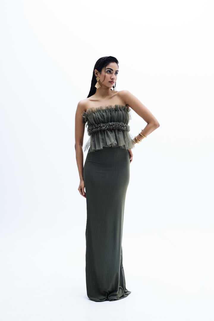 Elevate your style with our versatile ruffle gown, featuring a chic ruffle bustier. This capsule wardrobe must-have combines comfort and sophistication, with ruffle all over the bust and sleek silhouette that bring a fresh, energetic vibe to your day. Perfectly fit that look that radiates vitality and refinement.