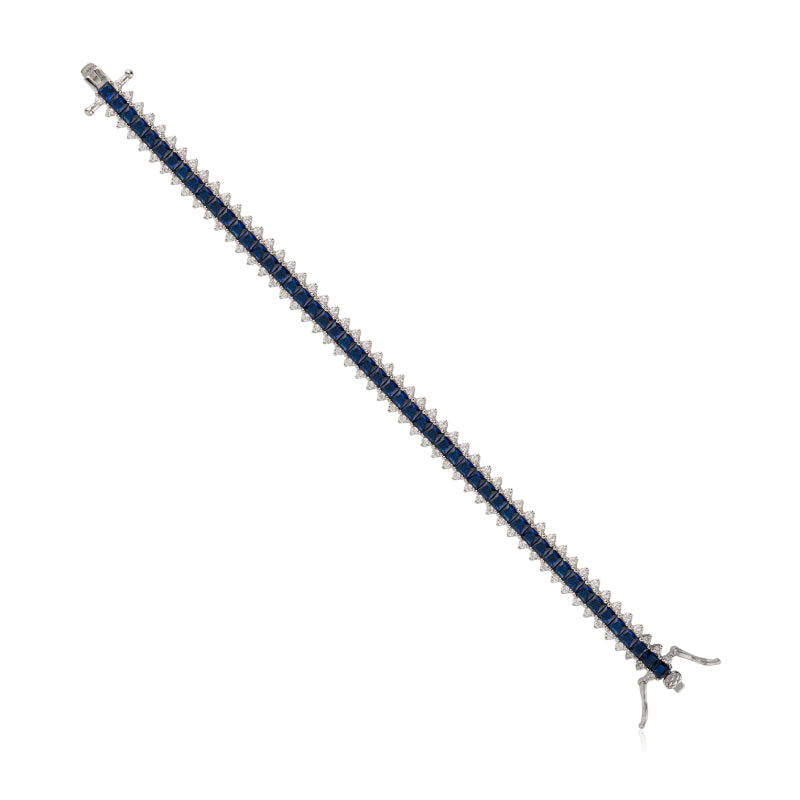 This elegant bracelet features a stunning array of finely crafted cubic zirconia stones, set in a high-quality silver setting. The sparkling gemstones are expertly arranged to create a sophisticated and timeless design, offering a brilliant shine with every movement. Ideal for both everyday wear and special occasions, this piece combines the durability of silver with the exquisite brilliance of cubic zirconia, making it a must-have addition to any jewelry collection. Gross Weight: 14.8 gram, Length: 6.5 Inch, Depth: 0.13 Inch, Width: 0.28.