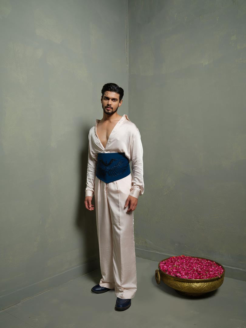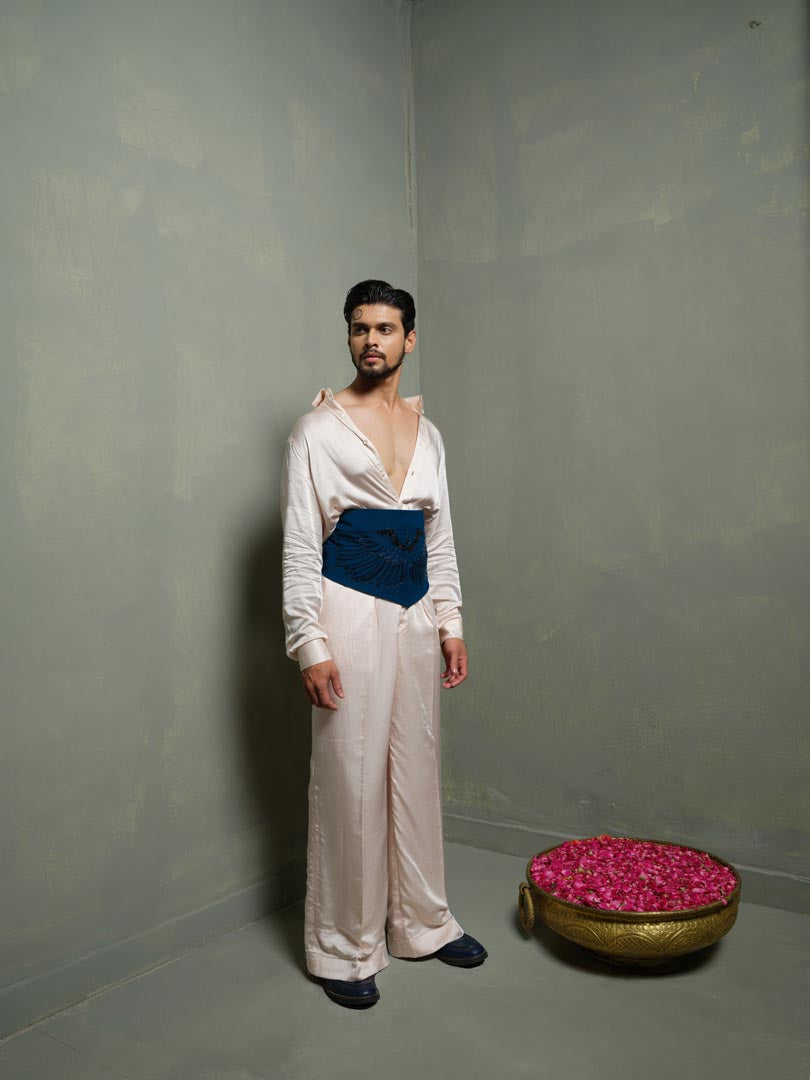 The Blue silk Waist belt is embroidered with Wings embroidery and embraced with structured cut in front, making it ideal to pair up with versatile looks.