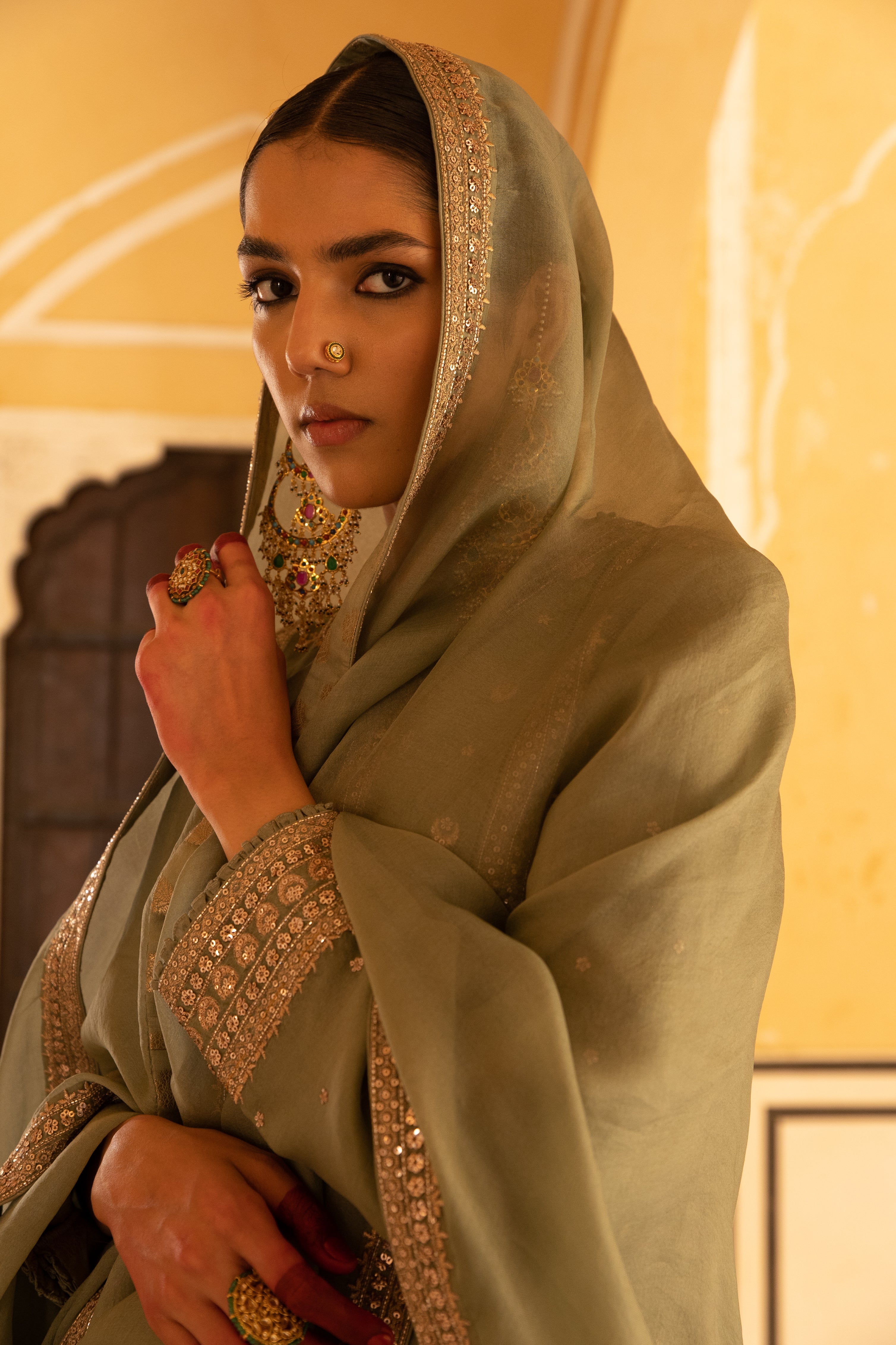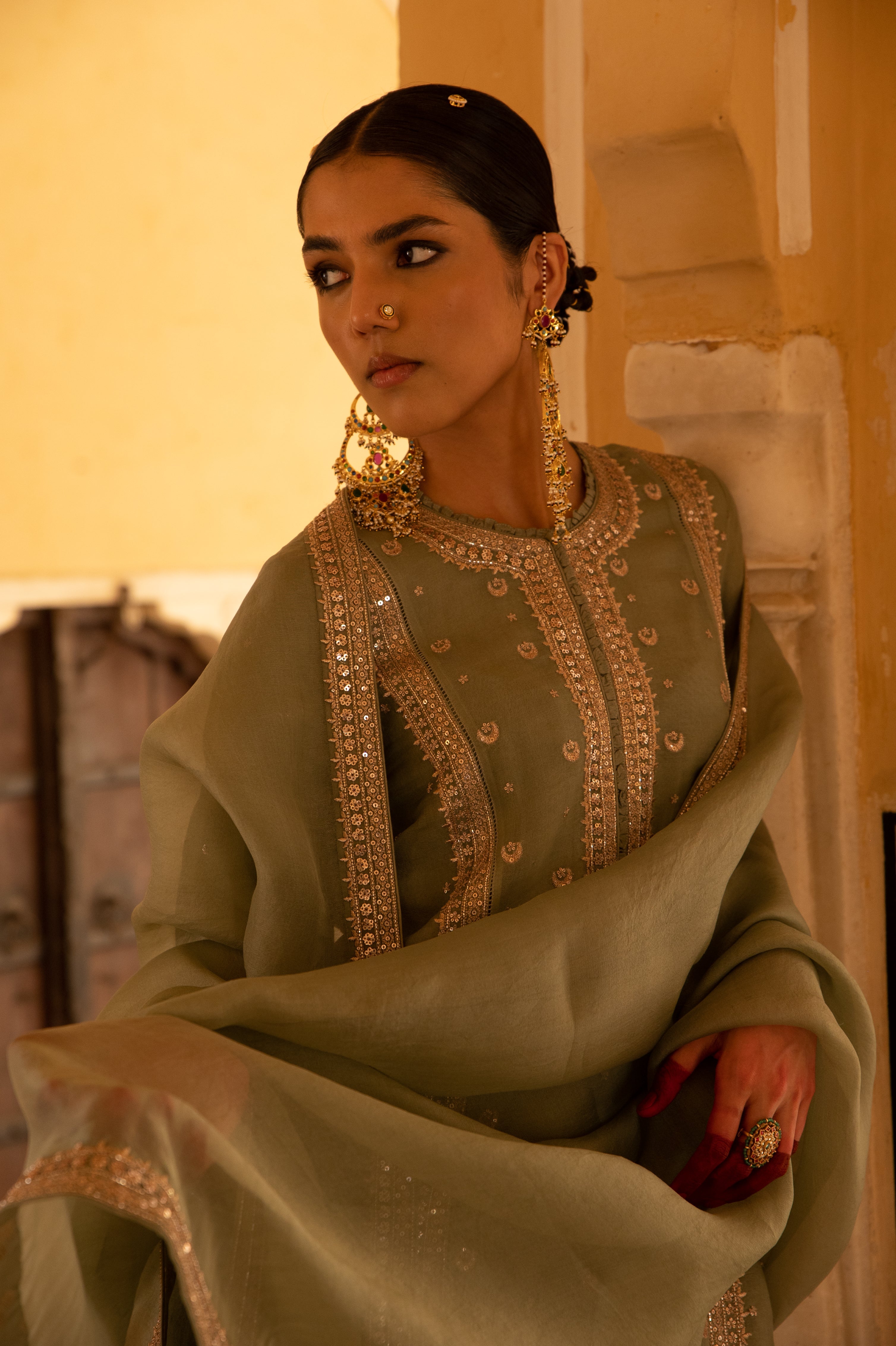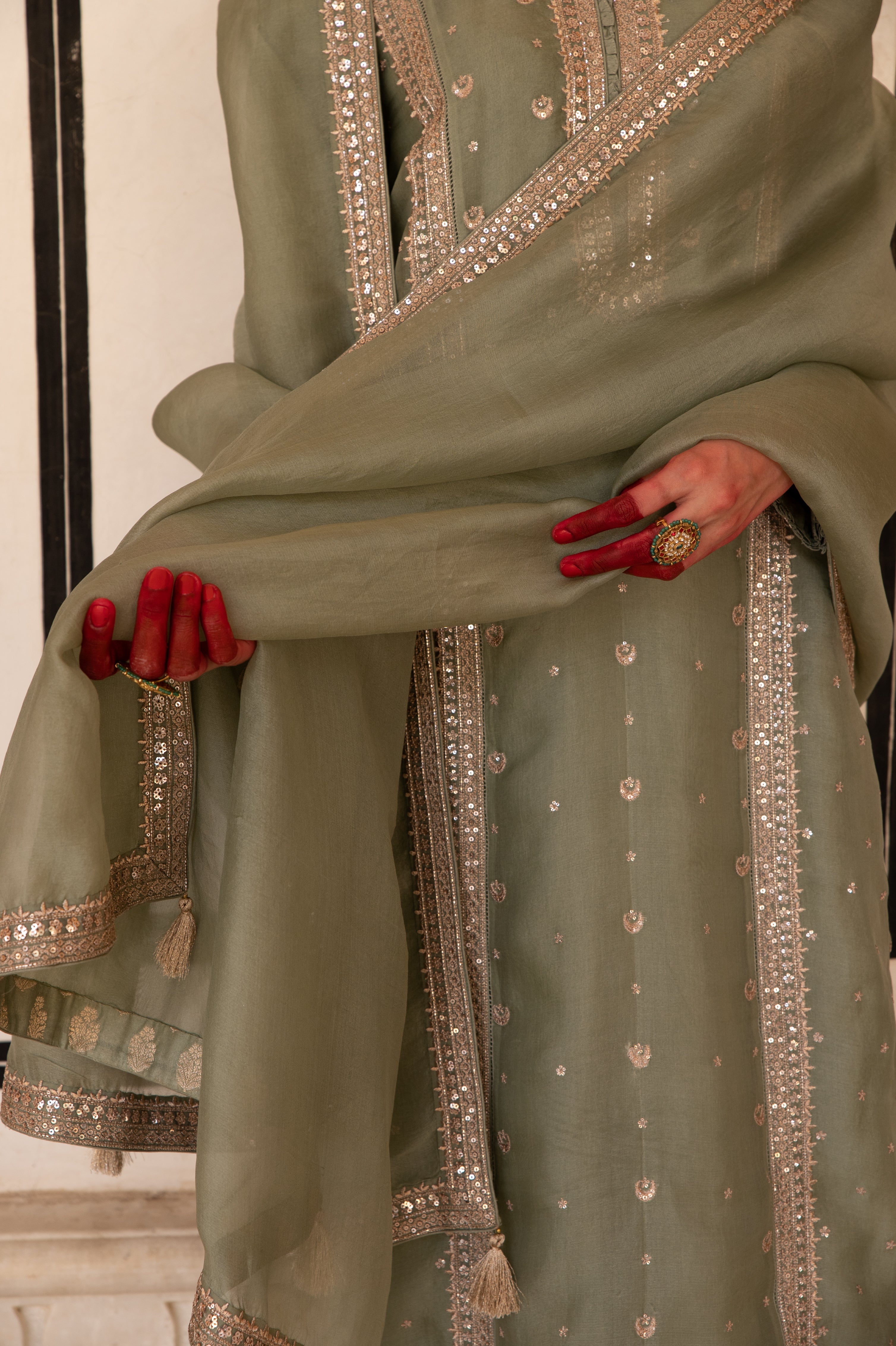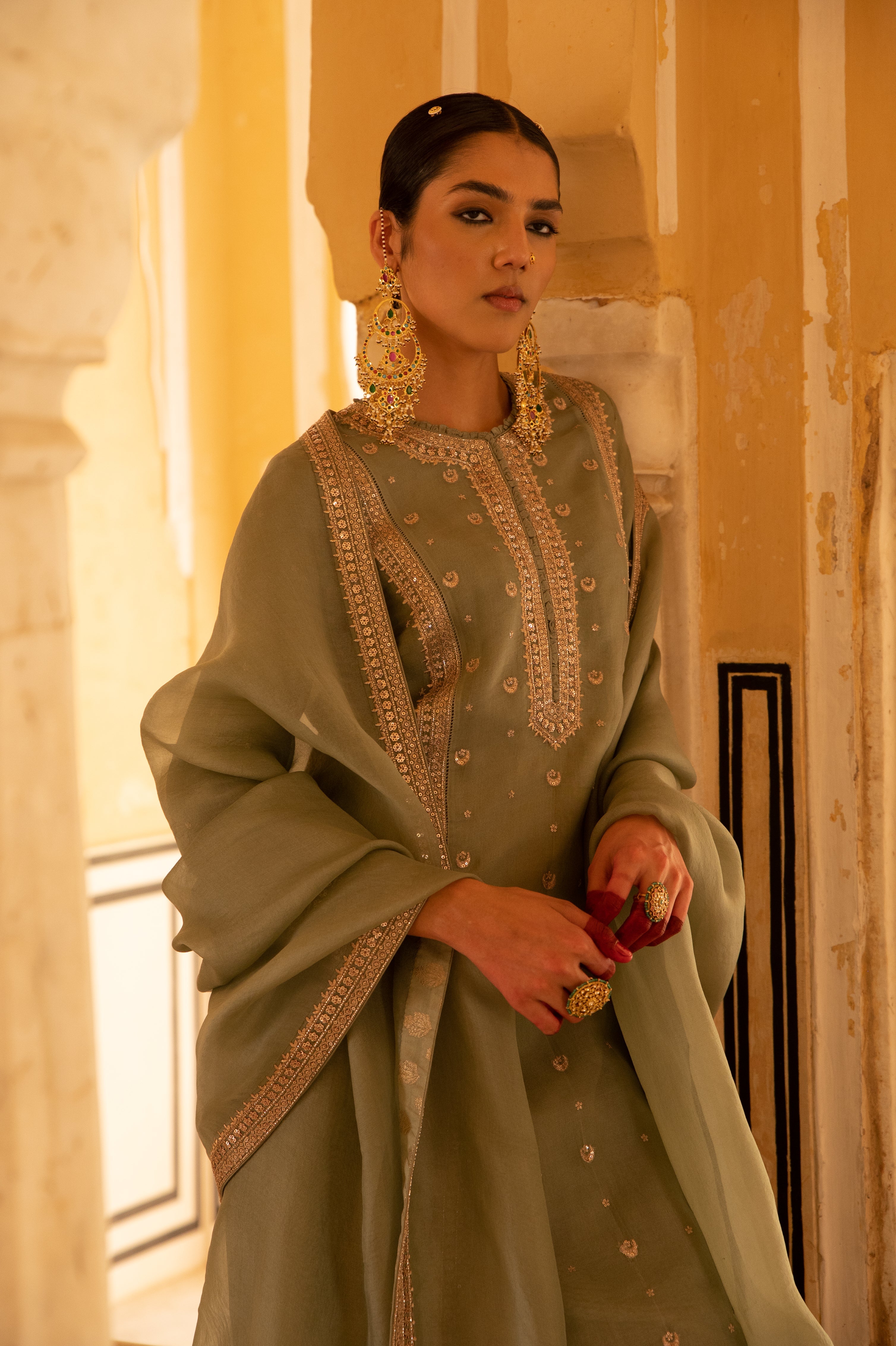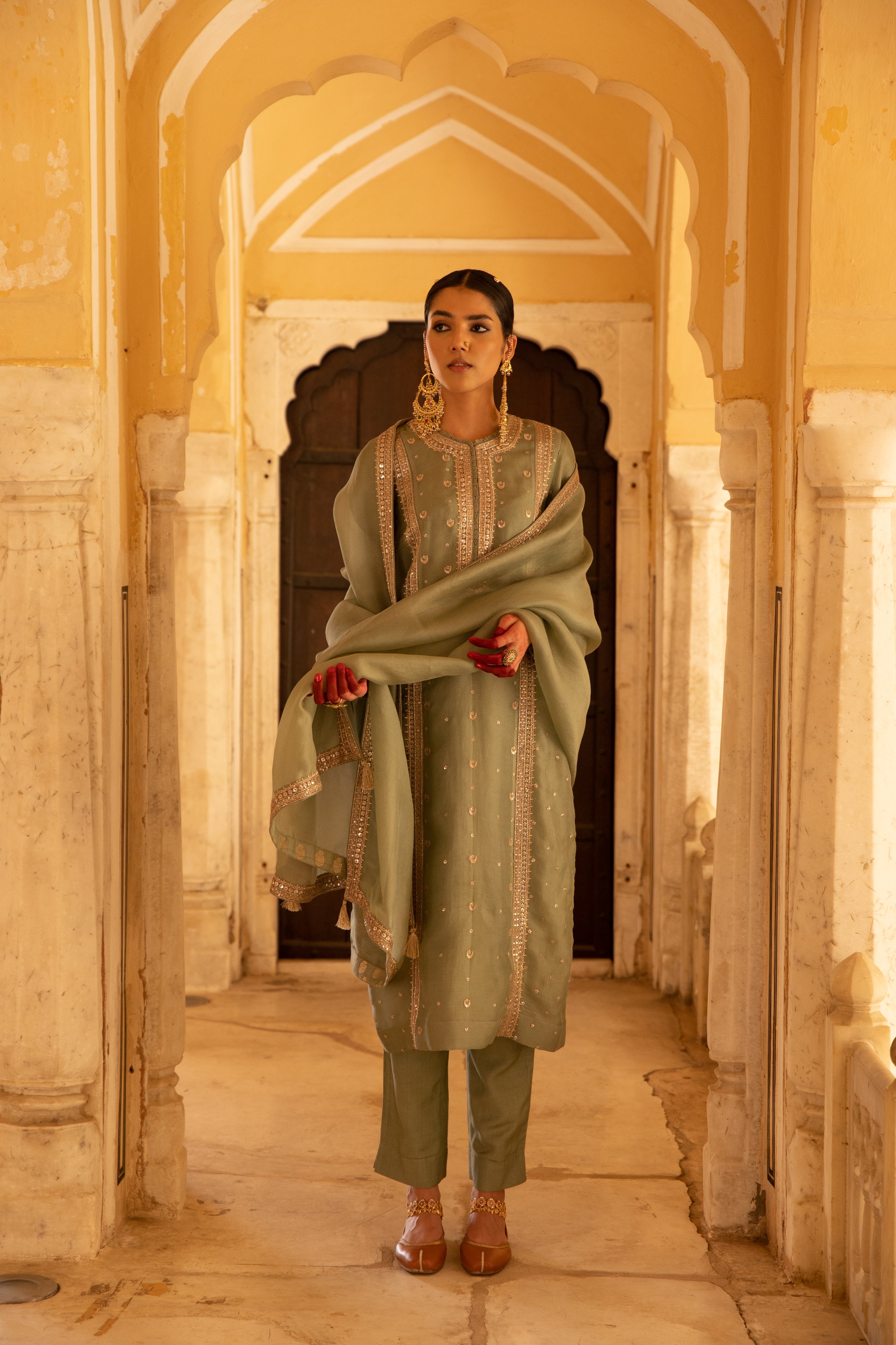 Fern-Green Hand-Embroidered Pure Silk-Organza Kurta-Pants Set