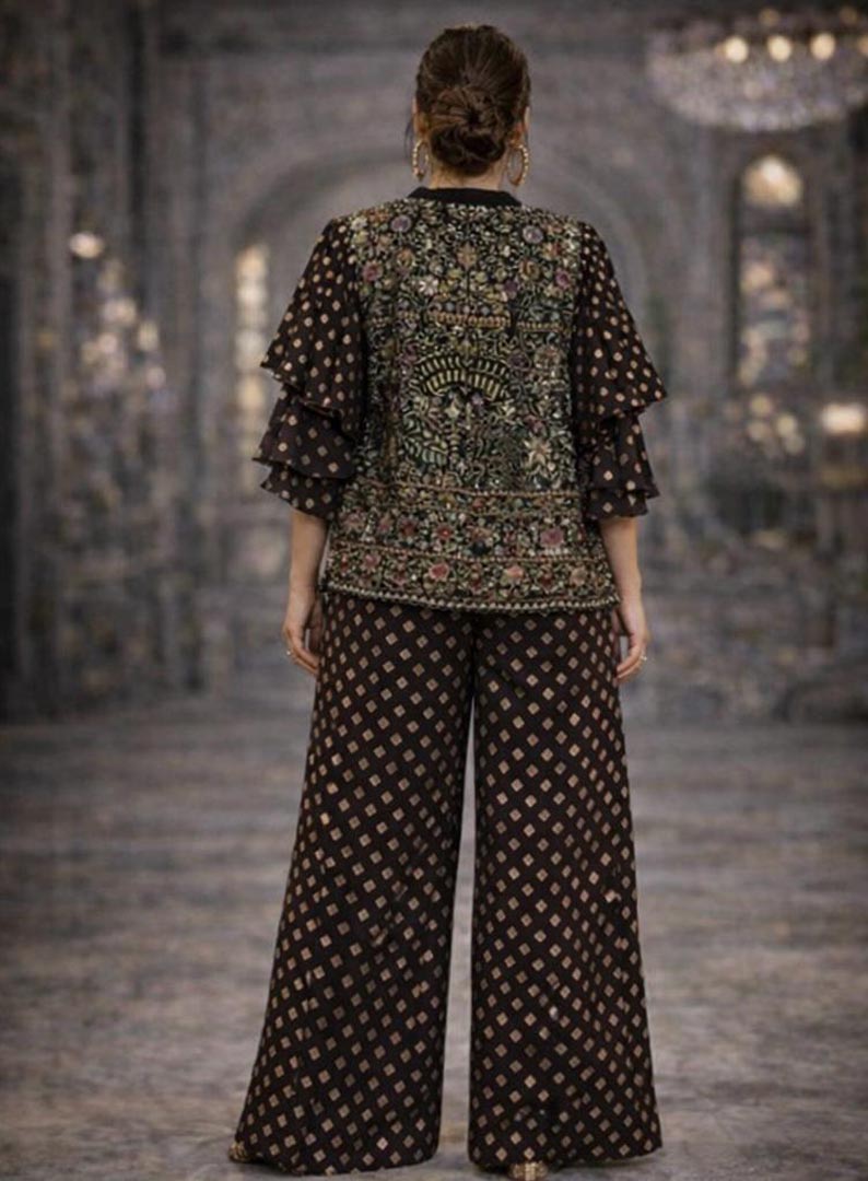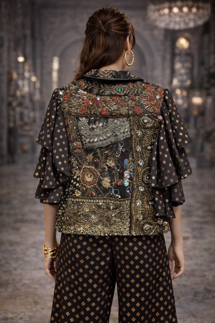 Crafted in a classic black hue, this ensemble features exquisite hand embellishments that add a touch of sparkle and sophistication. The set includes a statement jacket with a tailored fit and coordinating bottoms that exude effortless glamour.