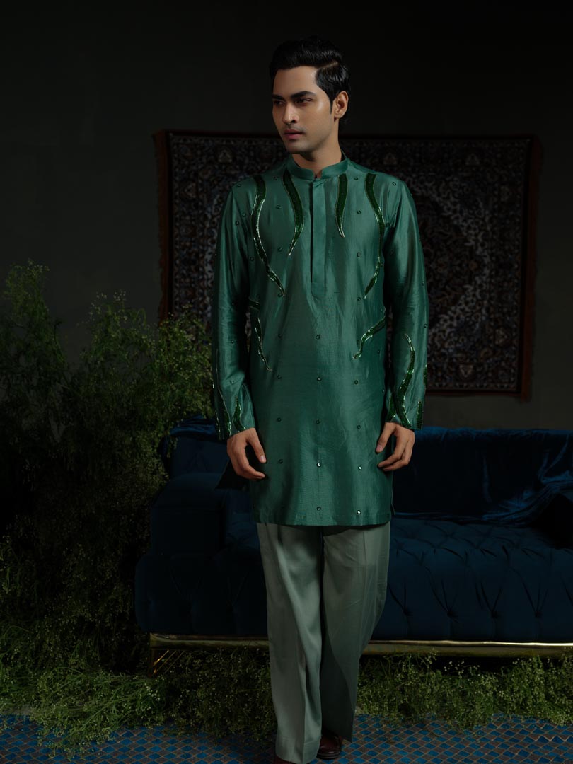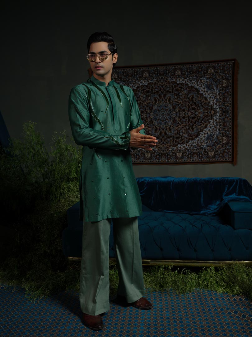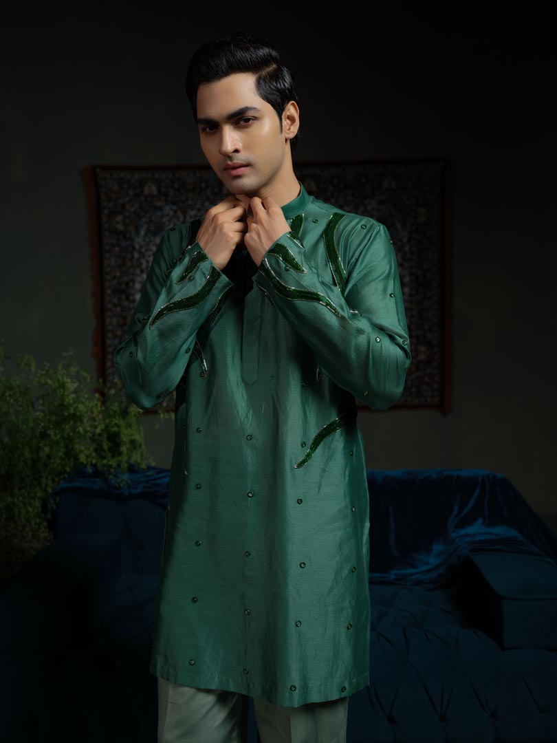 A Dark green Kurta embellished with flame like cutpipe work is paired up with Lighter tone Pant Pajama.