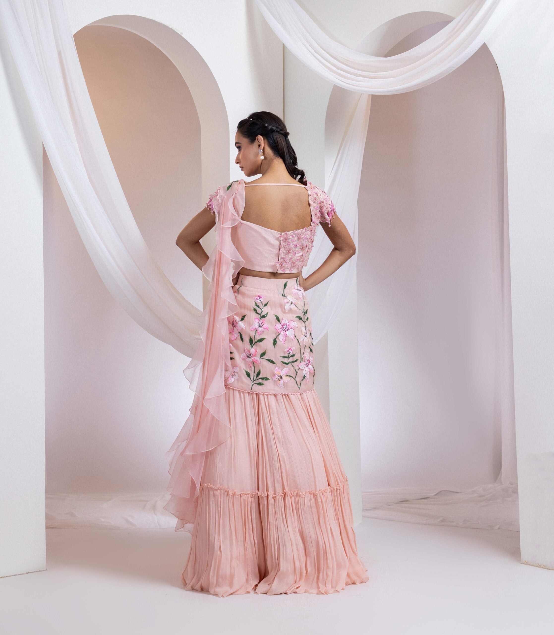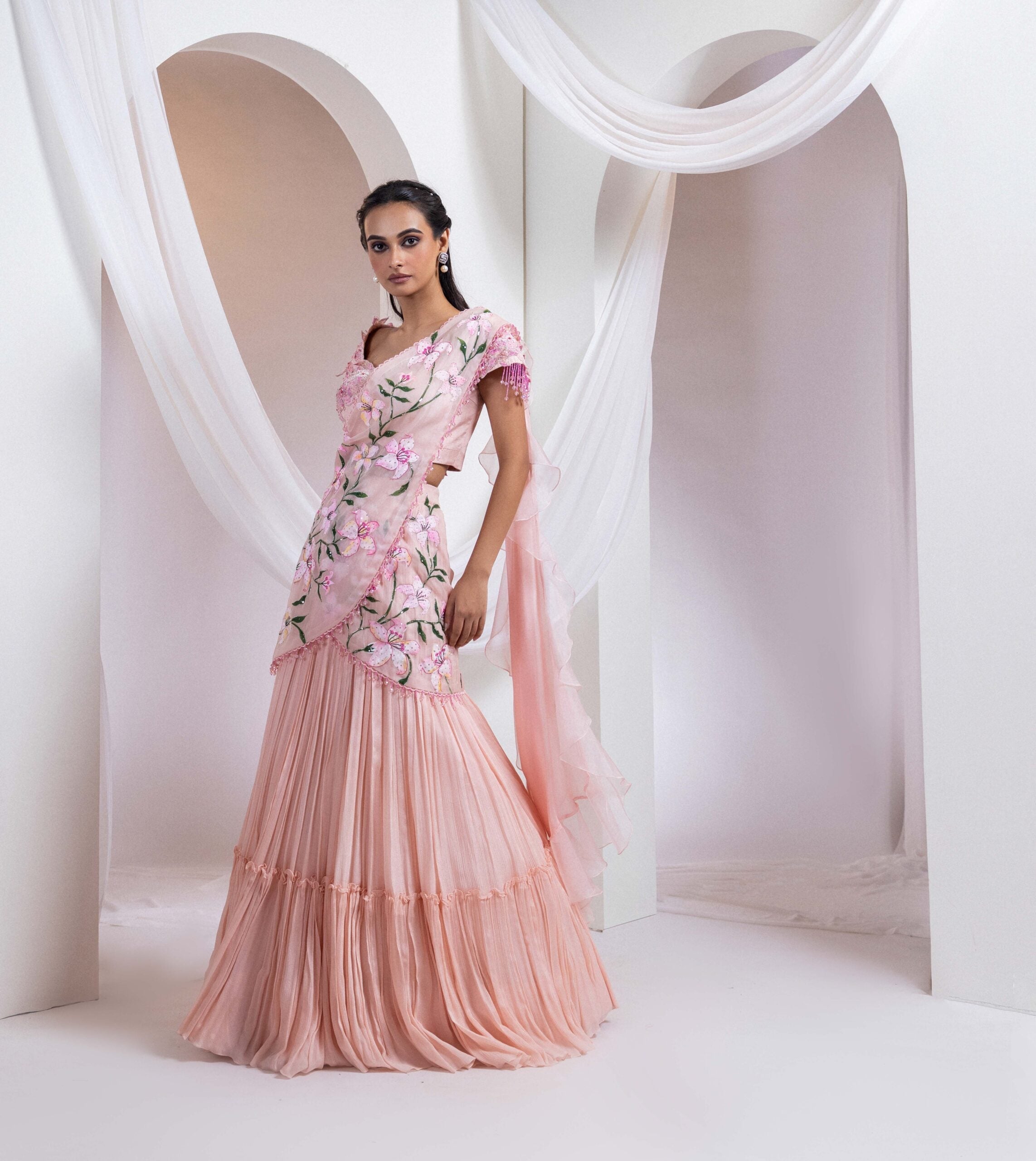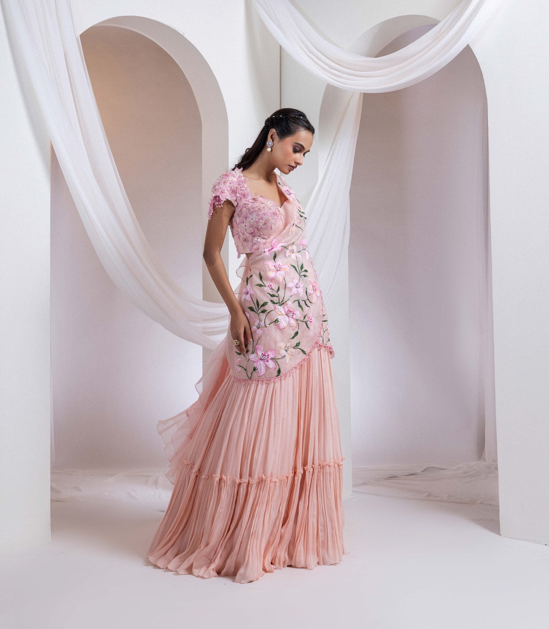 A romantic ruffle saree in soft pink tones, blooming with hand-painted floral motifs in blush, green, and yellow across the organza palla. The blouse features delicately embroidered appliqué floralscrafted with intricate bead, mirror, and thread work for a textured, artisanal finish. Flowing into a tiered ruffle skirt, this piece moves with elegance and ease, capturing the lightness of spring in full bloom.