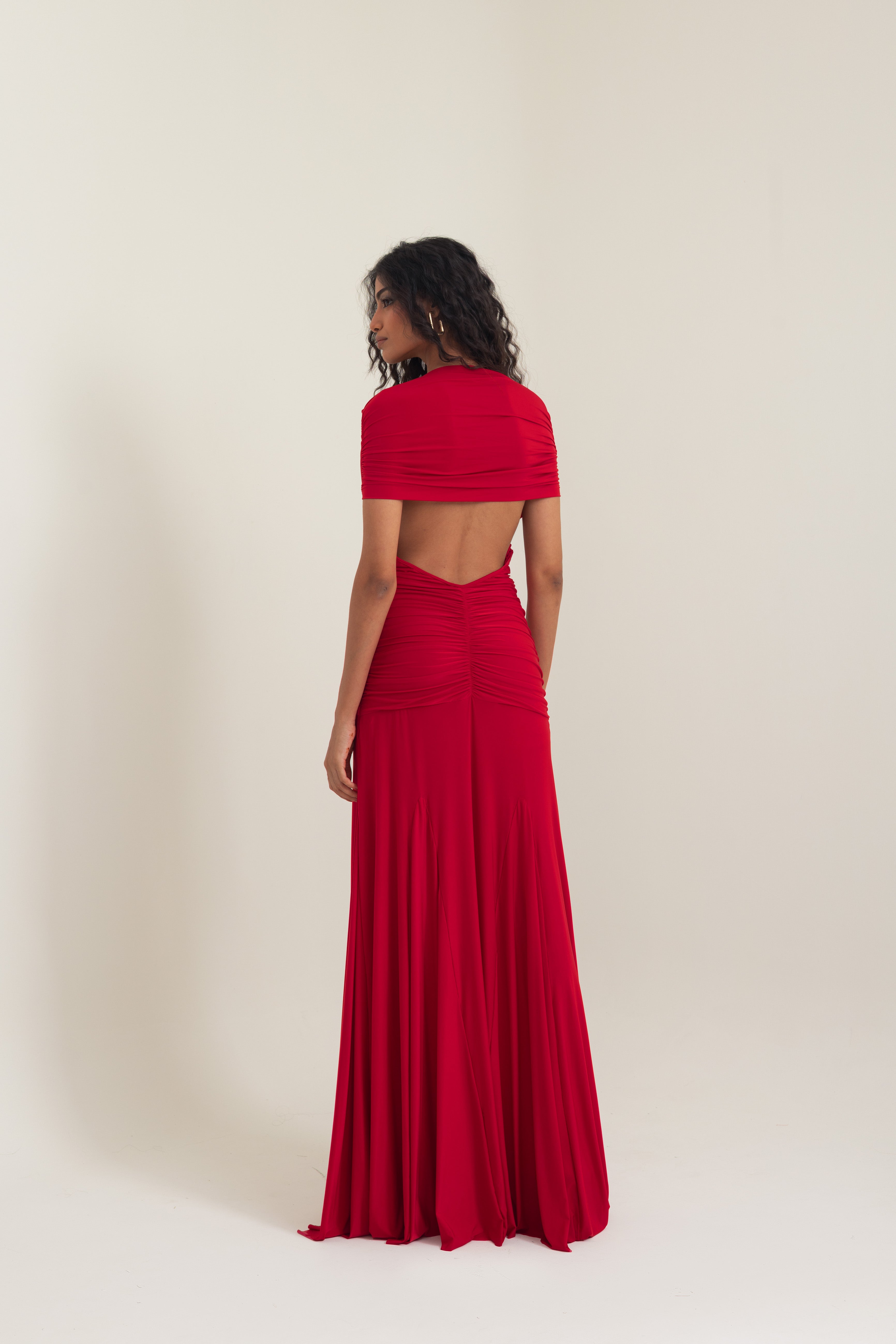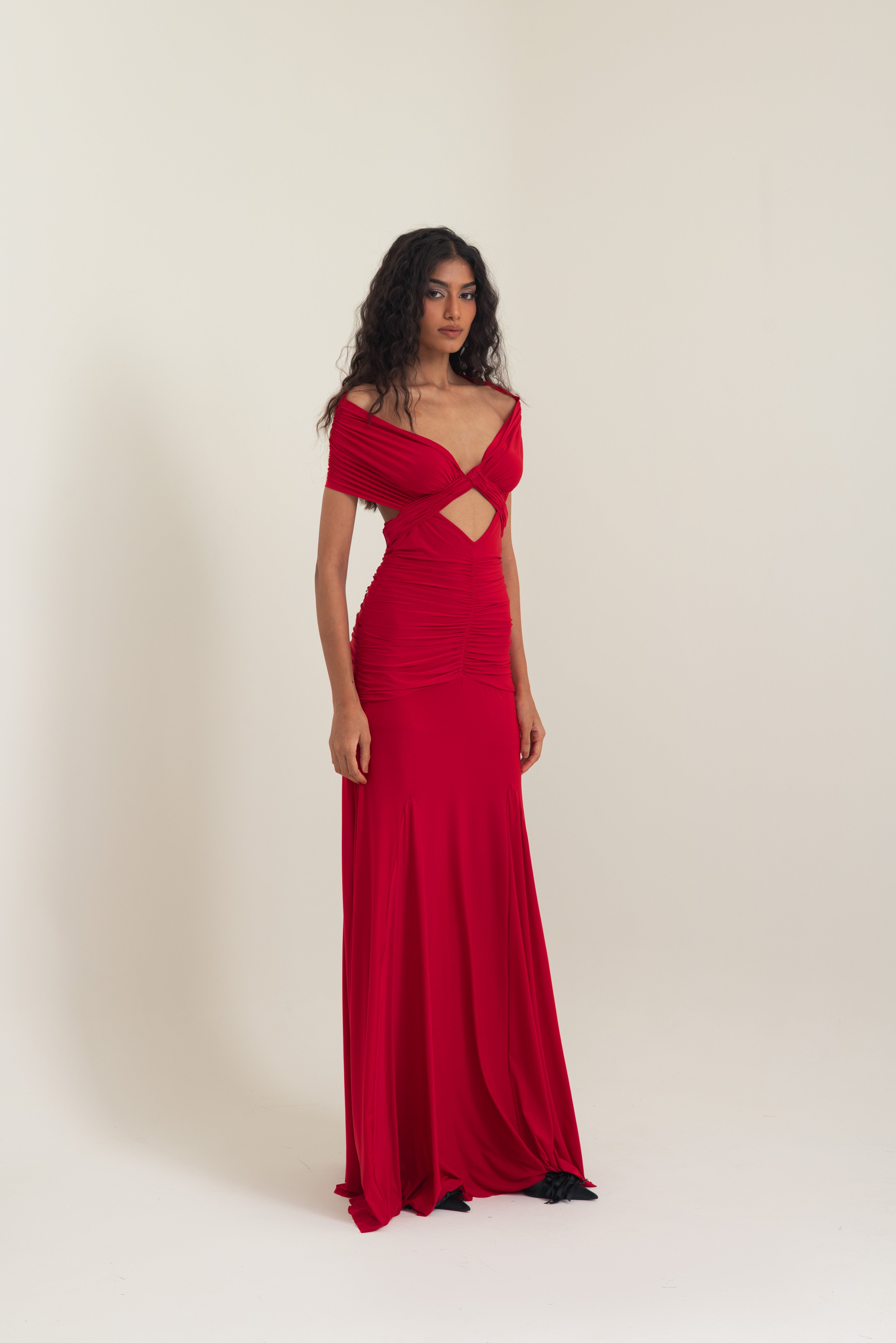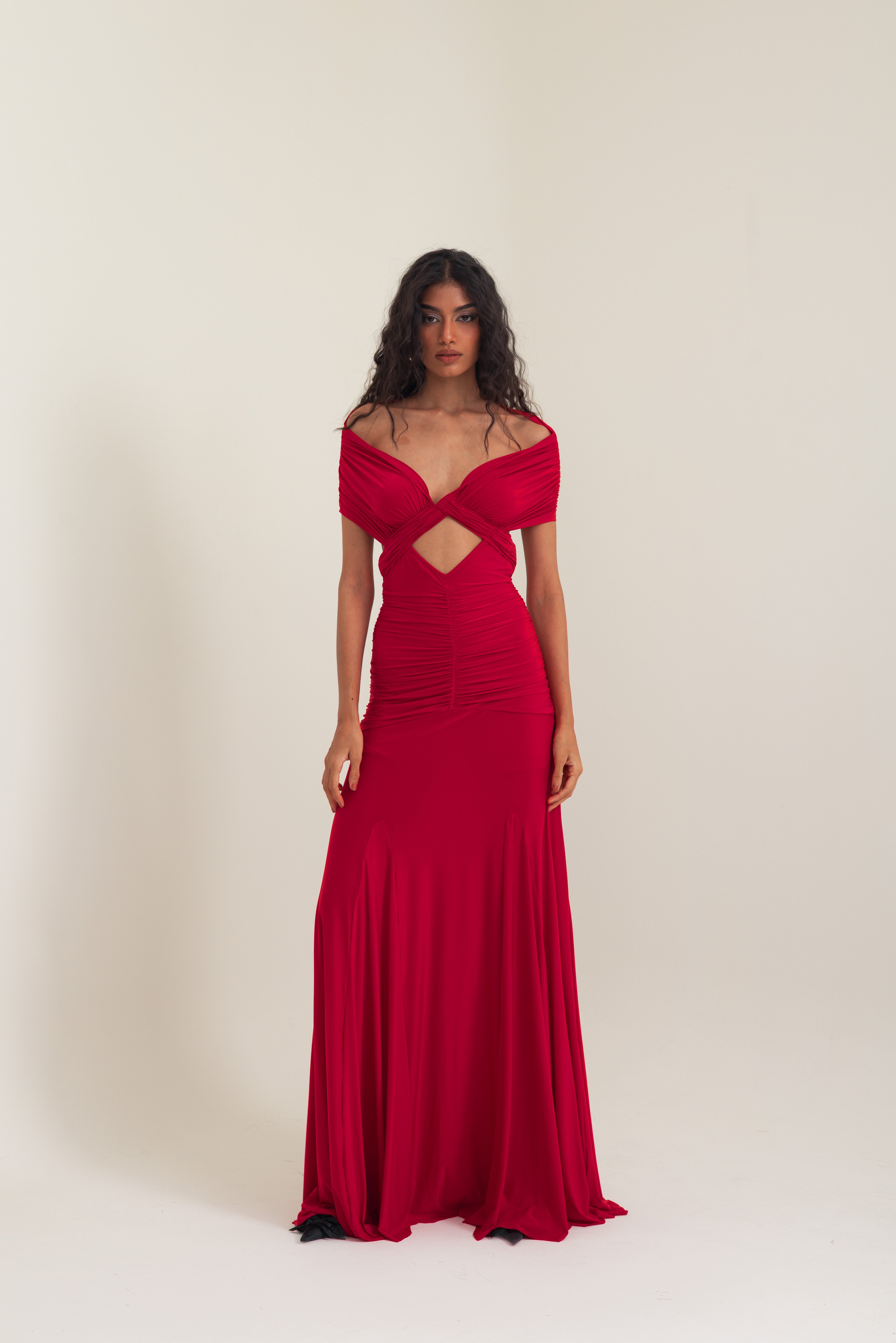 Exuding confidence and allure, this gown in Vespa Red is crafted from fluid malai lycra, masterfully hand-draped to contour the body with precision. The design features an off-shoulder crossover neckline that frames the décolletage, flowing seamlessly into a sculpted bodice with ruched detailing and a daring front cut-out that adds modern edge.