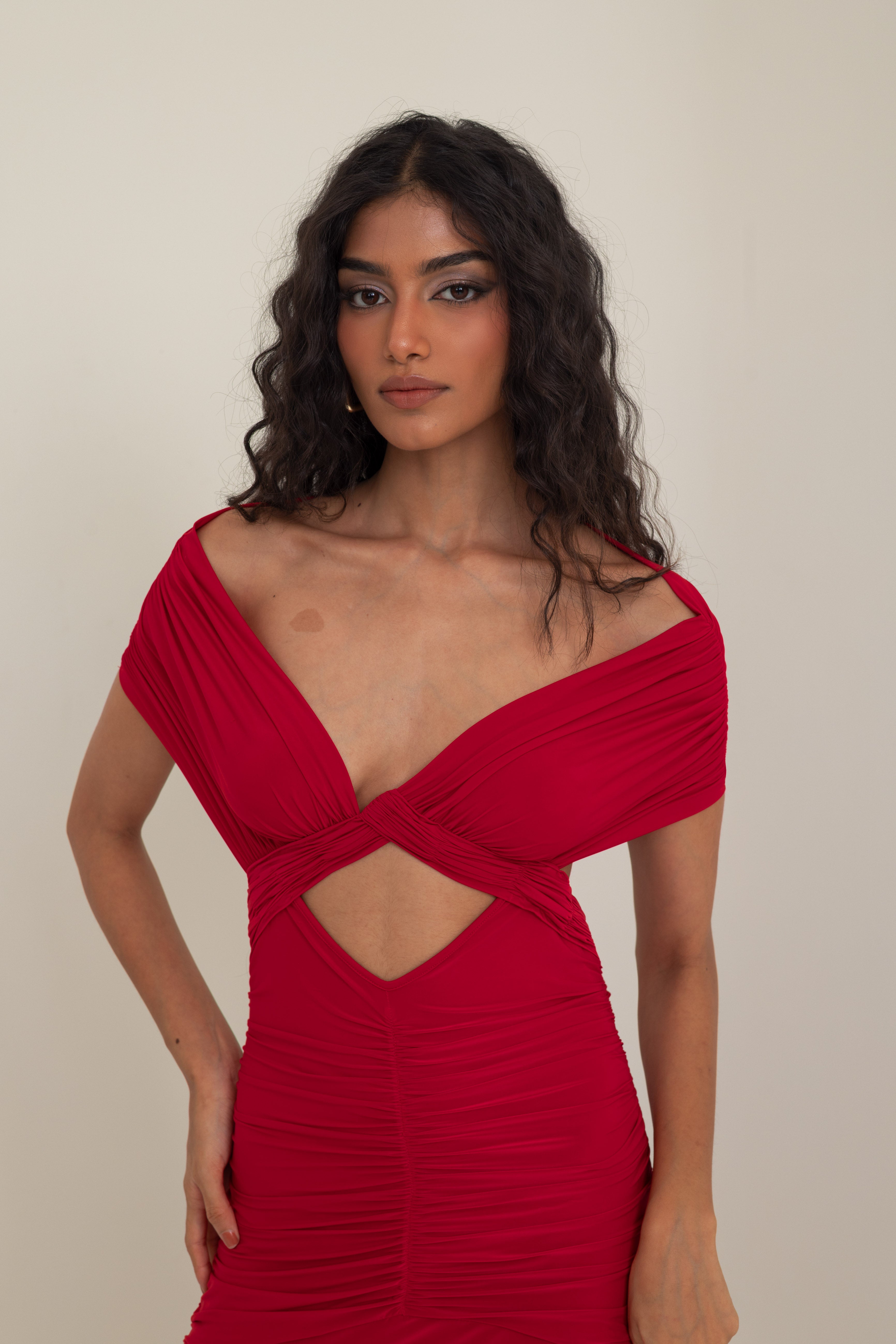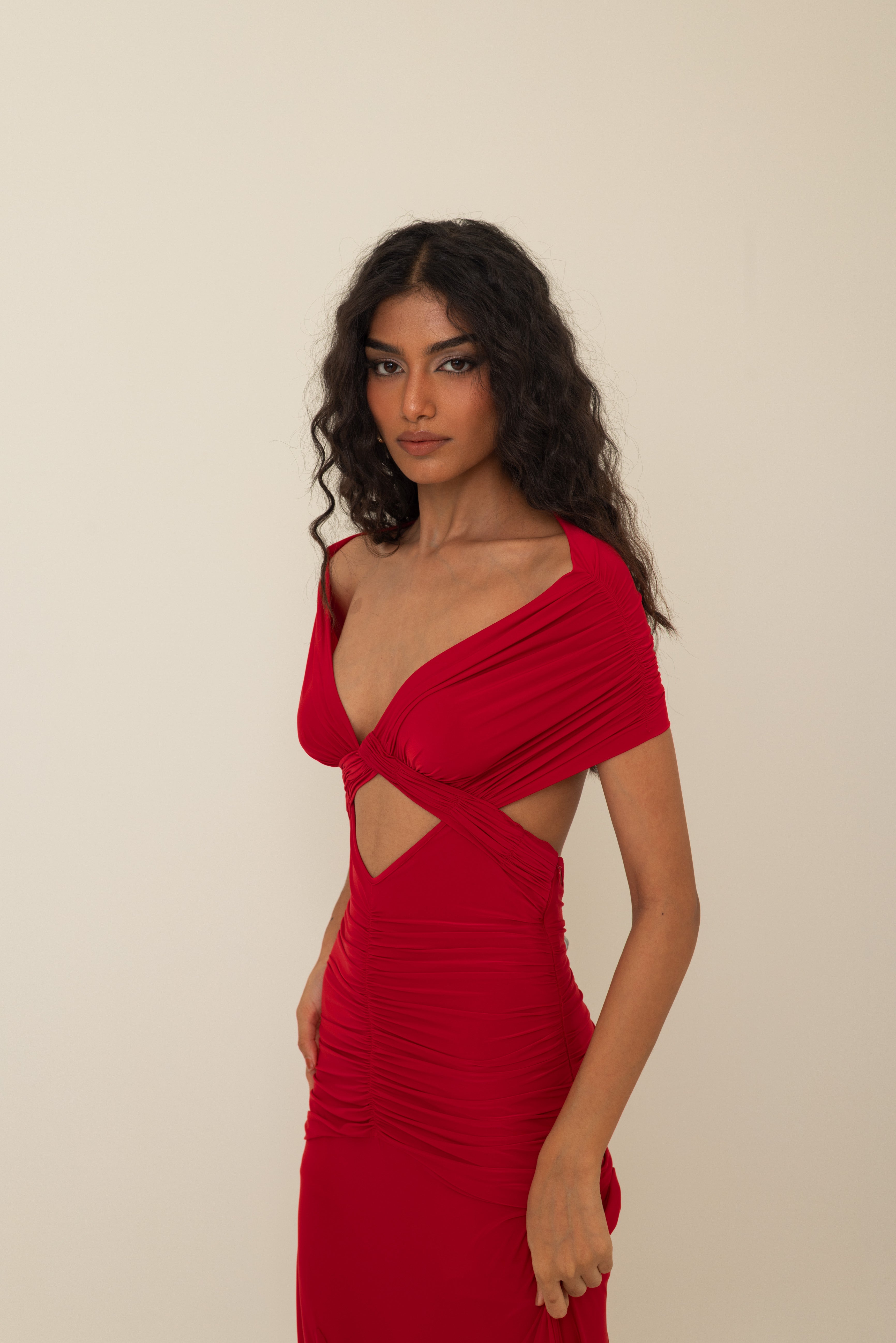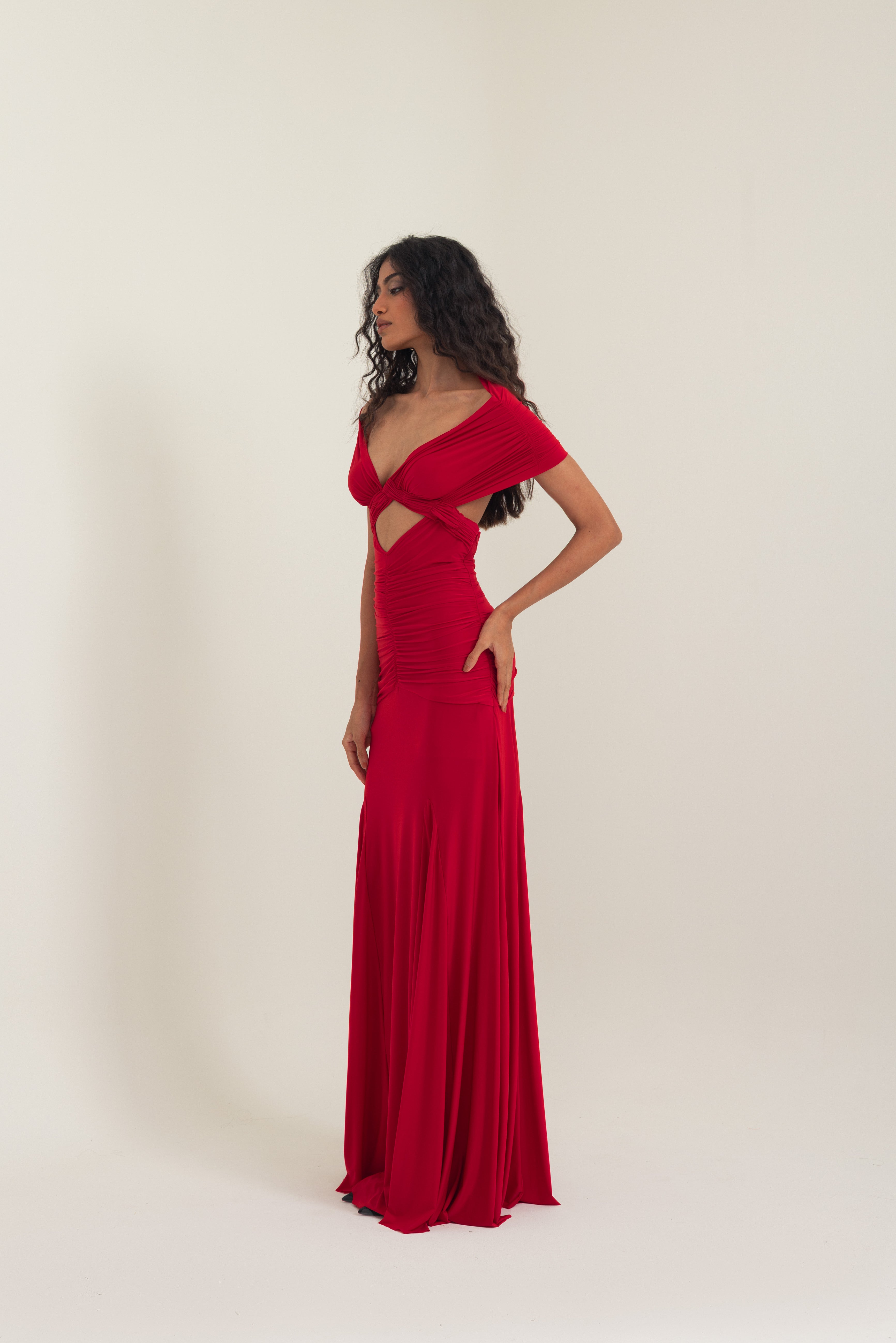 Exuding confidence and allure, this gown in Vespa Red is crafted from fluid malai lycra, masterfully hand-draped to contour the body with precision. The design features an off-shoulder crossover neckline that frames the décolletage, flowing seamlessly into a sculpted bodice with ruched detailing and a daring front cut-out that adds modern edge.