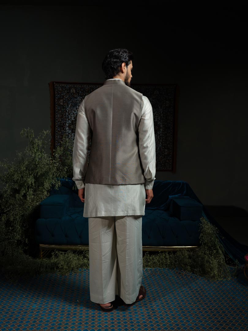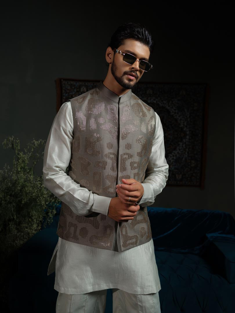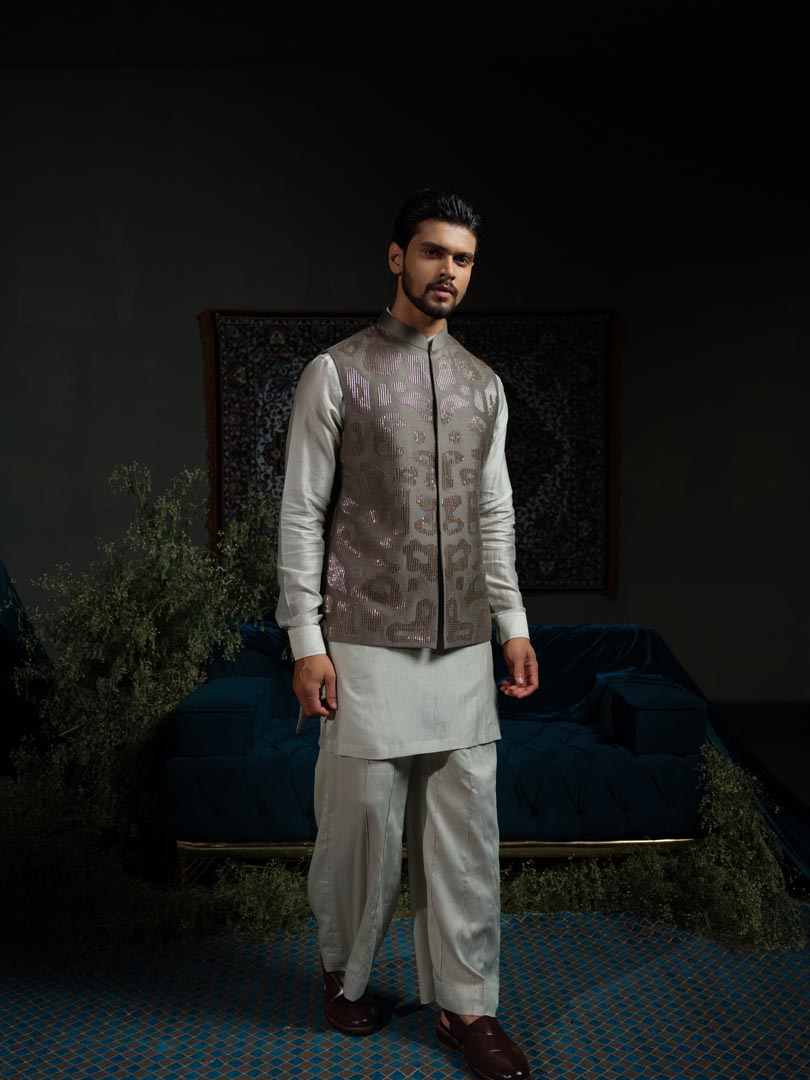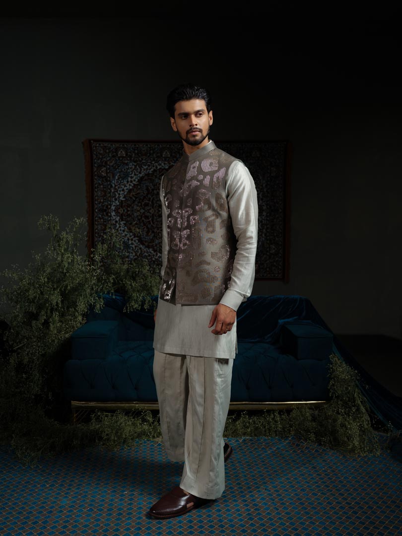 A sage green bundi adorned with amoeba motifs and glass pipe embroidery .