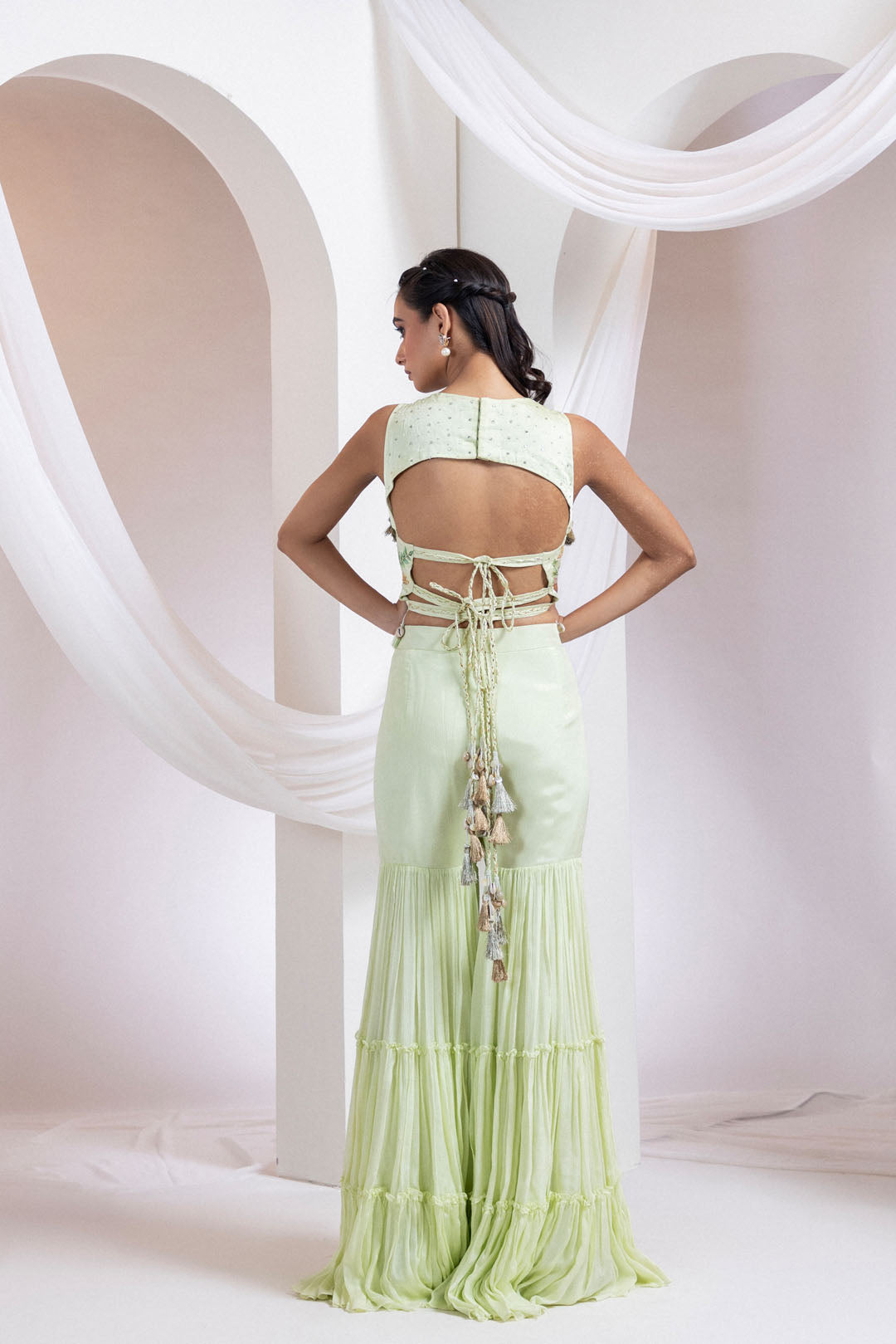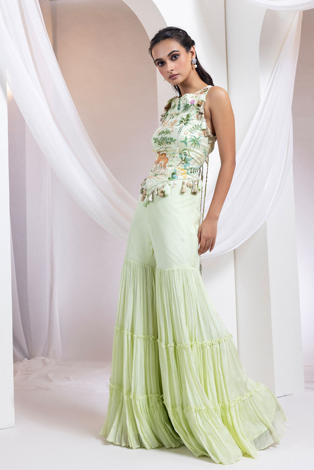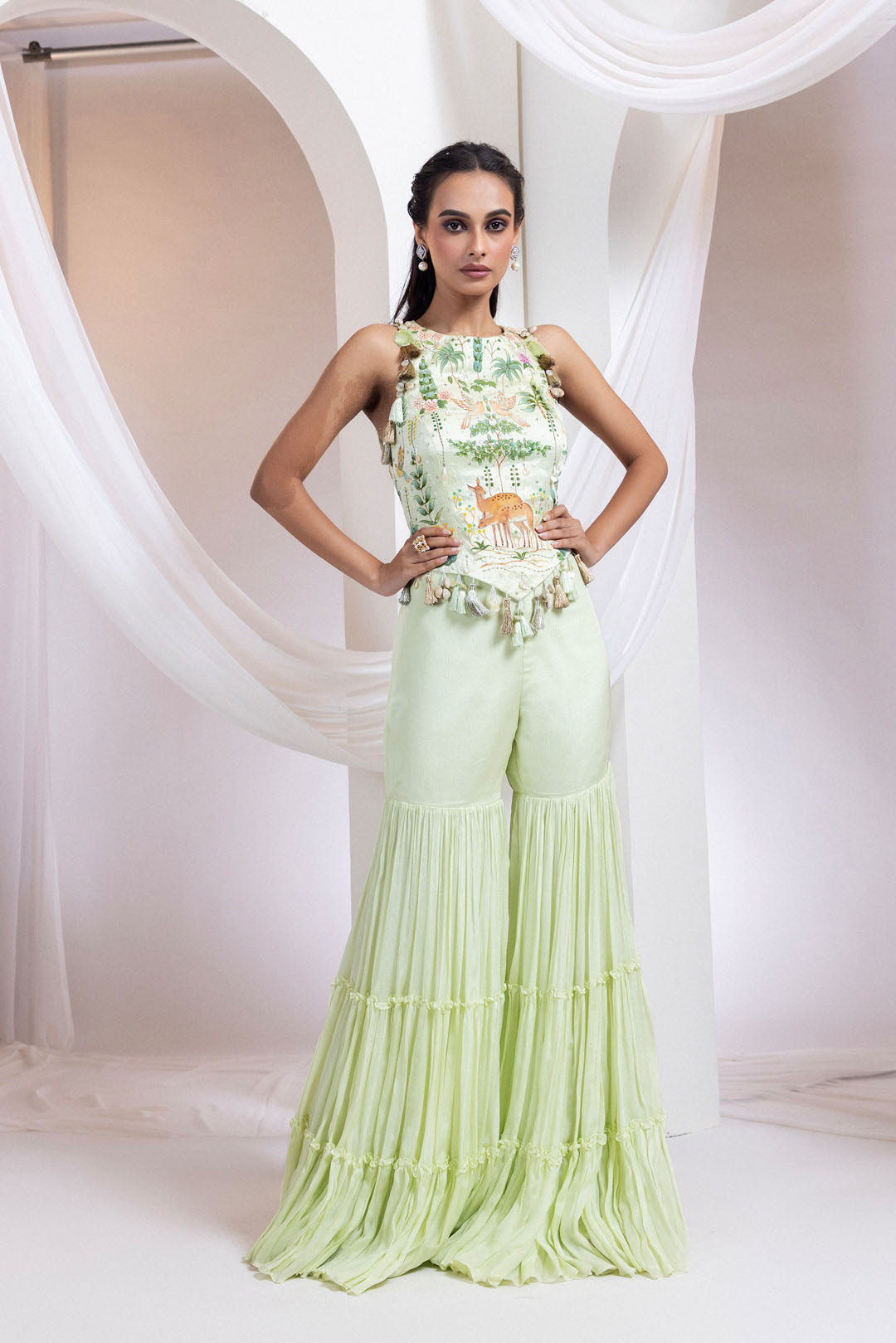 A whimsical two-piece set in light lime green, where forest fables come alive. The structured corset features intricate hand painting of birds, deer, and lush foliage, elevated with fine threadwork and bead embroidery. Paired with softly tiered flared pants detailed with gentle gathers and drawstring accents, the look blends storybook charm with a contemporary silhouette—perfect for daytime celebrations steeped in nature’s spirit.