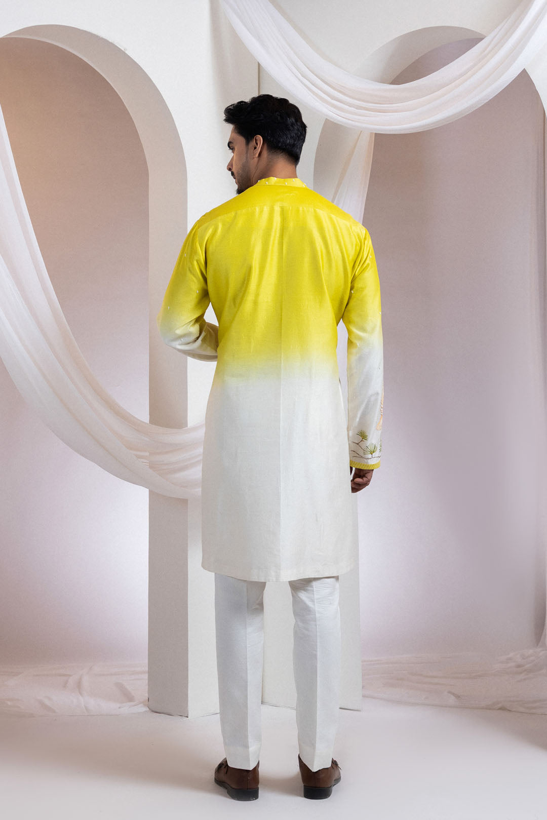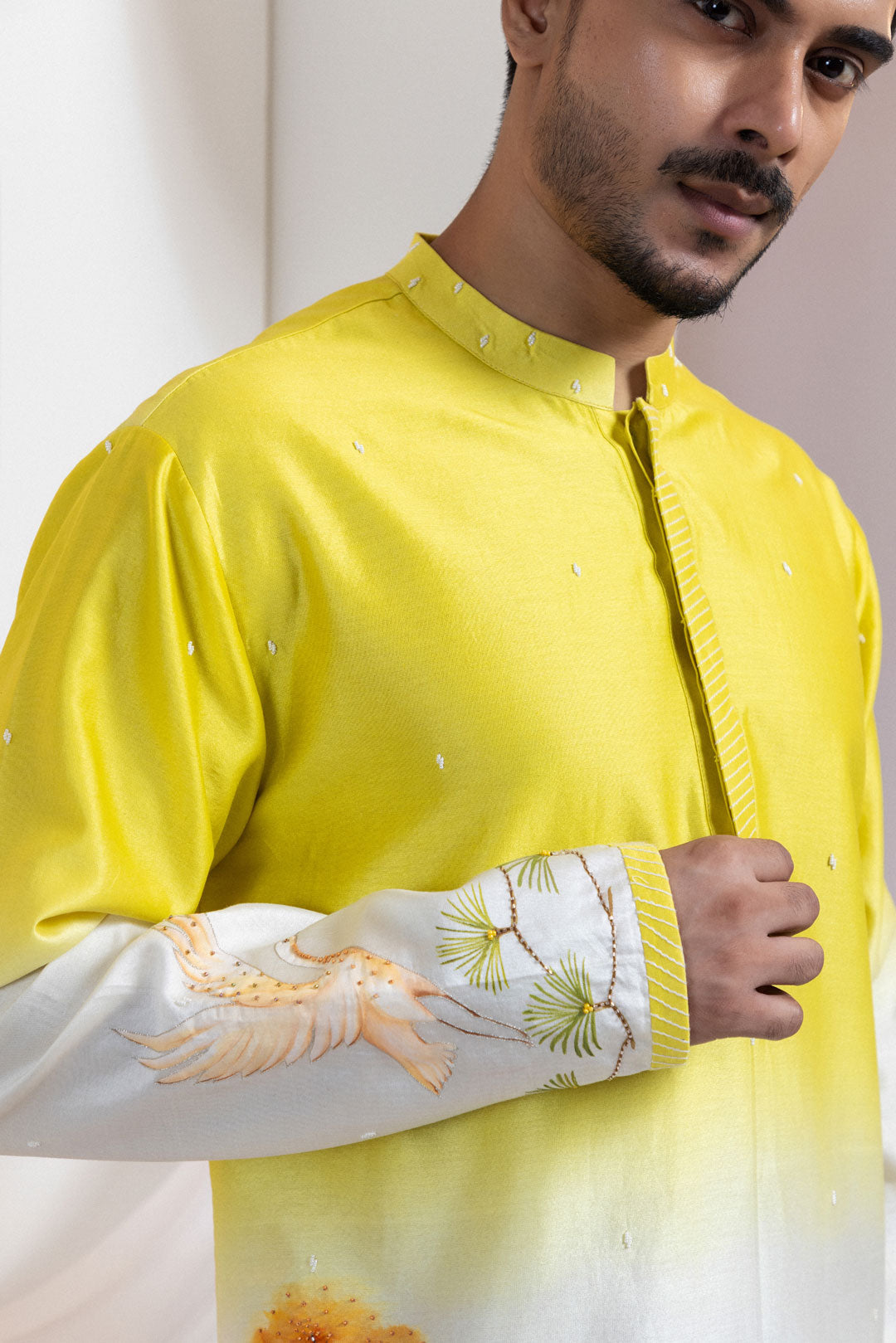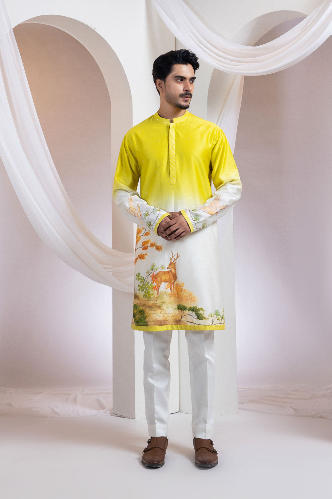 A refined two-piece set featuring a kurta and pants, thoughtfully detailed and nature-inspired. The kurta’s upper half is delicately embroidered with scattered beads, while the lower panel showcases hand-painted woodland scenery, complete with intricate bead accents. Striped borders on the hem and sleeves add a tailored finish. Elegant yet rooted in the wild, this ensemble is ideal for serene festive moments.