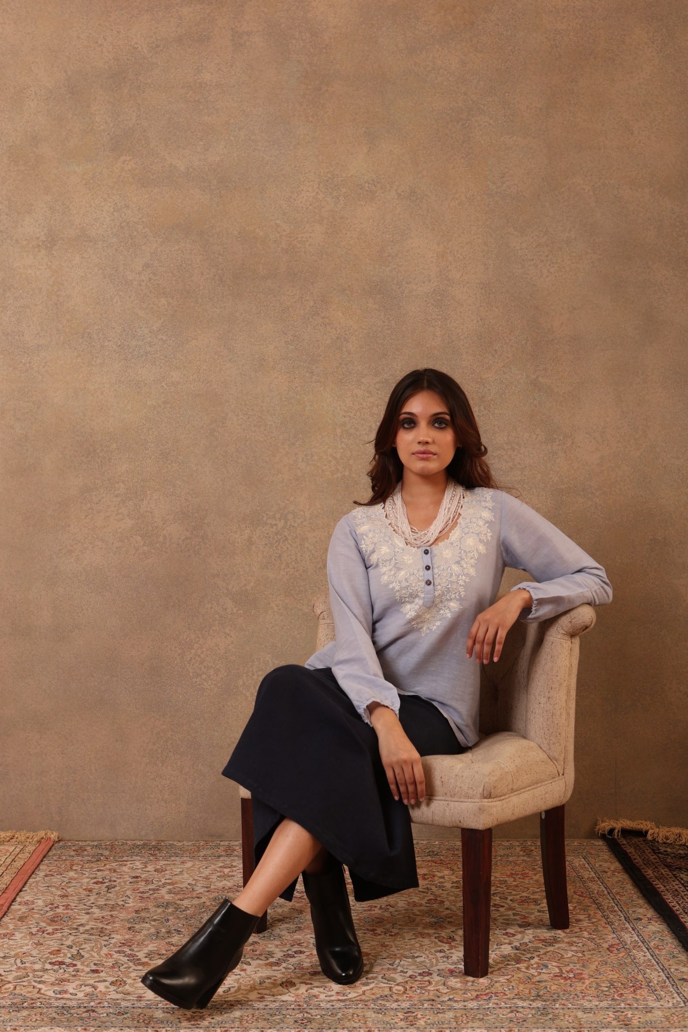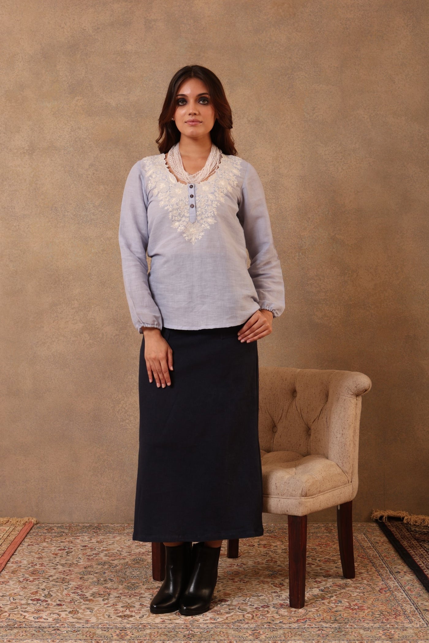 This is a forever-blue short blouse made from handloom pure linen cotton. The floral pattern on the blouse has been completely hand-embroidered with cotton threads. The blouse has a scalloped neckline with coconut buttons.