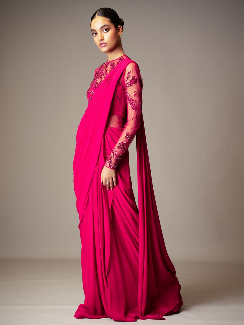 This georgette drape saree gown comes with a soft tulle bodice, decorated