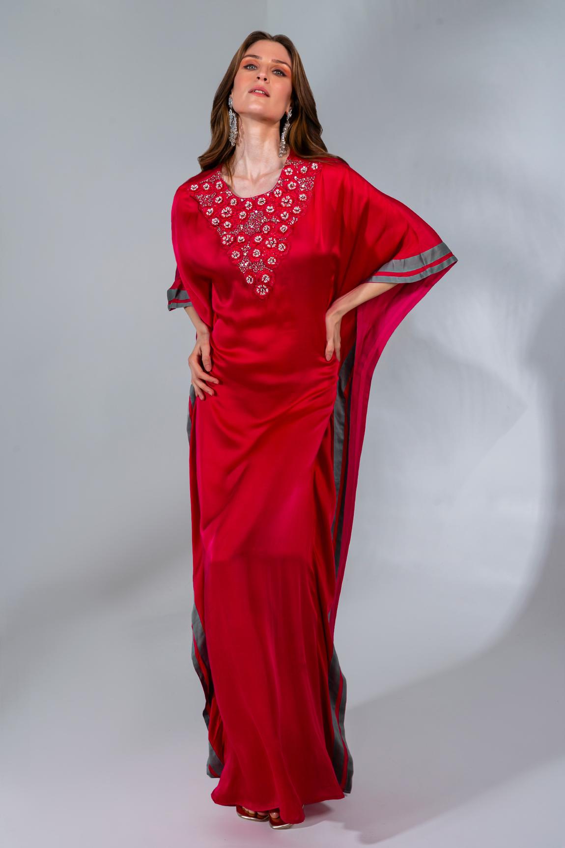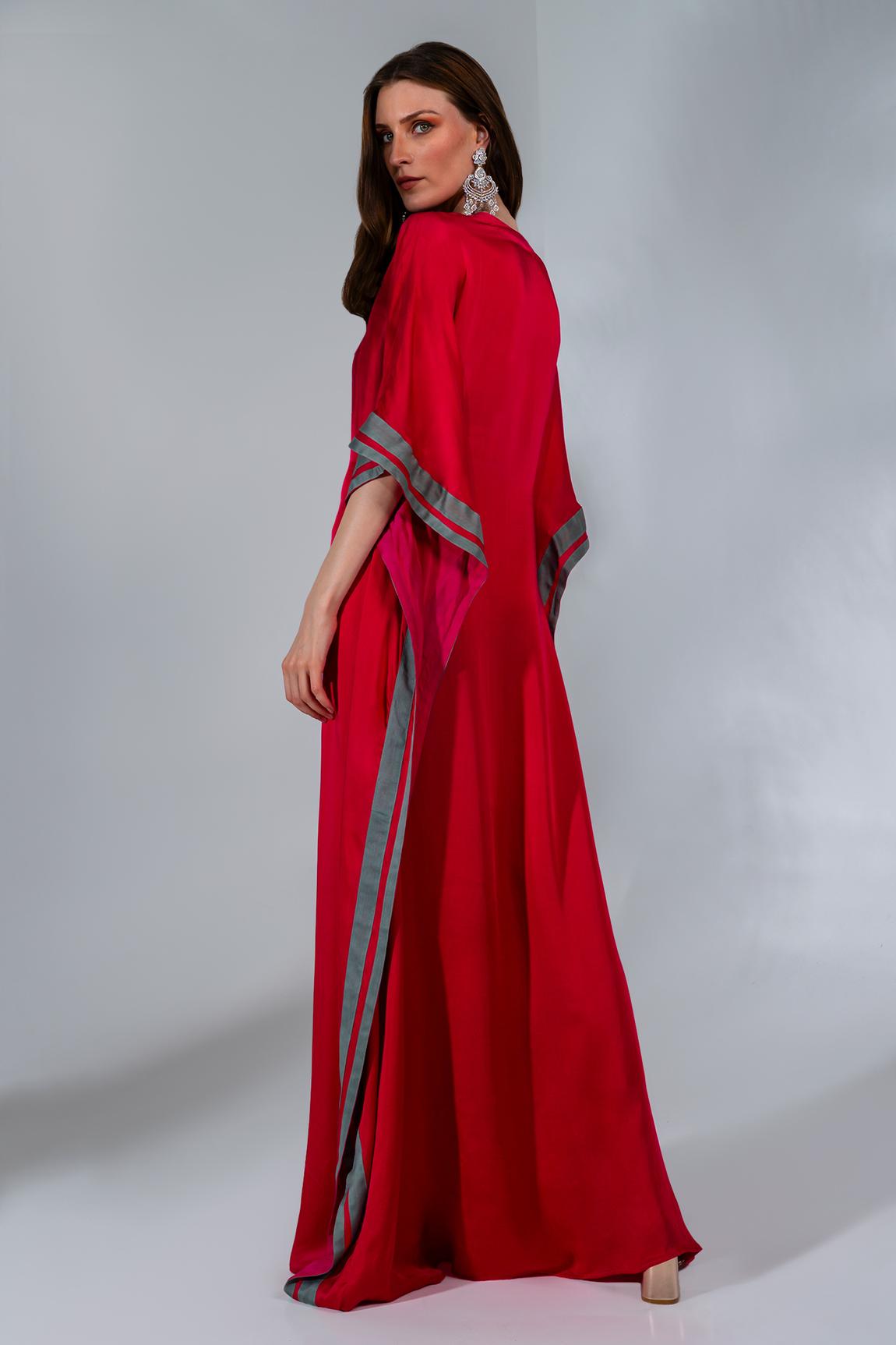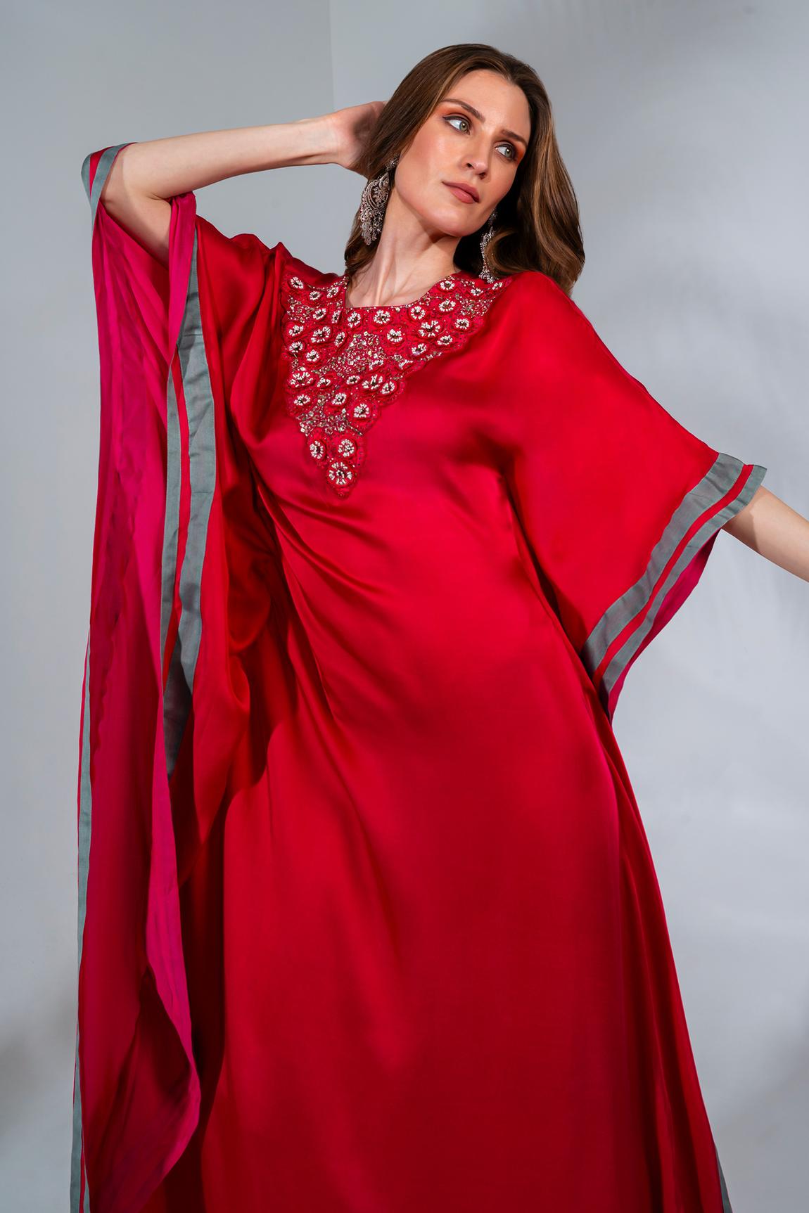 Fuchsia kaftan with sequin, thread and pearl embroidery along the neckline and grey panel detailing at the side.