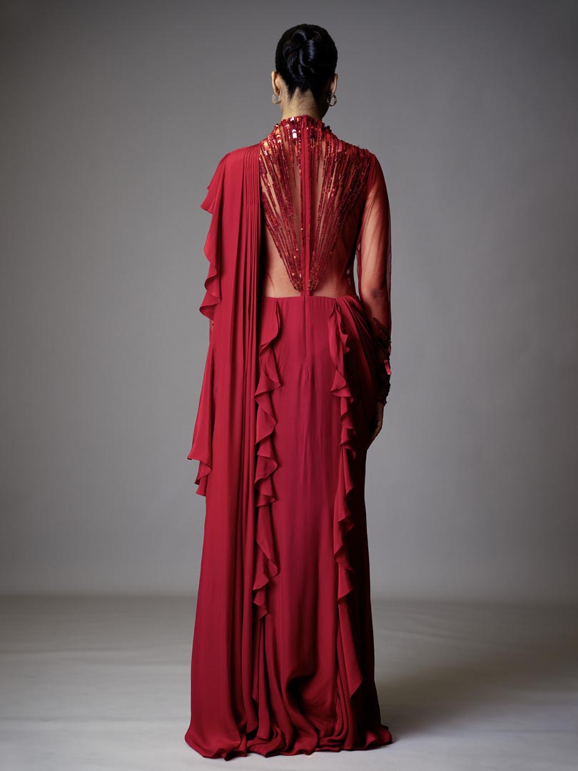 This Abstract Radial Embroidered Ruffled Saree Gown beautifully blends