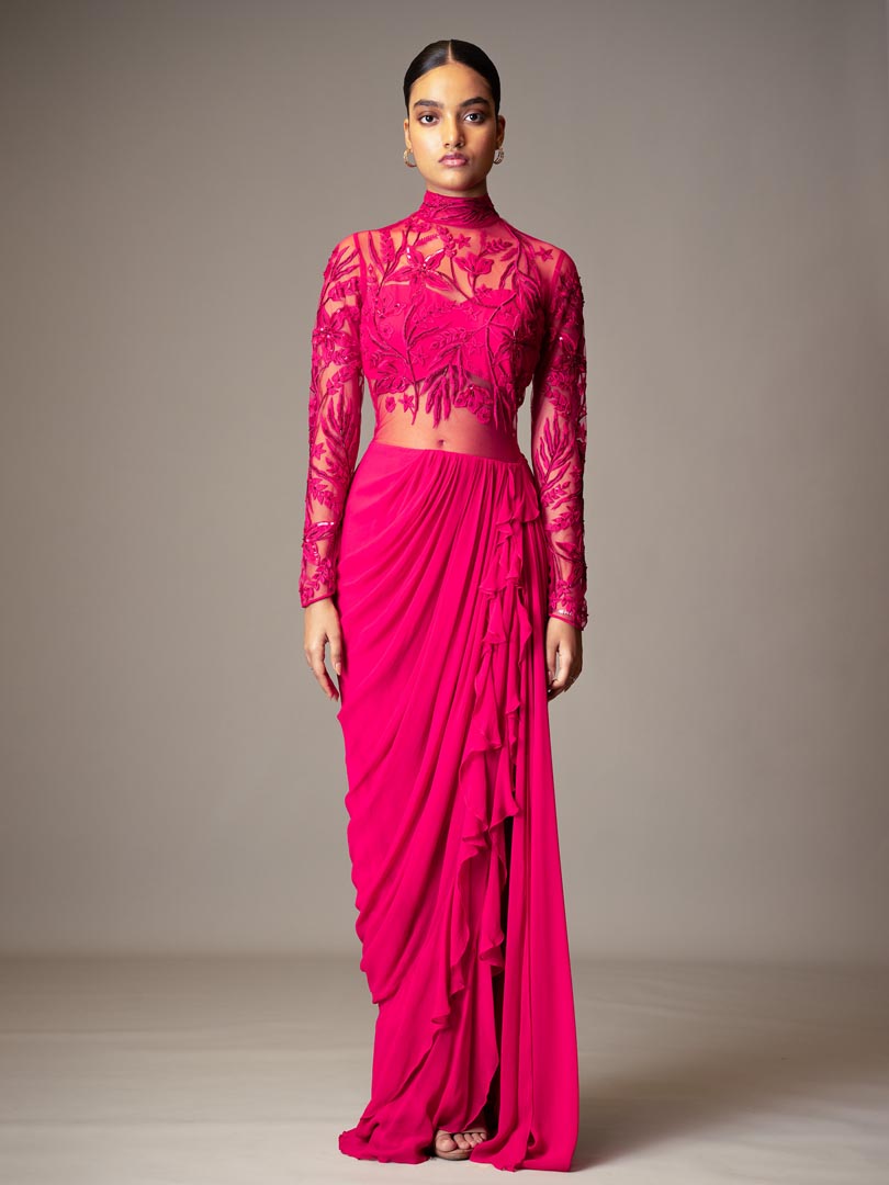 handwork with beads and bugle beads, forming linear and botanical motifs across the sheer base along with a high neckline and long embroidered sleeves.