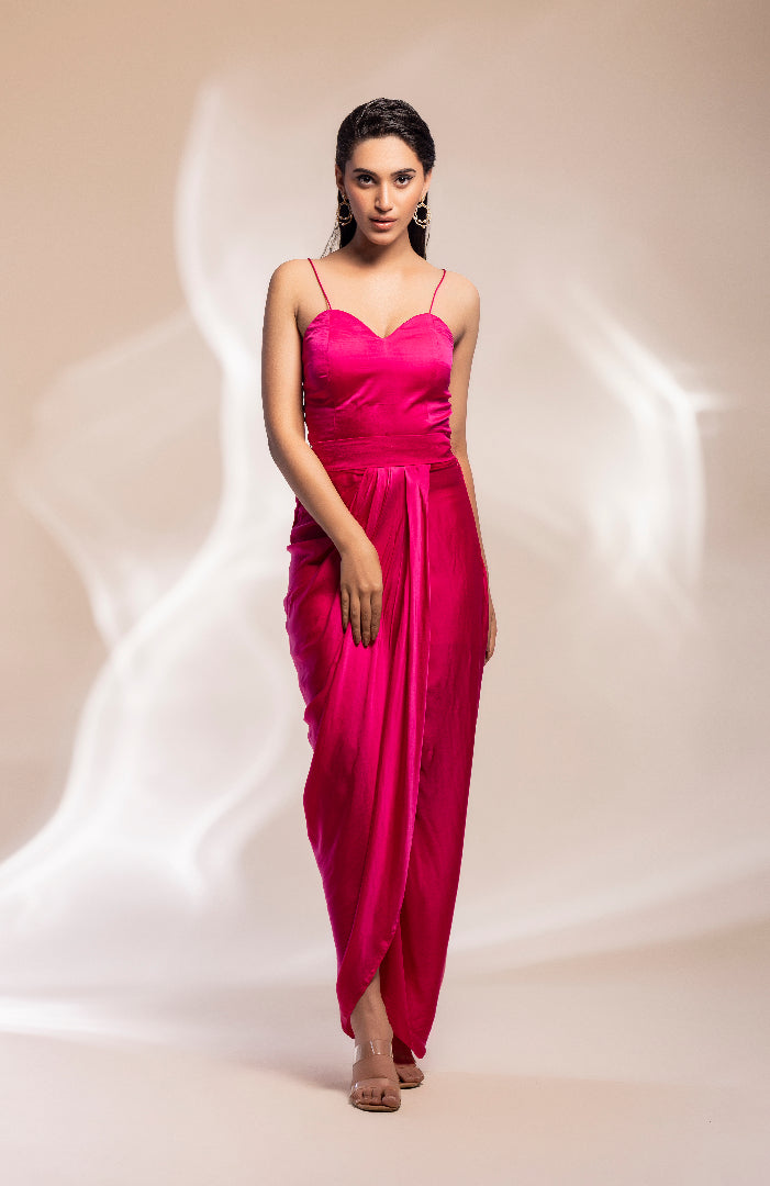 The cape is made of Fuchsia Habutai silk that has an overlay of Champaign organza. The organza overlay is adorned with champaign and Fuchsia tone embroidery of thread, sequin, and beads. The structured floral motif placements on the cape add an element of luxury. The cape is paired with a satin modal dress that is draped at the waist and has a corset structured bodice. The two pieces of the outfit can be worn separately and accessorized to further enhance the look.