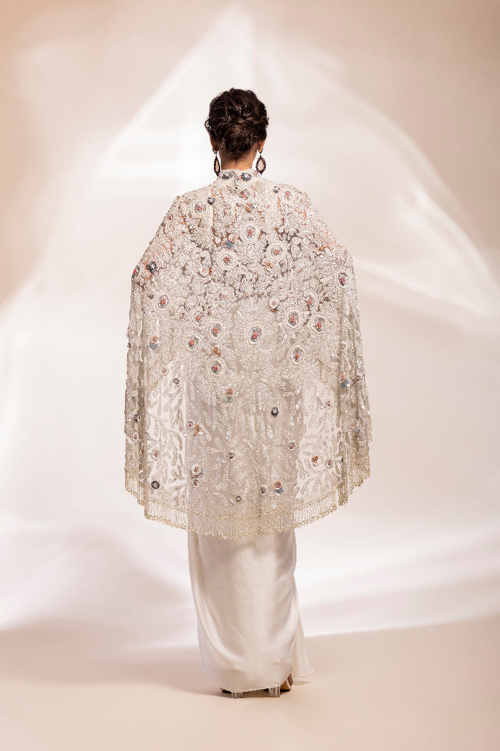 A collared cape and corset in tulle embellished with beads, sequin, and pearls in soft hues of peach,mint, blue, and gold. The shimmery off-white, gold, and silver beads enhance the outfit. The corset,with its part-sheer design and straps, creates a sexy and modern appeal,while the modal asymmetrical drape skirt in modal satin fabric provides a soft and flowing silhouette.