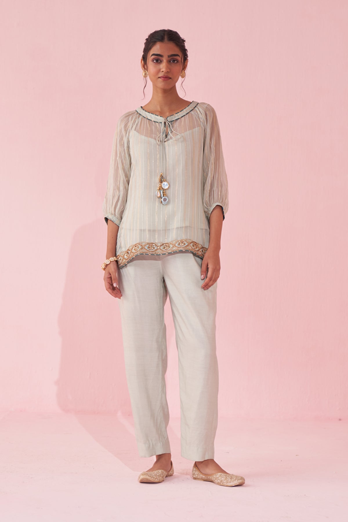 The GAJARA Pale Blue Shirt Pant Set features a soft blue shirt with intricate embroidery, paired with narrow pants for a sleek, modern look. Ideal for casual or semi-formal events.