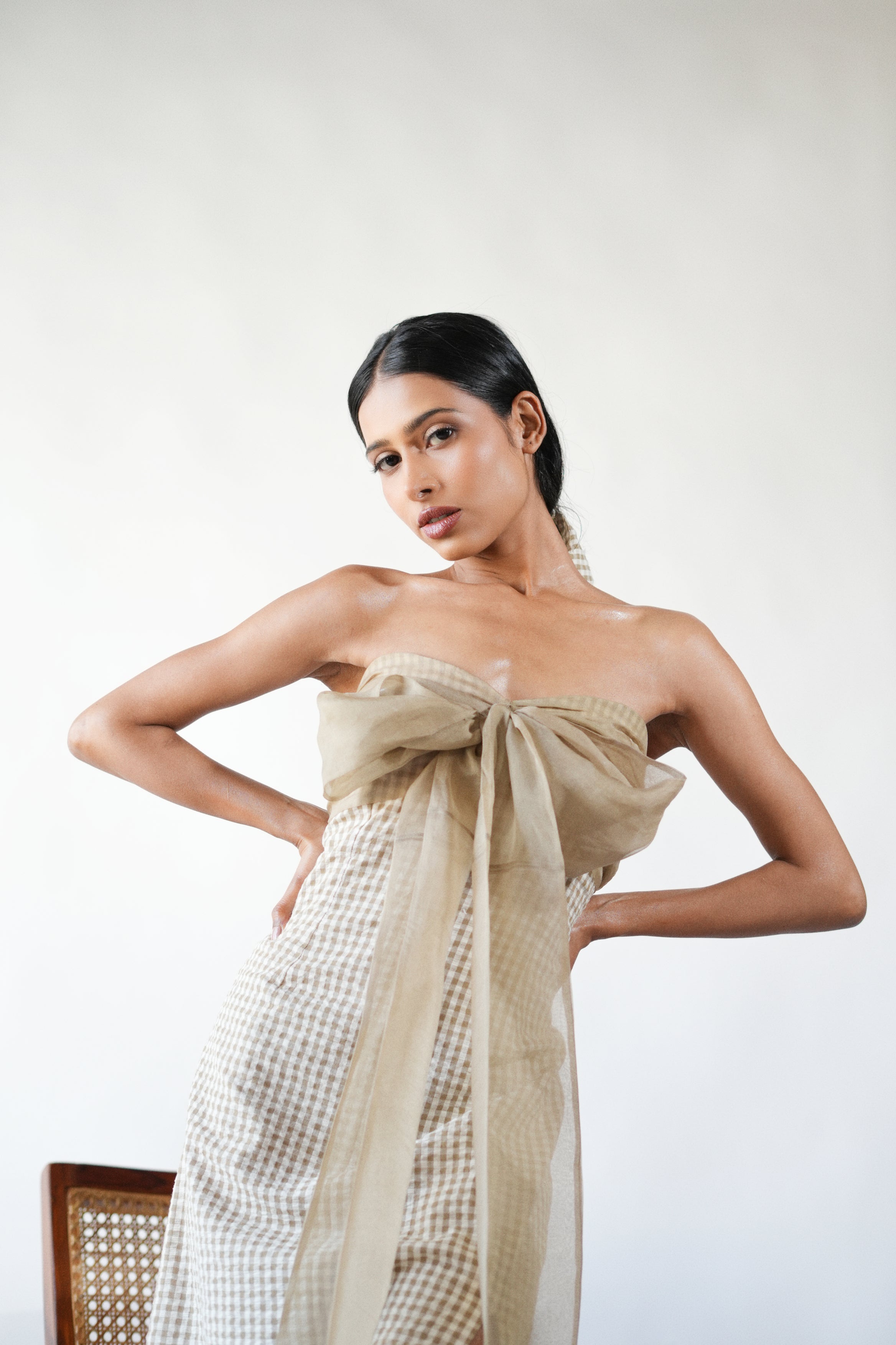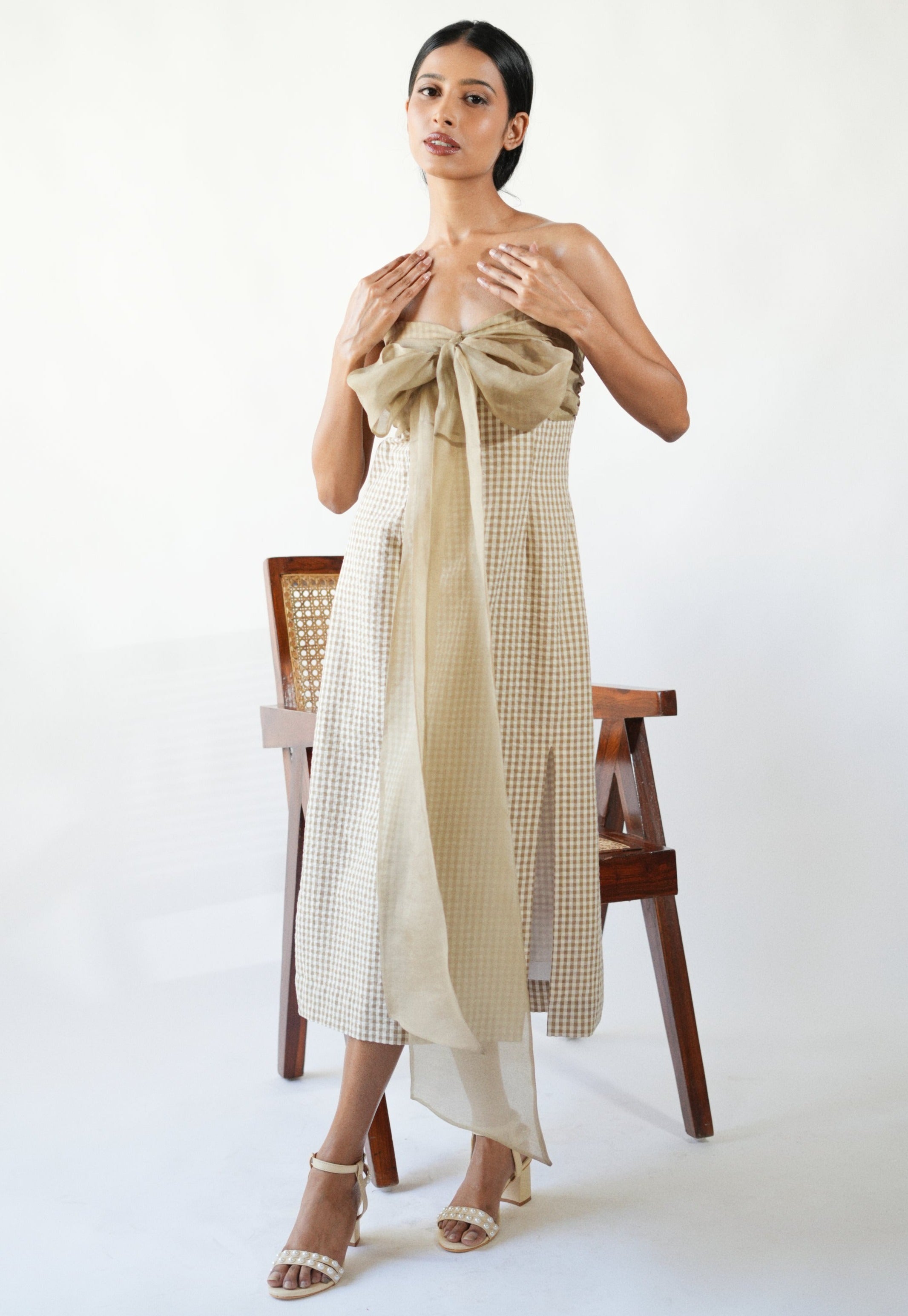 Our Checkered Knot Dress is a chic statement, featuring a stylish knot detail that can be fashioned into a charming bow with delicate frills. Ideal for those seeking effortless sophistication with a touch of playful elegance.