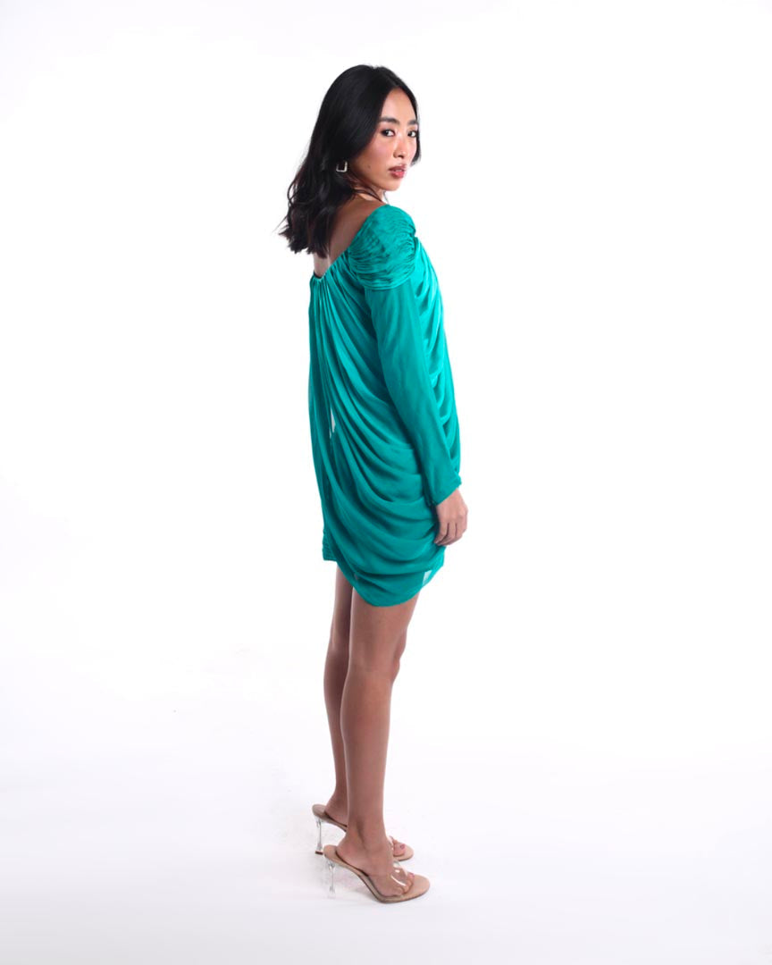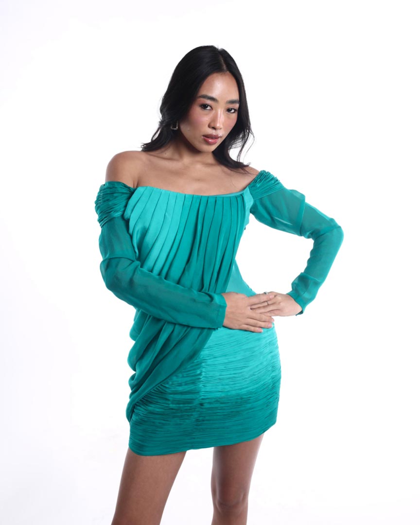 The Gemma dress is a standout mini that plays with contrast and movement. Featuring an off-shoulder neckline, accordion pleated bodice, and ruched draped skirt, this dress sculpts the body while maintaining a soft, fluid silhouette. The sleeves fall just right, adding elegance to its bold, playful shape. Done in a vivid emerald green, a show-stealer from every angle.