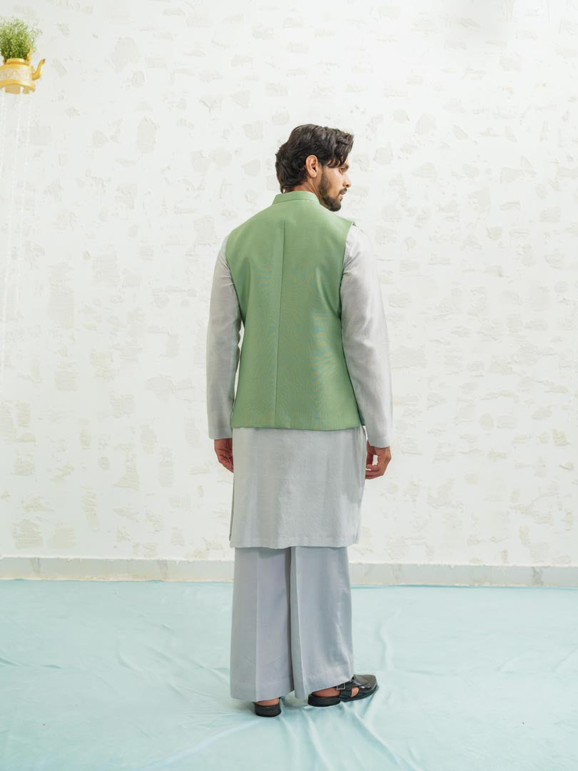 A light green bundi paired with a classic grey kurta pajama. The bundi tailored to perfection, features a clean mandarin collar and minimal geometry embroidery that enhances its elegance without overpowering the look.