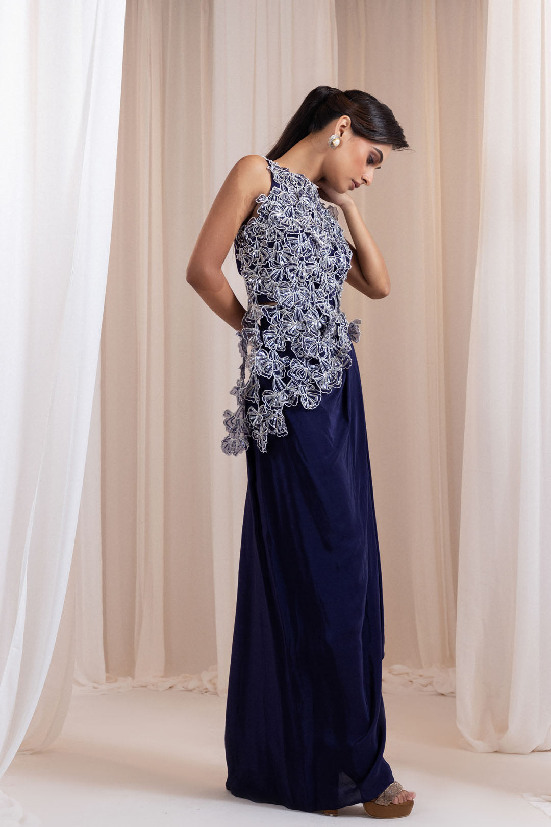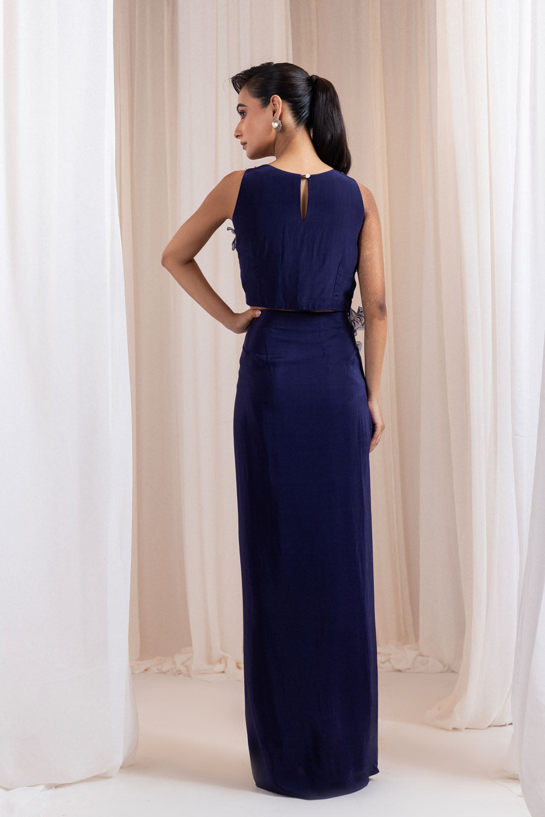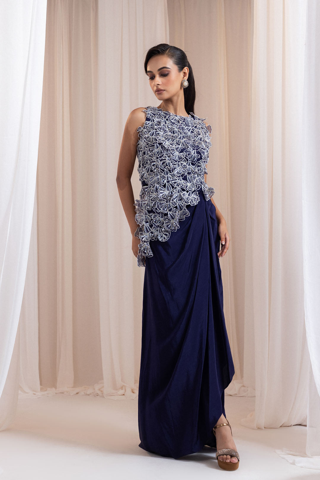 A two-piece set in deep indigo blue, featuring a top adorned with 3D floral work and asymmetrical organza appliques, richly embroidered in metallic silver. The knot-drape skirt adds depth and texture with a sculpted finish. A soft sheen runs through the fabric, enhancing its after-dark elegance. Perfect for dinners, cocktail hours, and intimate festive moments.