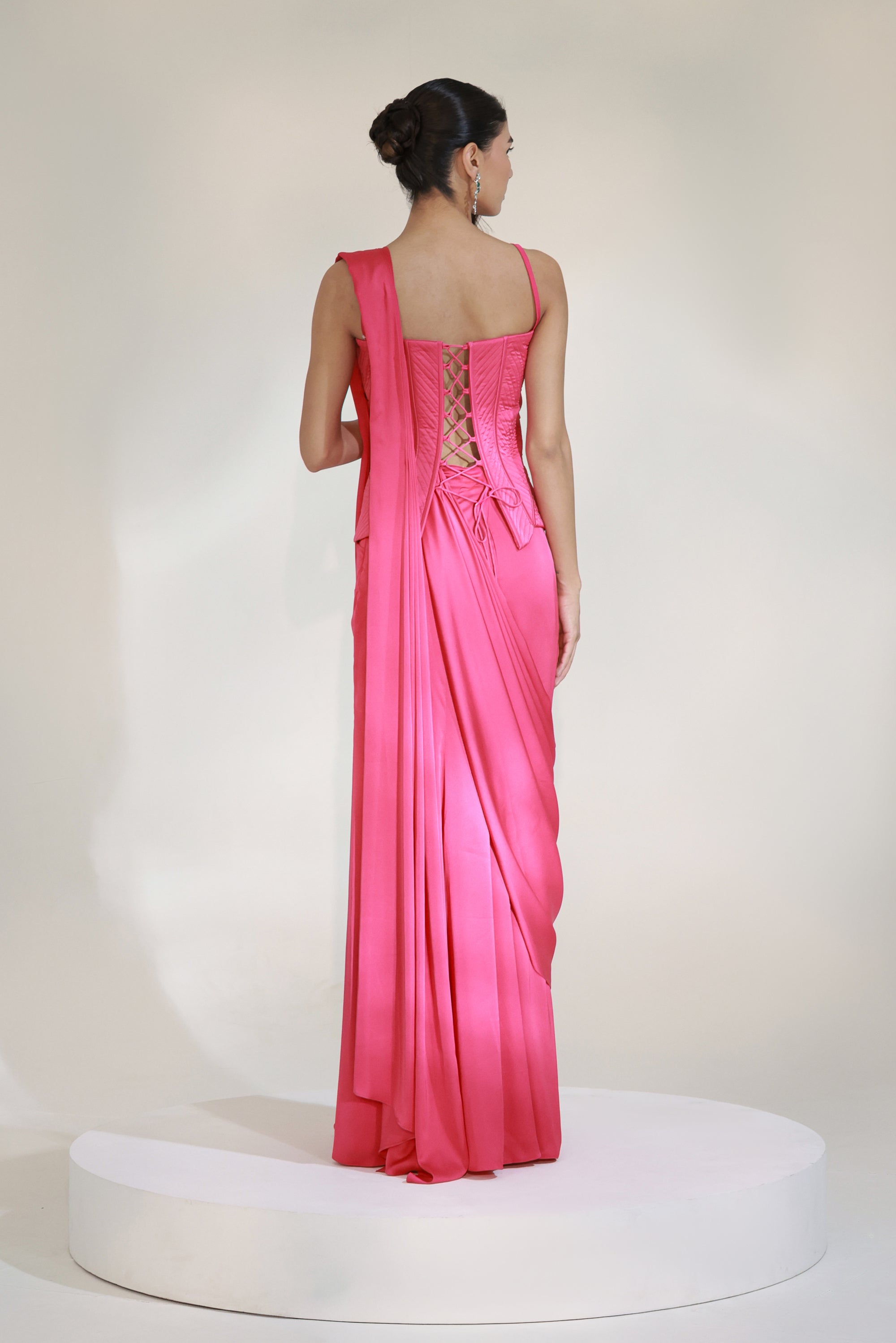 Command the spotlight in our PINK Corset Saree — a sculpted silhouette that marries structure with fluidity. Designed in luxurious fabric, the corset contours the body with precision, while the pre-draped saree cascades effortlessly for a modern, yet timeless appeal. With refined gathers and a cinched waistline, this ensemble is your go-to for elevated celebrations and unforgettable entrances.