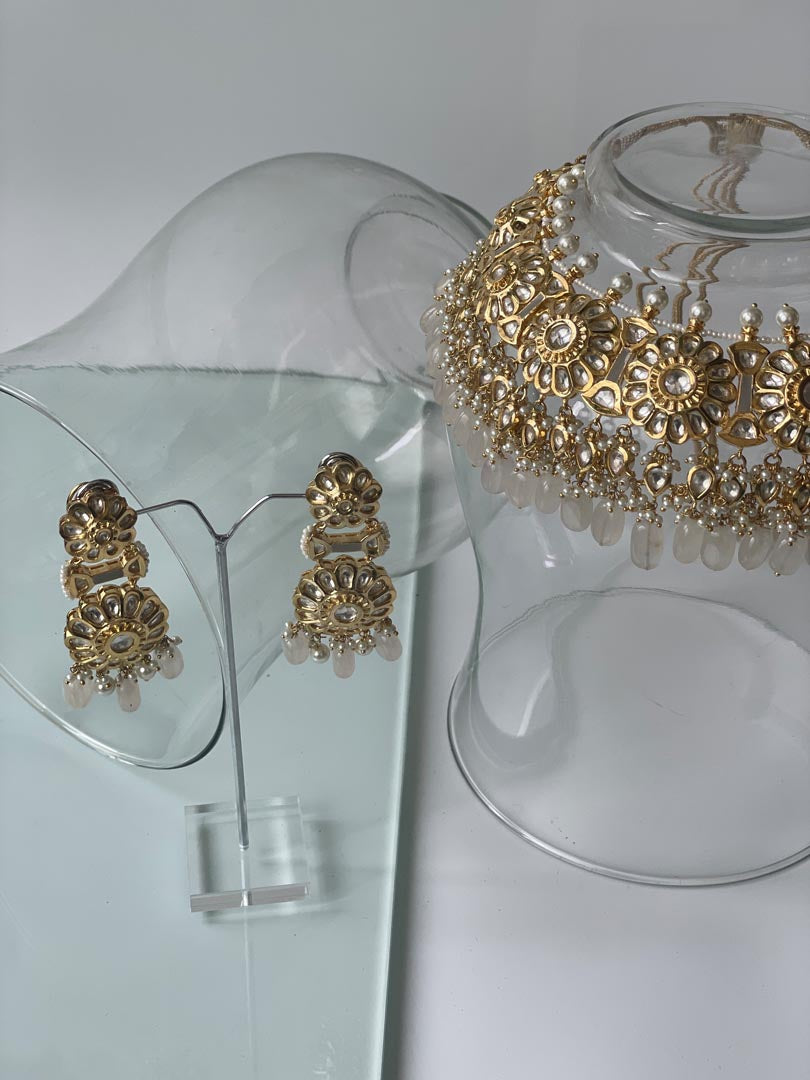 Gold Finish Kundan Necklace Set with Blush Pink Drops , Necklace L :3, W: 10.6
