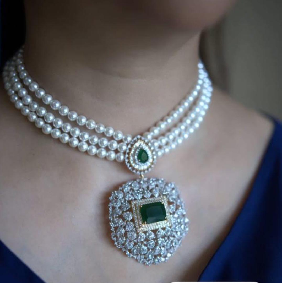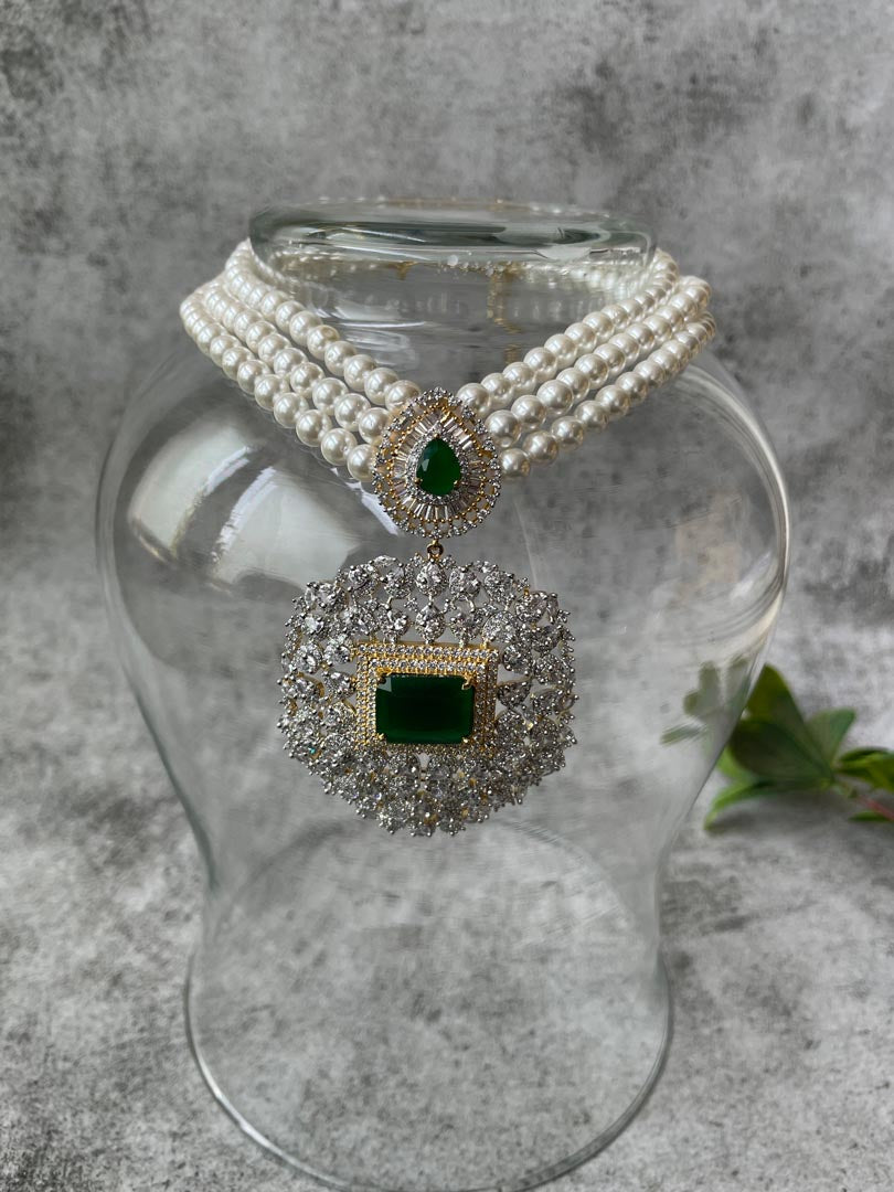 Gold Finish Pearl Strand Necklace with Zircon Motif and Green Center Stone , Necklace: L: 8.4, W: 0.4