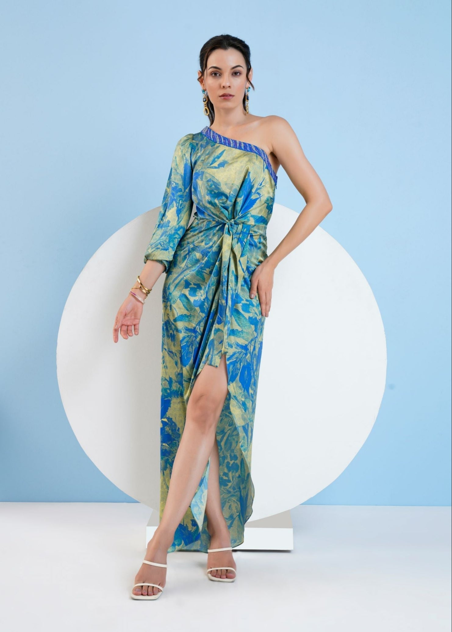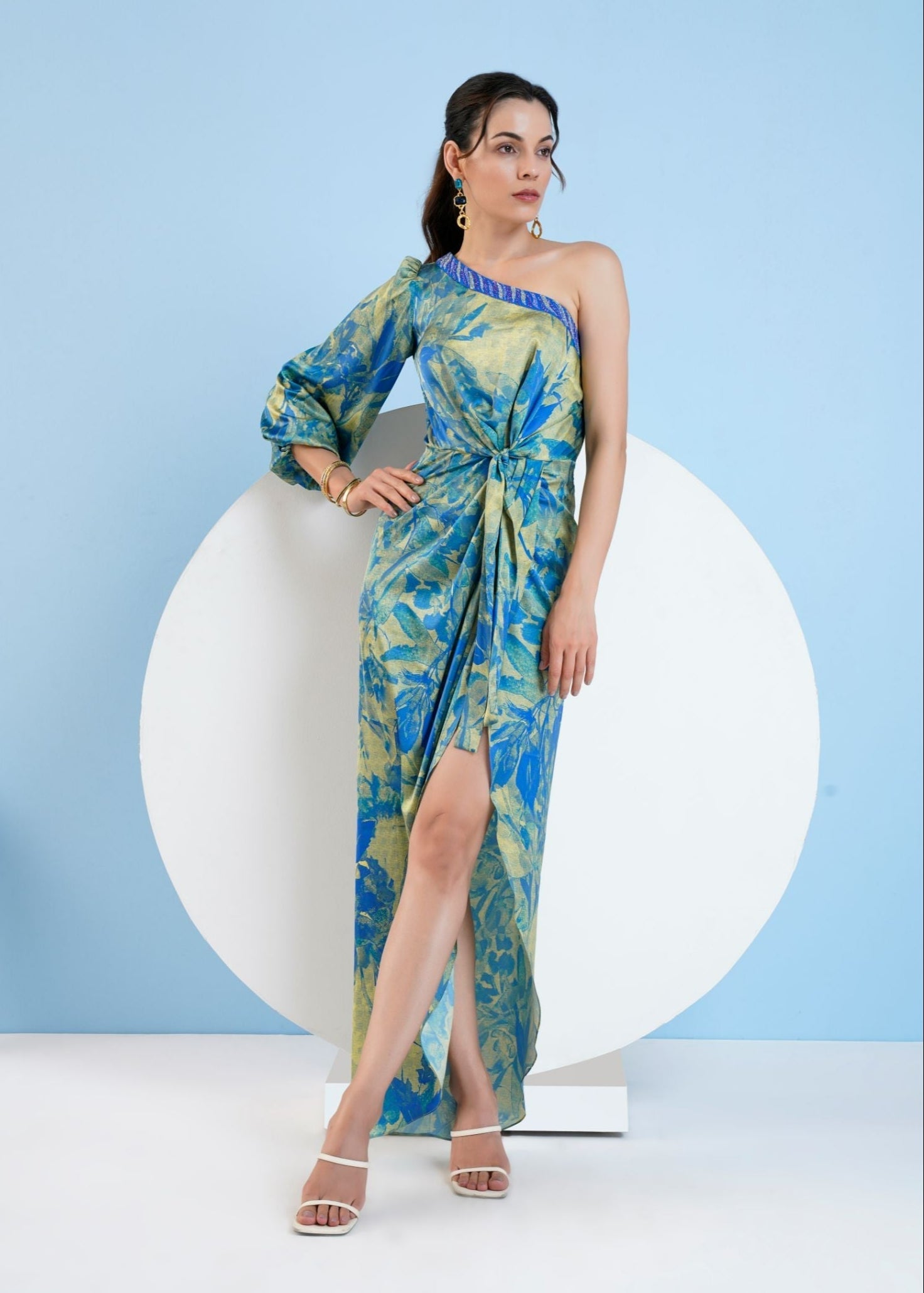 Featuring gold foil botanical foliage printed one shoulder calf length dress with knot detail at waist.