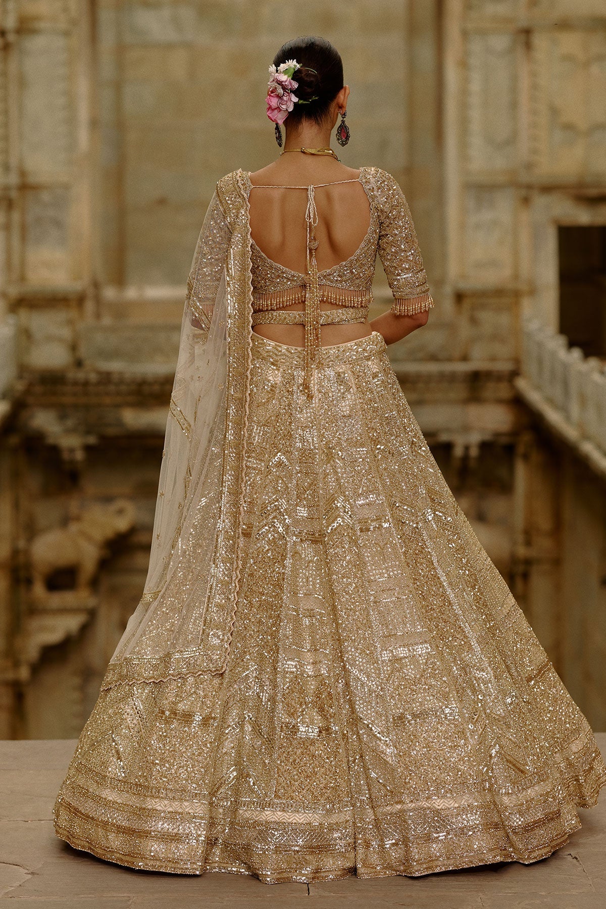 Gold lehenga set beautifully embellished with crystals, sequins, and cutdana work.Paired with an optional veil for an added touch of elegance.