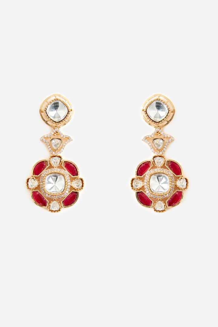 This exquisite jewelry set features a statement necklace with matching earrings, adorned with intricate gold detailing, red gemstones, and sparkling stones, perfect for weddings or festive occasions.
