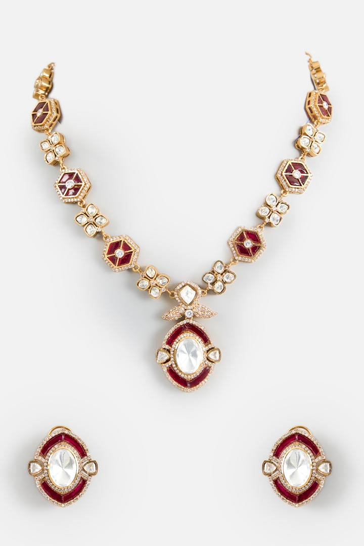 Elegant gold-toned necklace set with oval polki stones, pink accents, and matching earrings. Perfect for weddings, festive occasions, and timeless statement style.