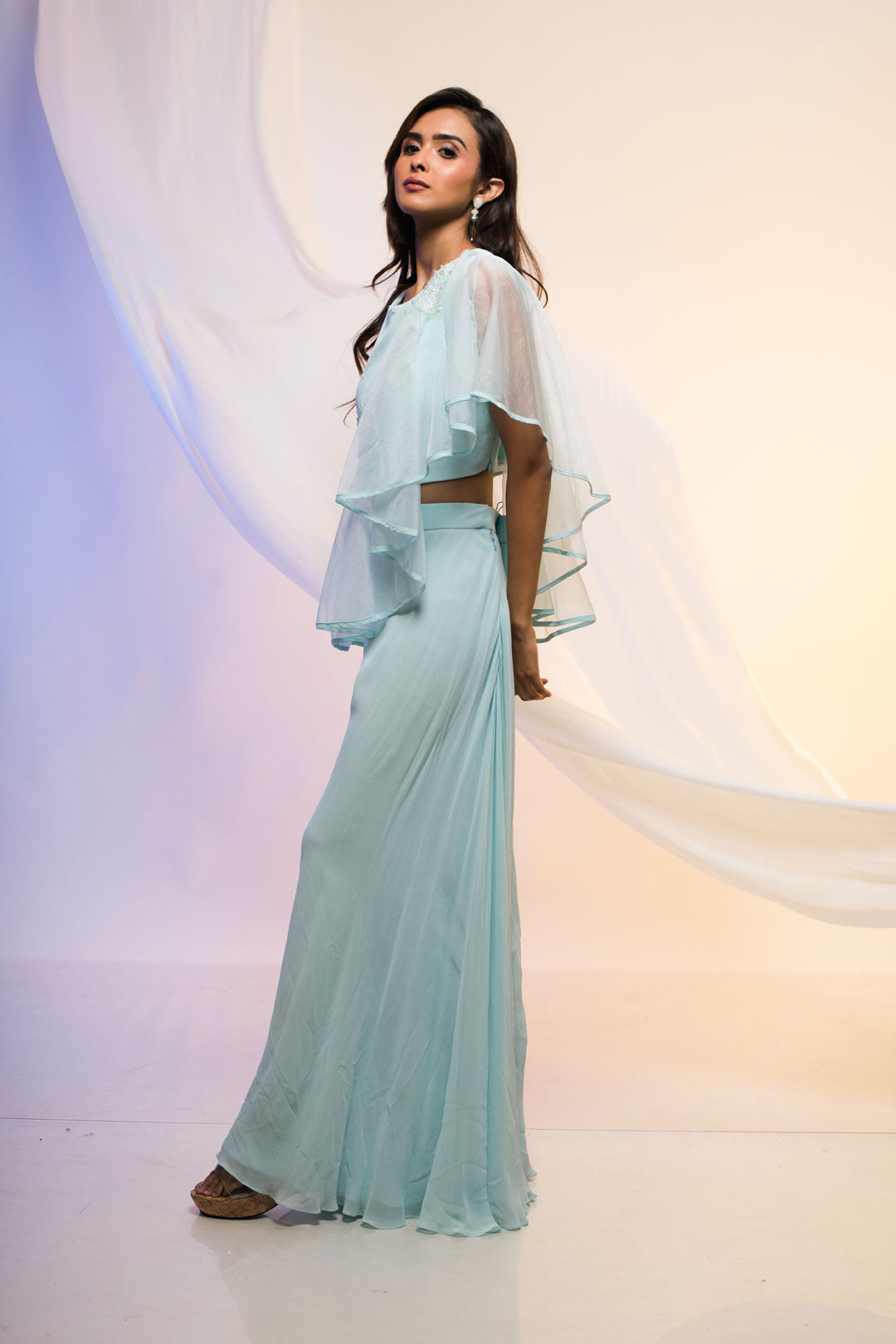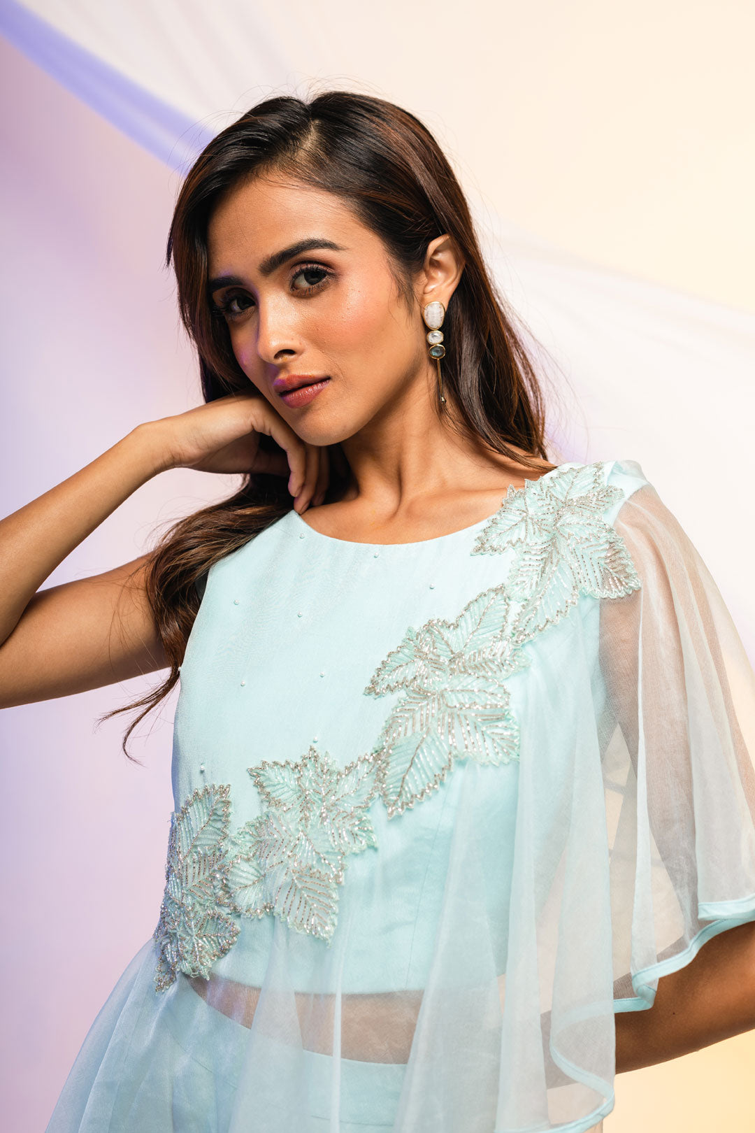 Arctic Blue One-sided Ruffled Crop Top, Adorned With Leaf-shaped Bootas , Paired With Flared Pallazo Pants.