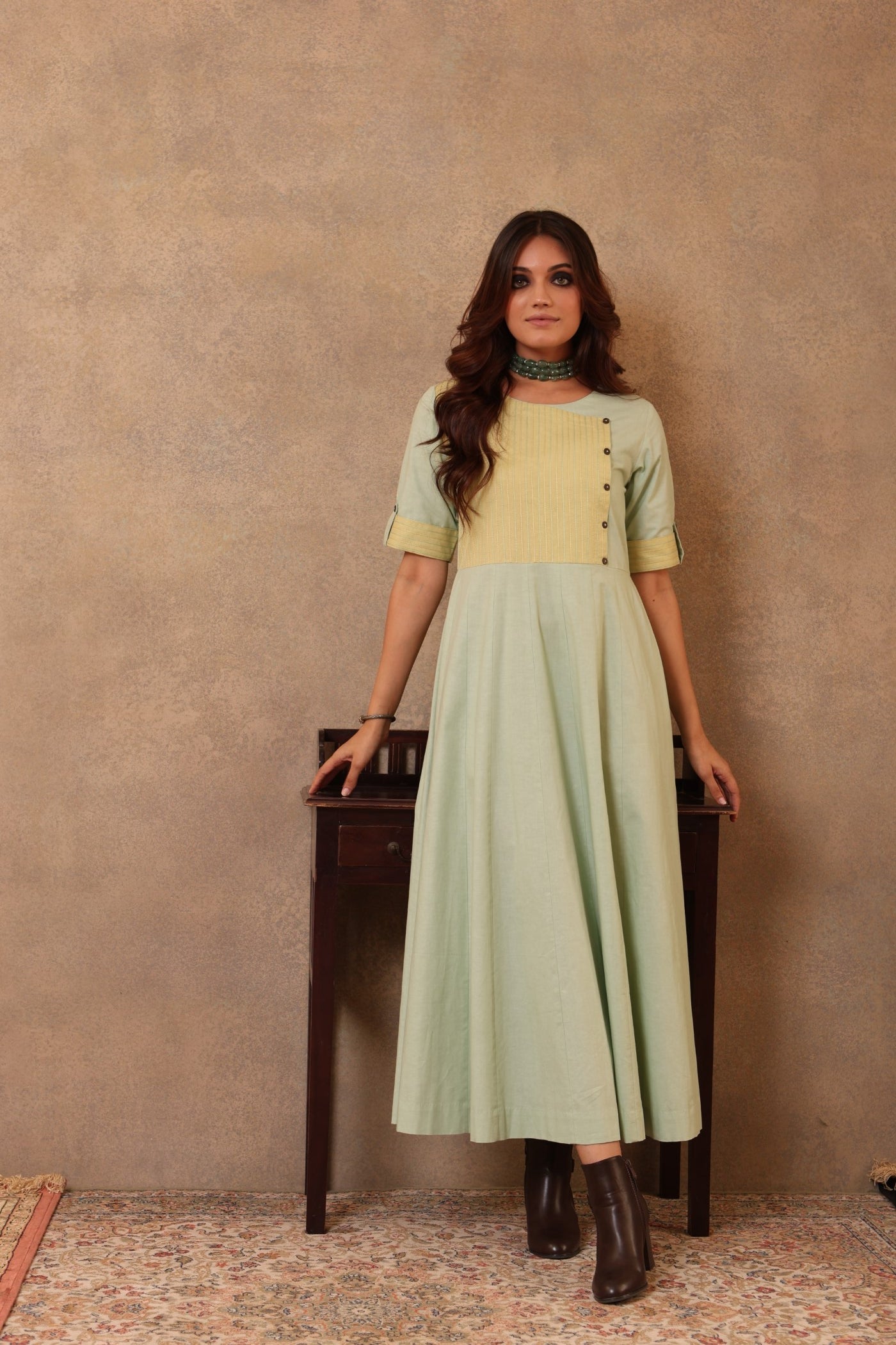 Green & Lime Pure Linen-Cotton Long Dress With Threadwork Detail & Upturned Cuffs